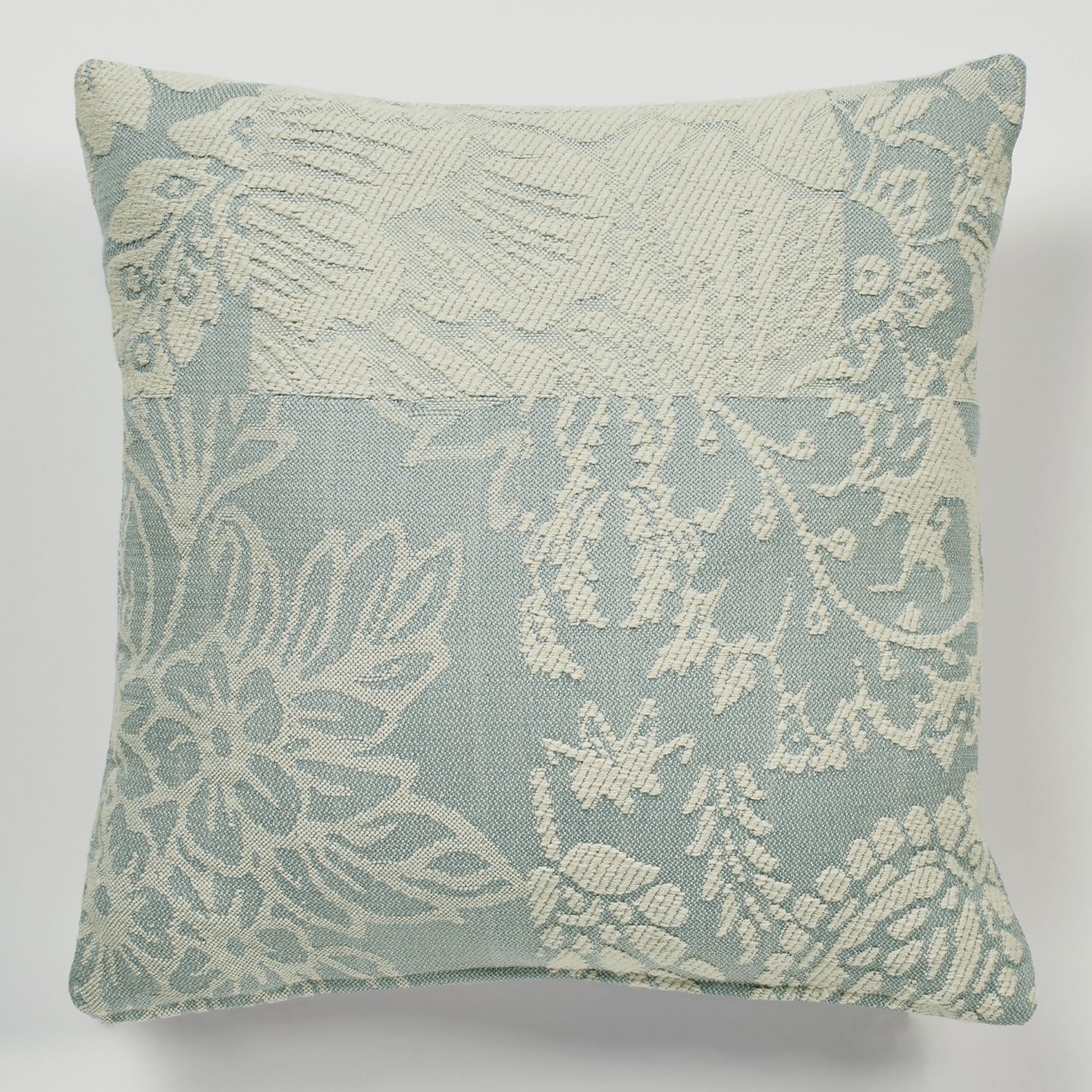 Blocks of jacquard-woven flowers, paisley, and floral medallions bloom in elegance on the Masionette Decorative Pillow. This cotton/polyester pillow features an antique look in ivory along with spa or taupe. The tailored, reversible pillow, 18", has a hidden zipper closure. Fill is polyester. Spot clean. Imported.