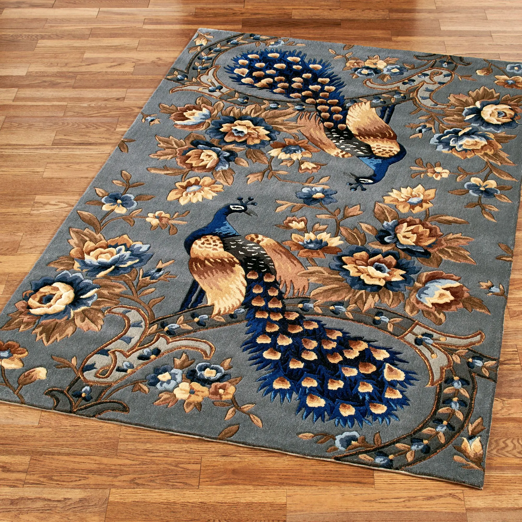 The Majestic Peacock loves to surround himself with true beauty, just as he does within this intricate, slate gray area rug. Hand-tufted and -carved, this .5" thick wool rug features two regal peacocks sitting on stylized branches among intriguing blooming florals on a solid slate gray field; the 2'6"x4'2" rug has one peacock. Other colors include shades of blue, gold, copper, buff, cocoa, midnight blue, vanilla, black, and gray. Peacock rugs are backed in cloth-covered latex. Design may vary by size. We recommend professional cleaning by a rug cleaner. Imported.