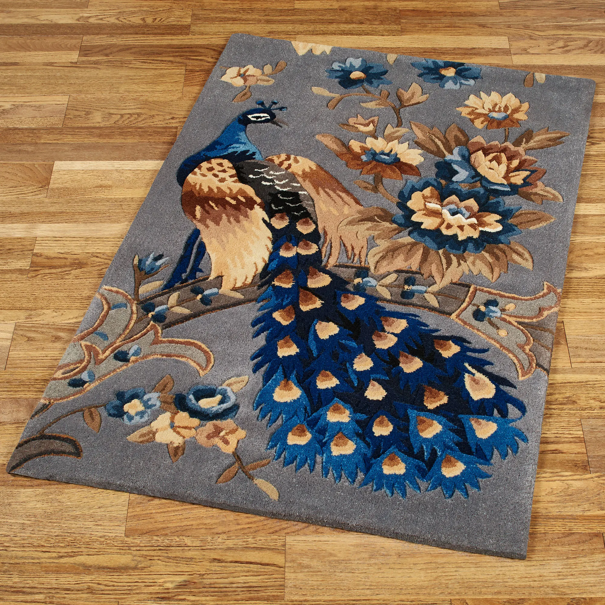 • Peacock rugs are hand-tufted and -carved