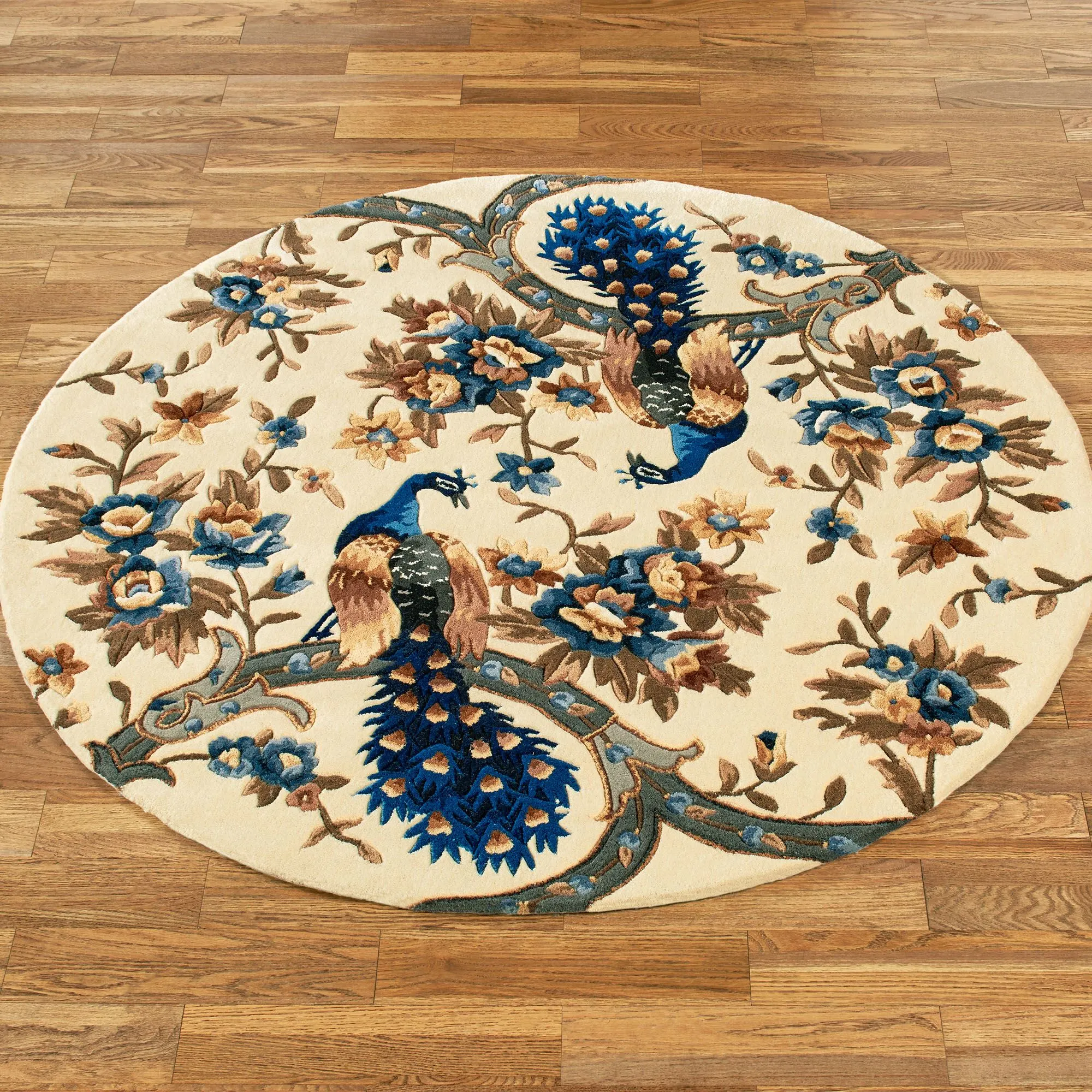 • Peacock rugs are hand-tufted and -carved