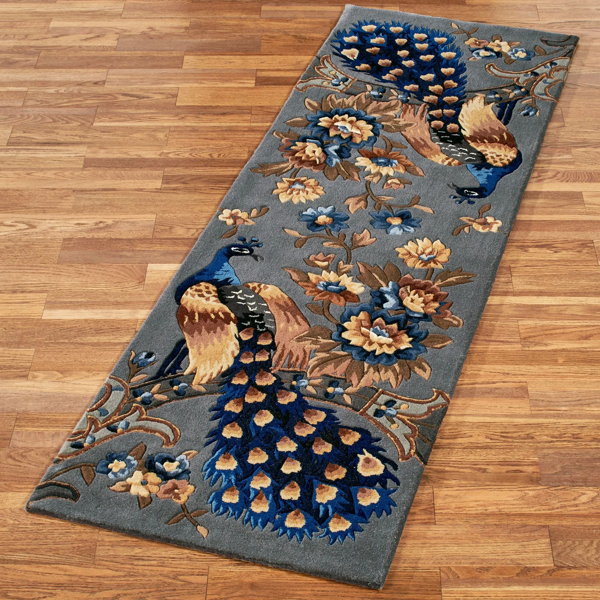 The Majestic Peacock loves to surround himself with true beauty, just as he does within this intricate, slate gray rug runner. Hand-tufted and -carved, this .5" thick wool rug features two regal peacocks sitting on stylized branches among intriguing blooming florals on a solid slate gray field. Other colors include shades of blue, gold, copper, buff, cocoa, midnight blue, vanilla, black, and gray. Peacock rug runner is backed in cloth-covered latex. We recommend professional cleaning by a rug cleaner. Imported.