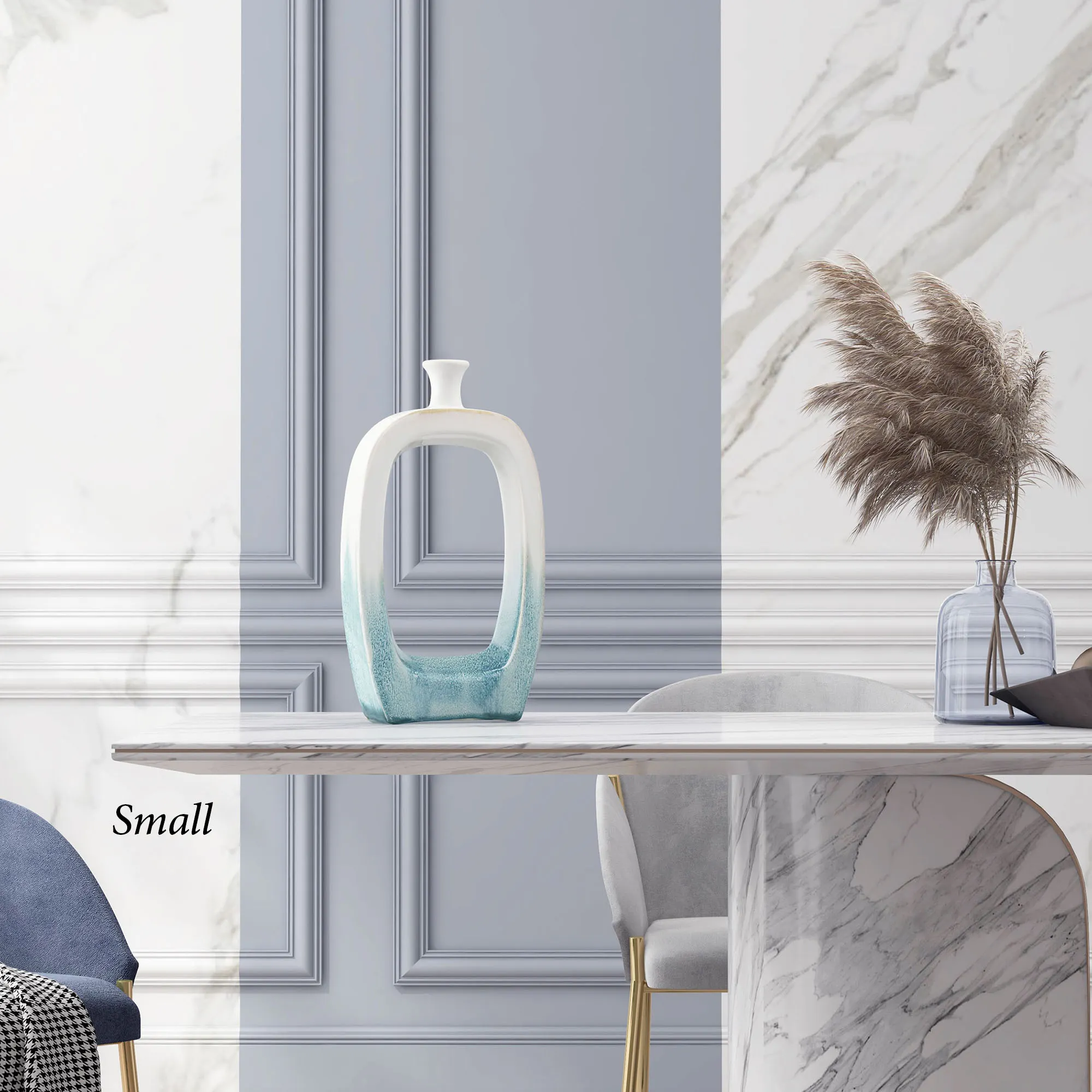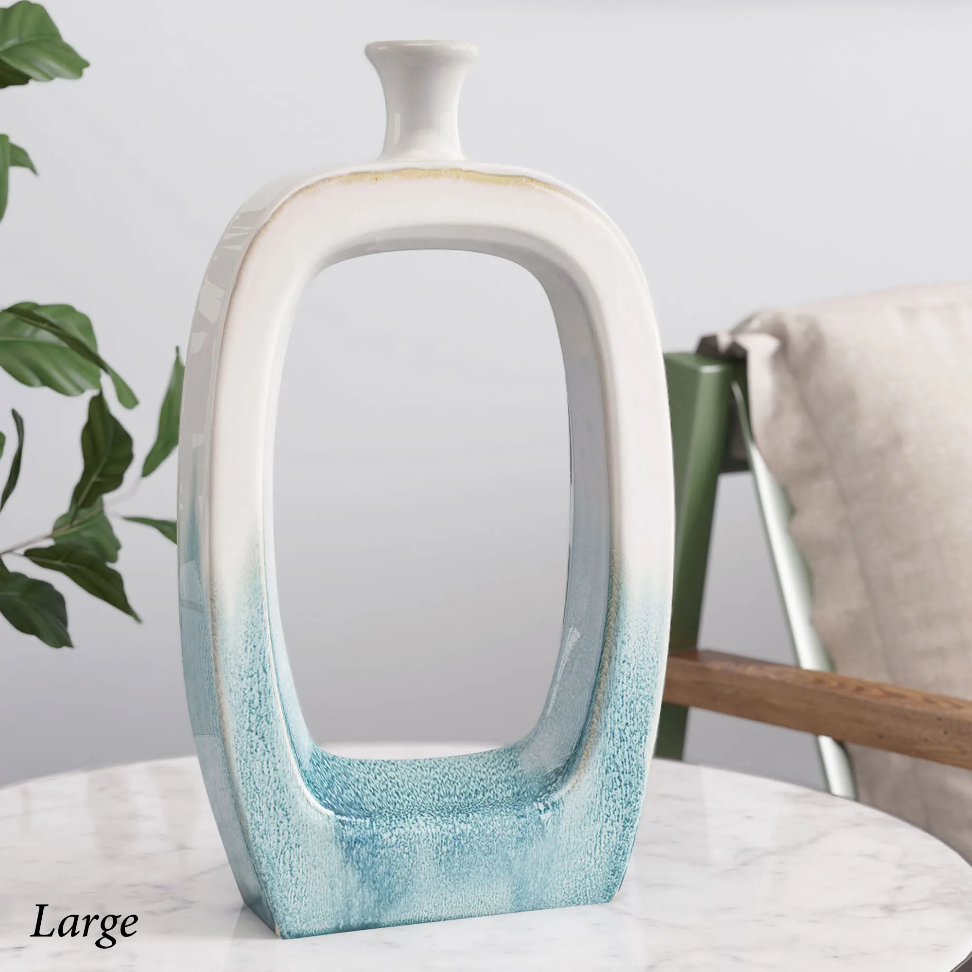 Everyone will absolutely love the abstract look of the Makara Decorative Vase. This openwork ceramic vase has an ombre finish with a glossy glaze. The top is white and blends to aqua at the bottom. The hollow-shaped vase has an opening of 1.5" dia. For decorative use only. The Small vase is 8"Wx3"Dx14"H. The Large vase is 10"Wx3"Dx18"H.