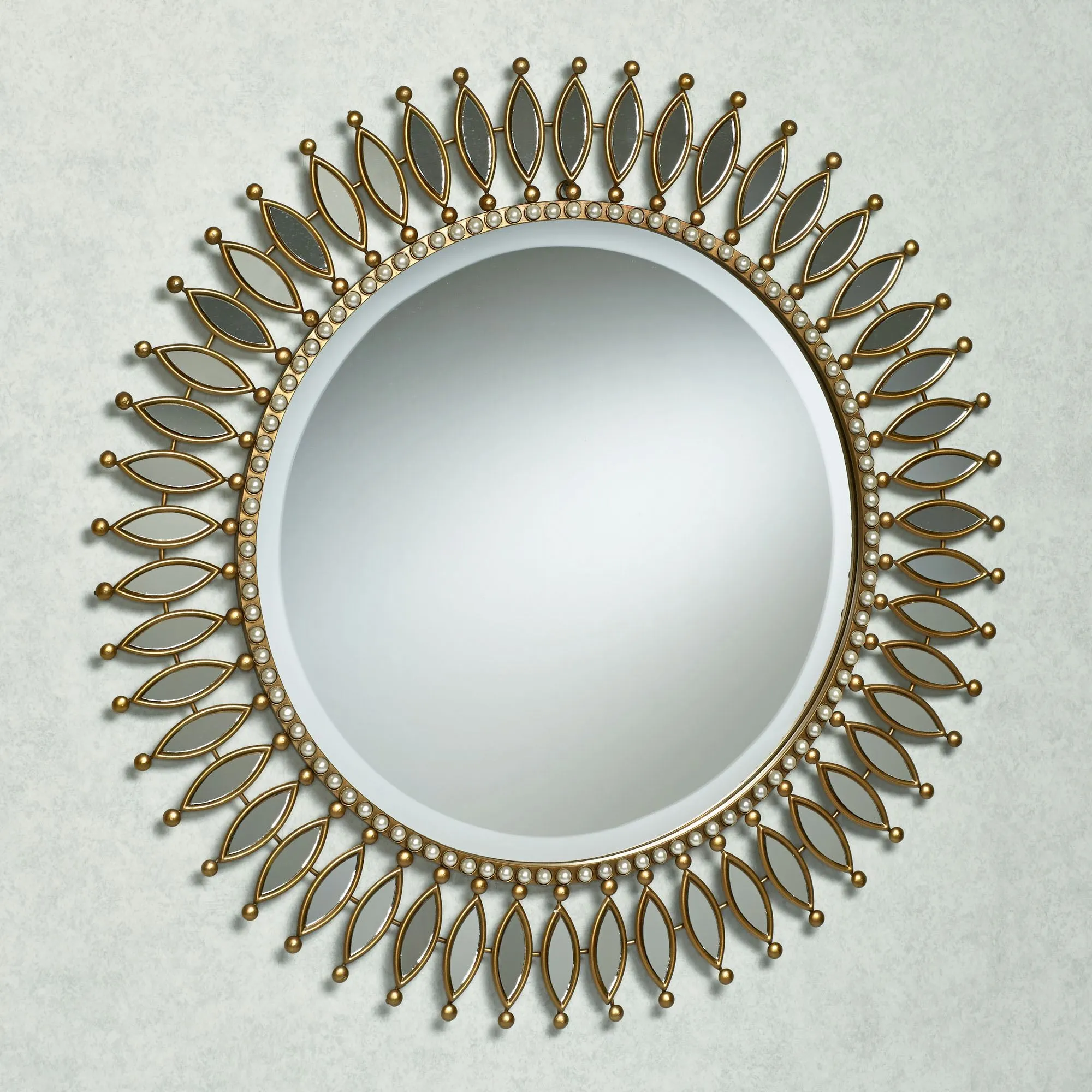 The Makayla Round Wall Mirror resembles a pearl-accented sun, reflecting your gorgeous home to add further depth and beauty to your entryway, bedroom, or favorite space. Made of golden metal, this wall accent has a center 17" dia. beveled circular mirror, trimmed with pearls. The inner border is surrounded by smaller petal-like mirrors with gold ball accents. Measures 26"dia.x1"D overall.
