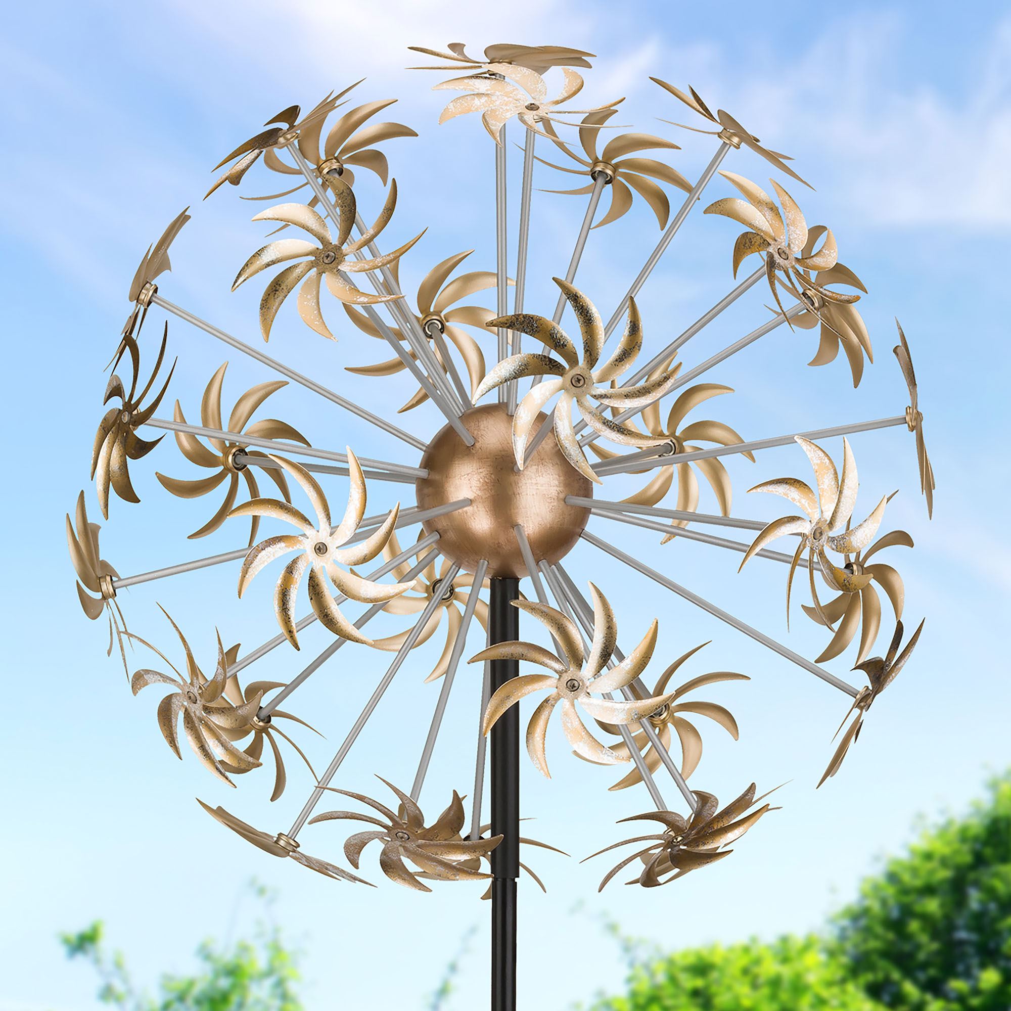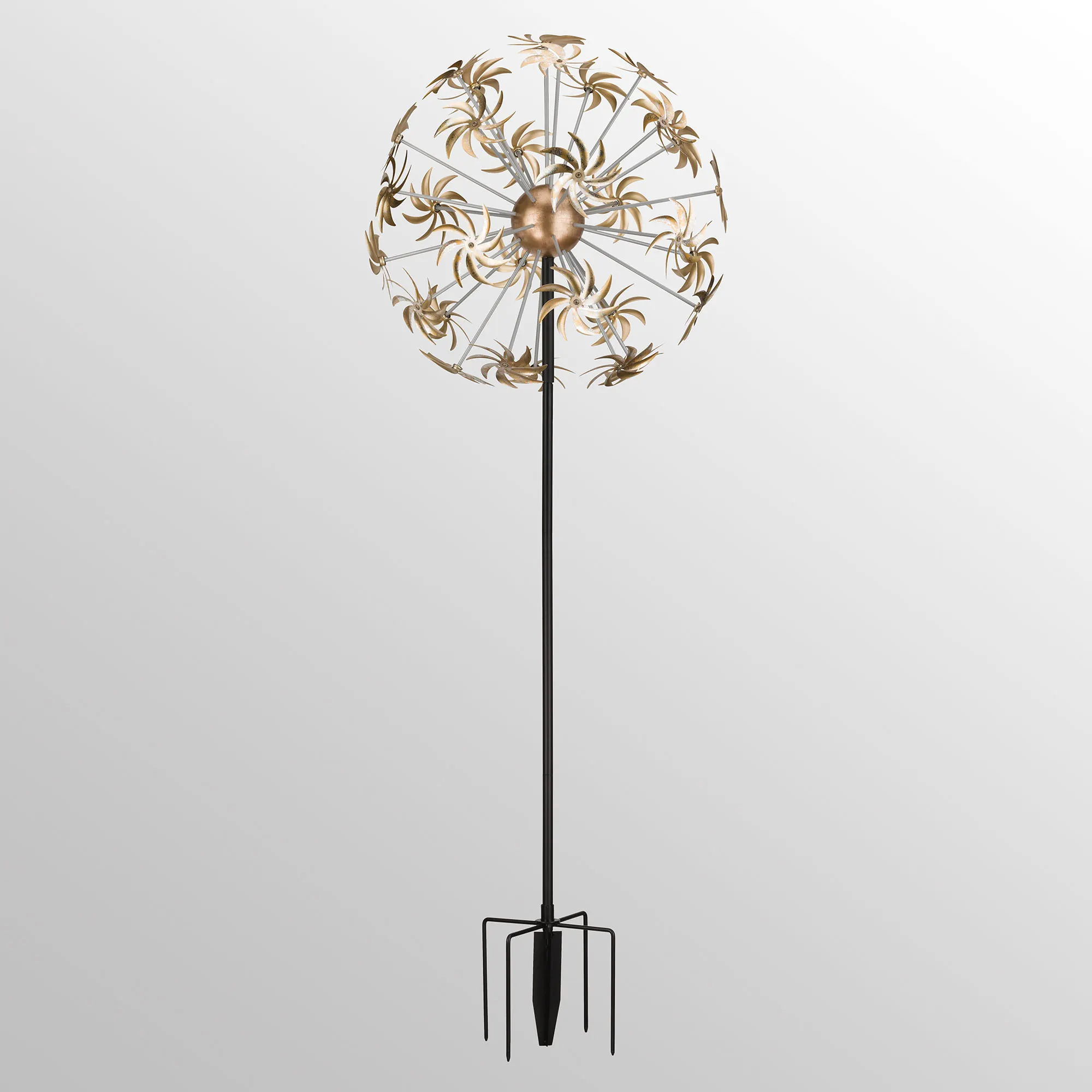 It is super easy to Make a Wish with this spectacular wind spinner. Made of metal with a powder-coat finish, this wind spinner has weather- and fade-resistant paint and dandelion seed pod designs. A strong and stable five-prong stake is included. Outdoor year-round use. Measures 28"dia.x82"H including the stake; weighs 17 lbs.