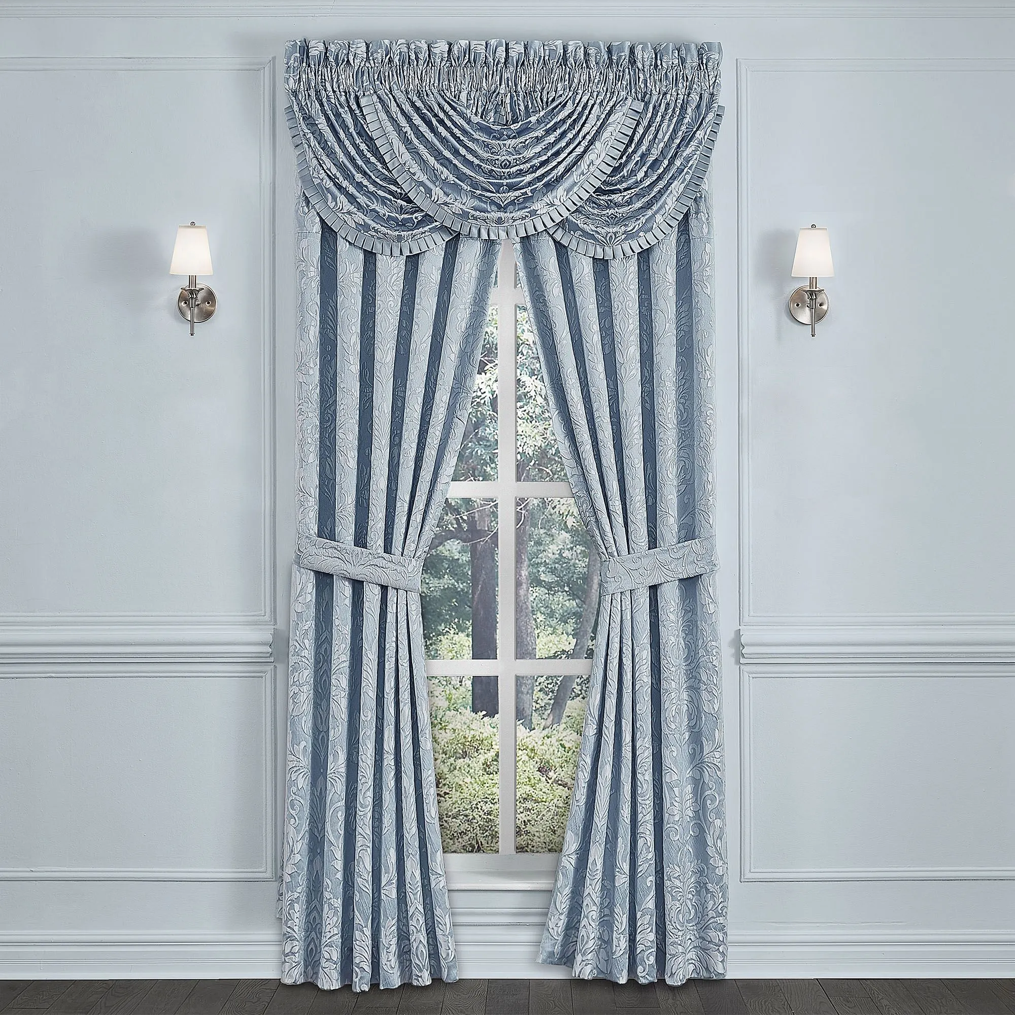 Window Treatments have woven damask designs. The lined Wide Curtains have tailored edges and include tiebacks. Rod pocket is 3". Each Waterfall Valance has a pleated flange on the bottom edge. Rod pocket is 3.25". We recommend one valance for every 12"-15" of window width.