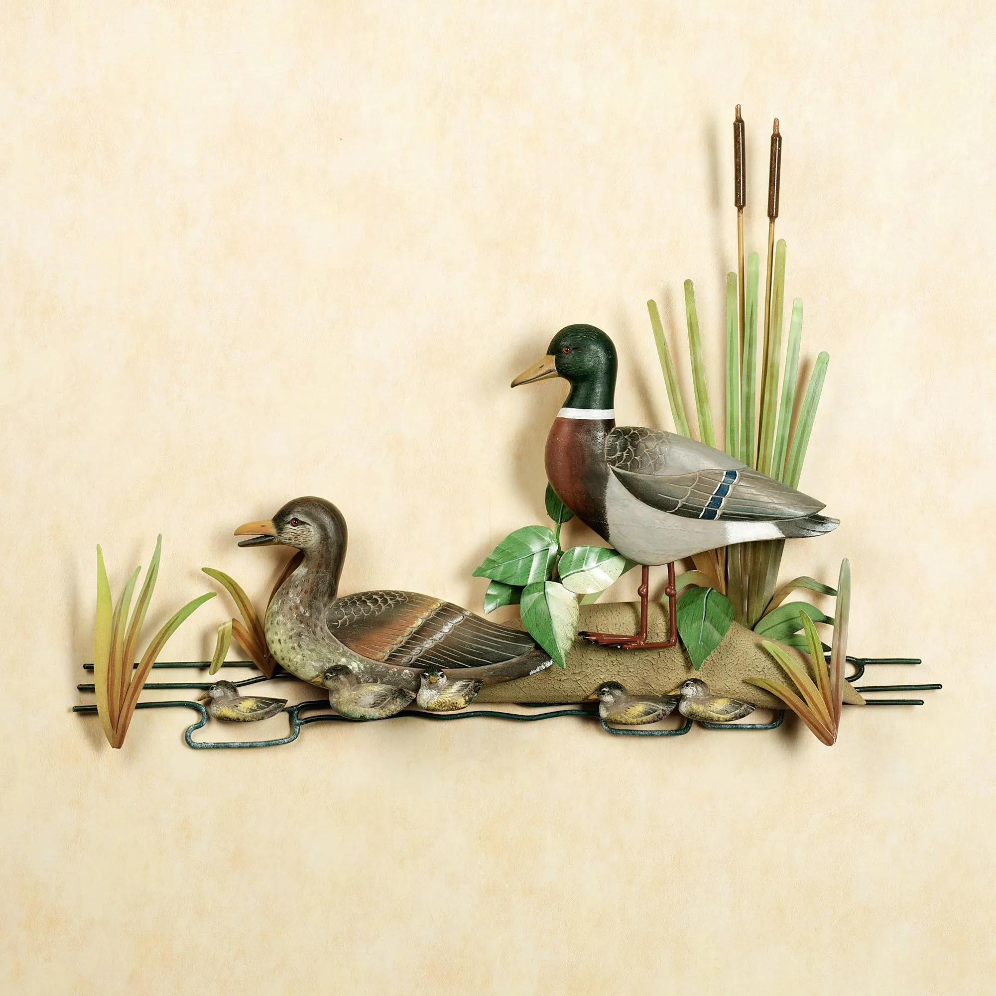 The wooden and metal Mallard Duck Family Wall Sculpture is handcrafted. Rustic-themed wall art features an entire family of mallards in a marshy habitat of water, sand, cattails, leaves, and grass. 29"x23".