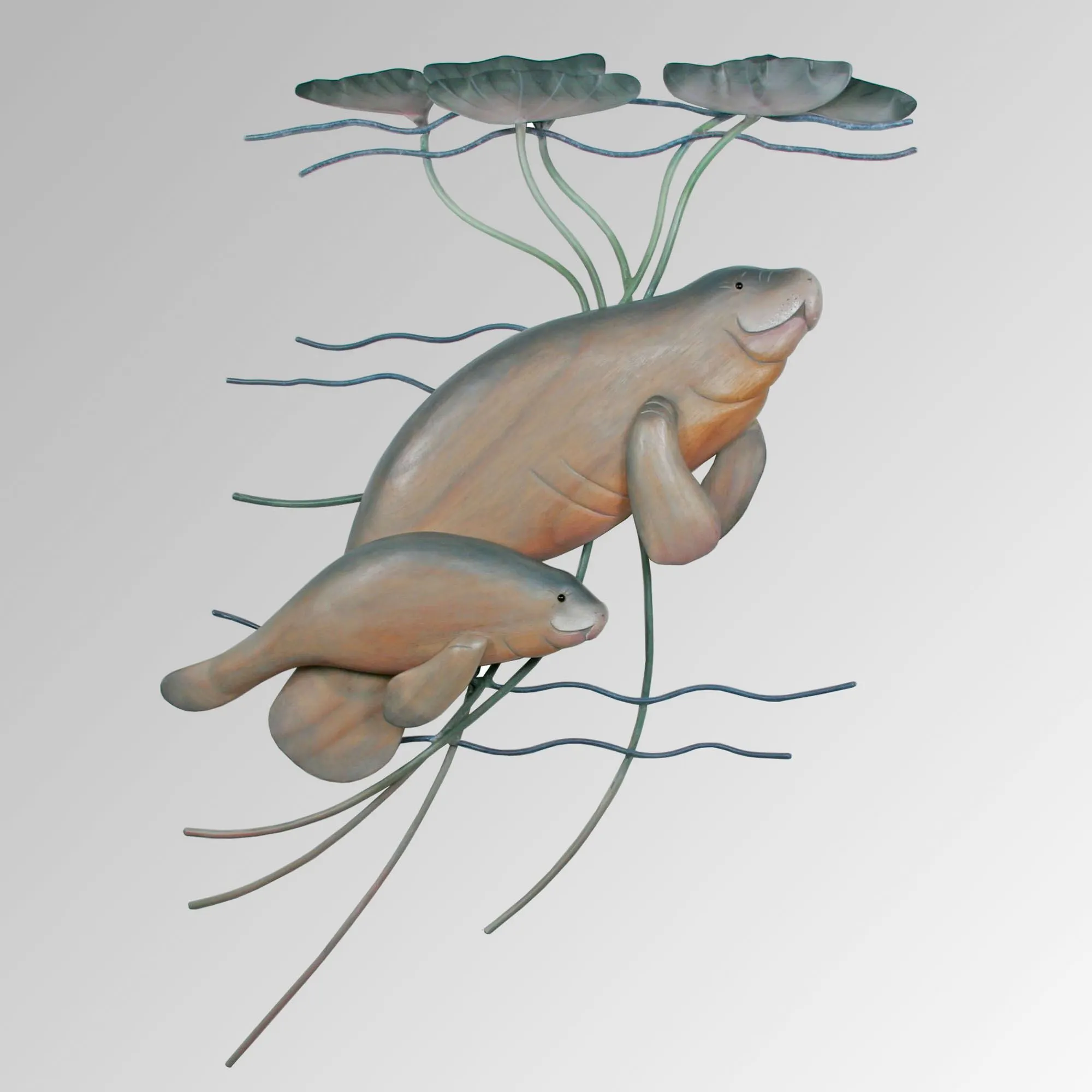 Safe beneath the sea, the Manatee and Baby float along through the day, finding the tastiest water lilies beneath the waves. Designed by artist Joanne Ferrara, the handcrafted wall sculpture features two gray handcarved wood manatees among the metal waves and water plants. Hand-finished natural shades add life to the design. Perfect for your indoor space, covered porch, or enclosed patio, the wall art measures 24"Wx3"Dx36"H.