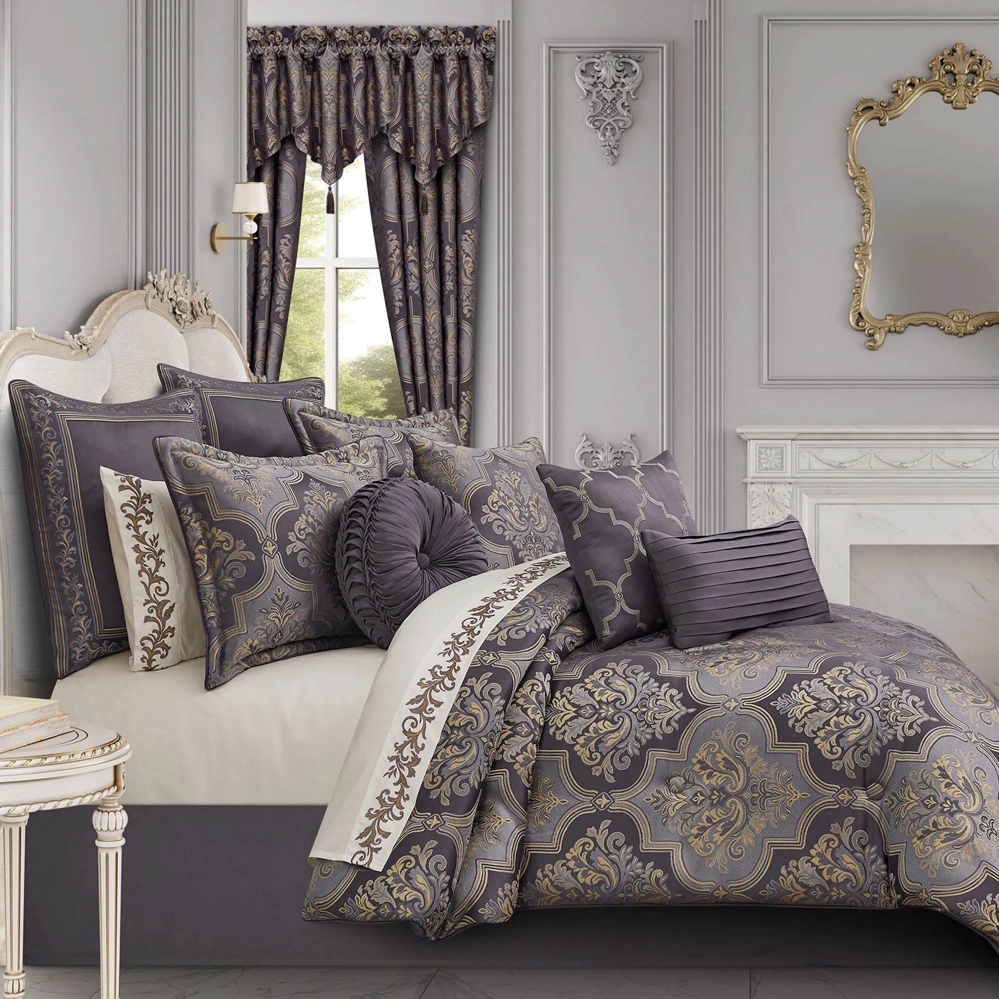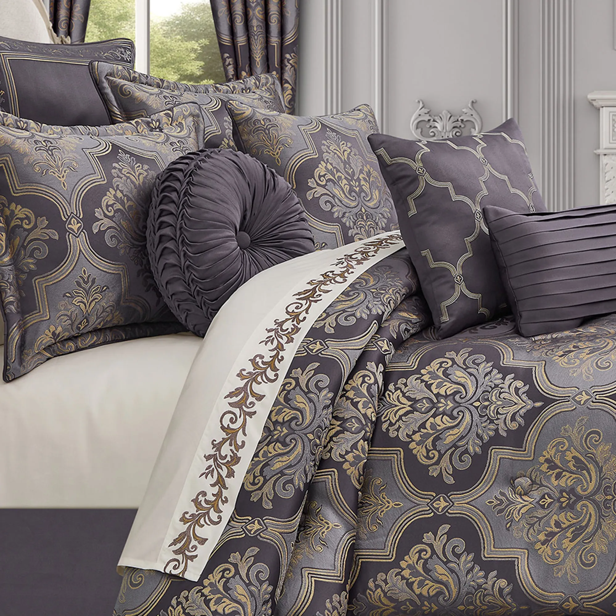 Steeped in royal hues, a regal presence floods the Manchester Bedding with elegant panache. From Five Queens Court, the jacquard-woven polyester ensemble features timeless flourishing damask inside quatrefoil borders for a boldly detailed design. Lavender, grape, and gold tones color the bedding, while a coordinating scroll and stripe pattern adds a defining element.