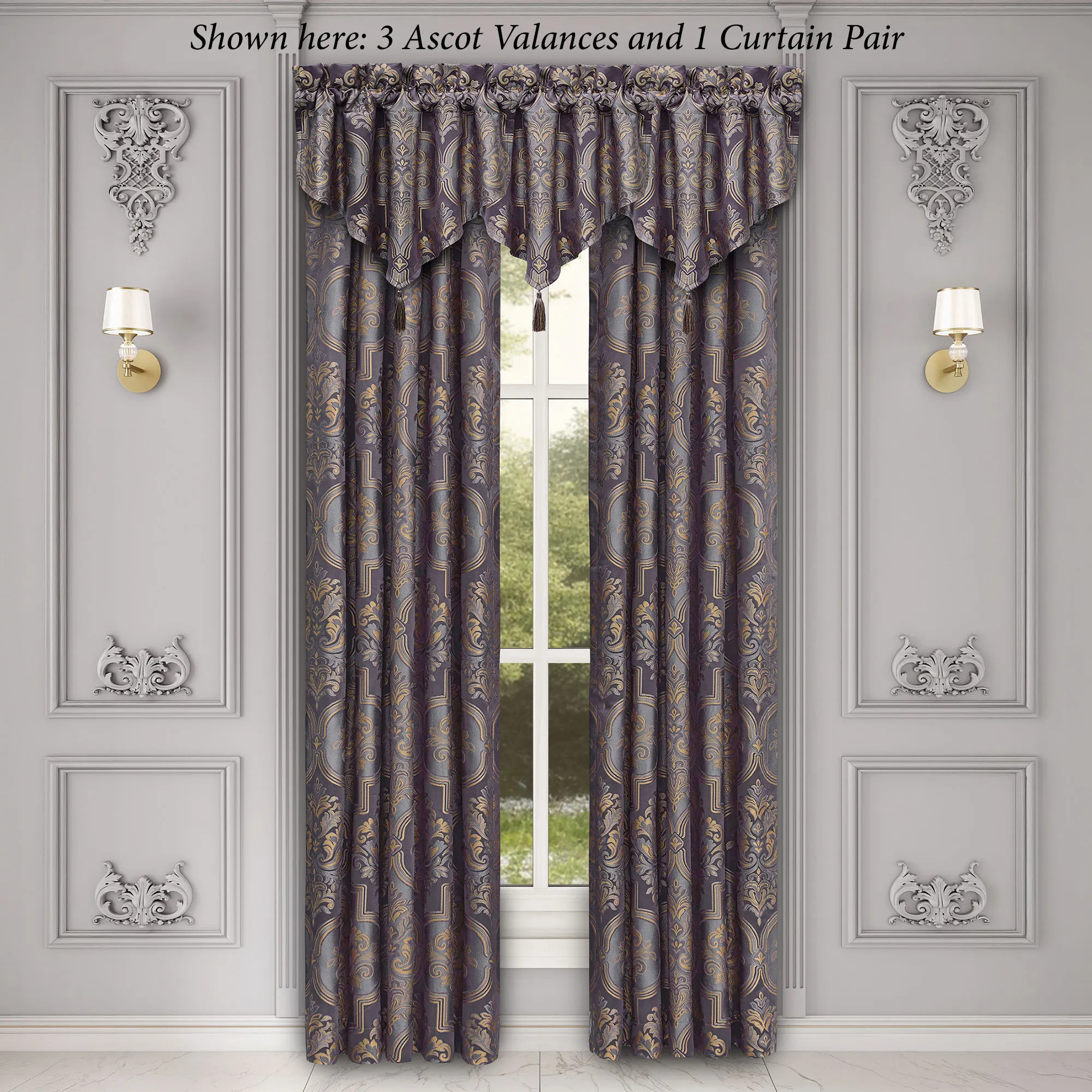 Lined Window Treatments have damask and tailored edges. Wide Curtain Pair includes tiebacks. Each Ascot Valance has a tassel on the end.