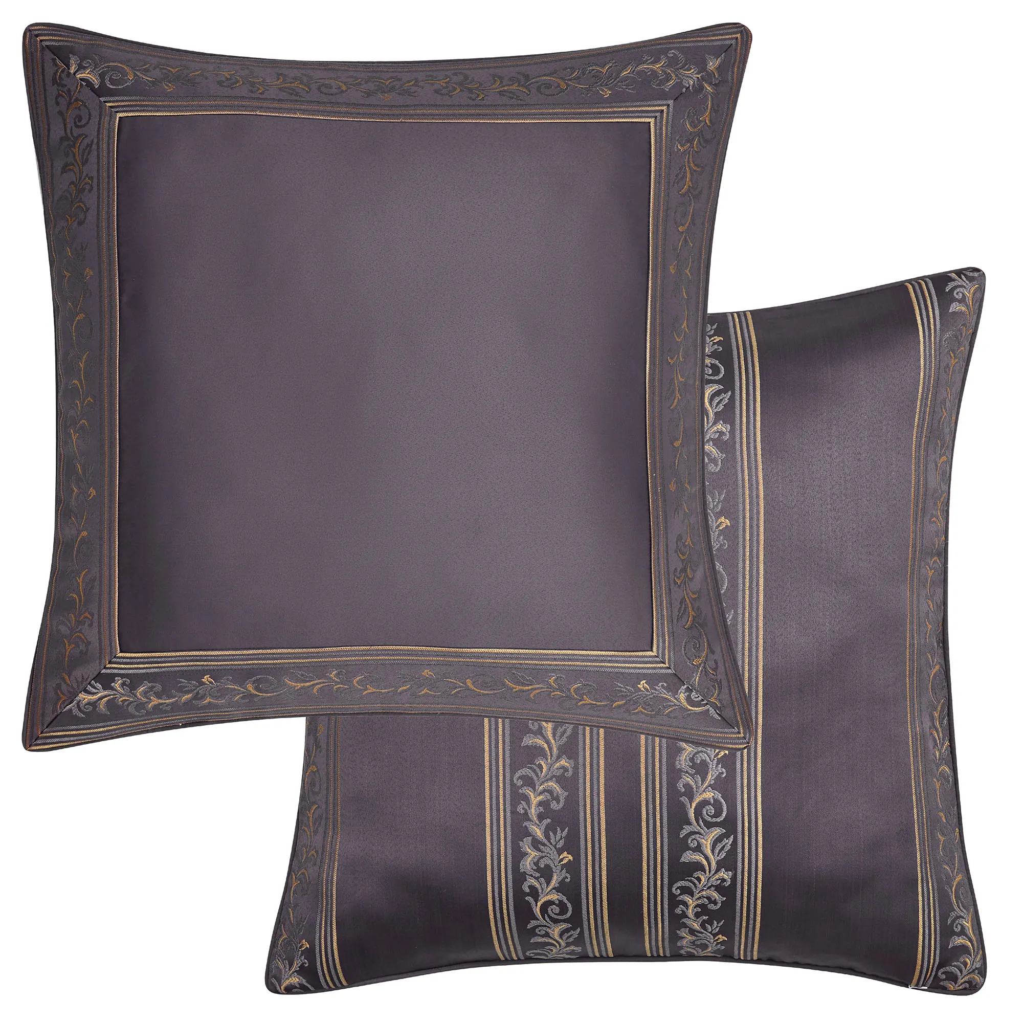 Piped European Sham is grape with a mitred scroll and stripe frame; reverses to all-over scrolls and stripes; zipper closure.