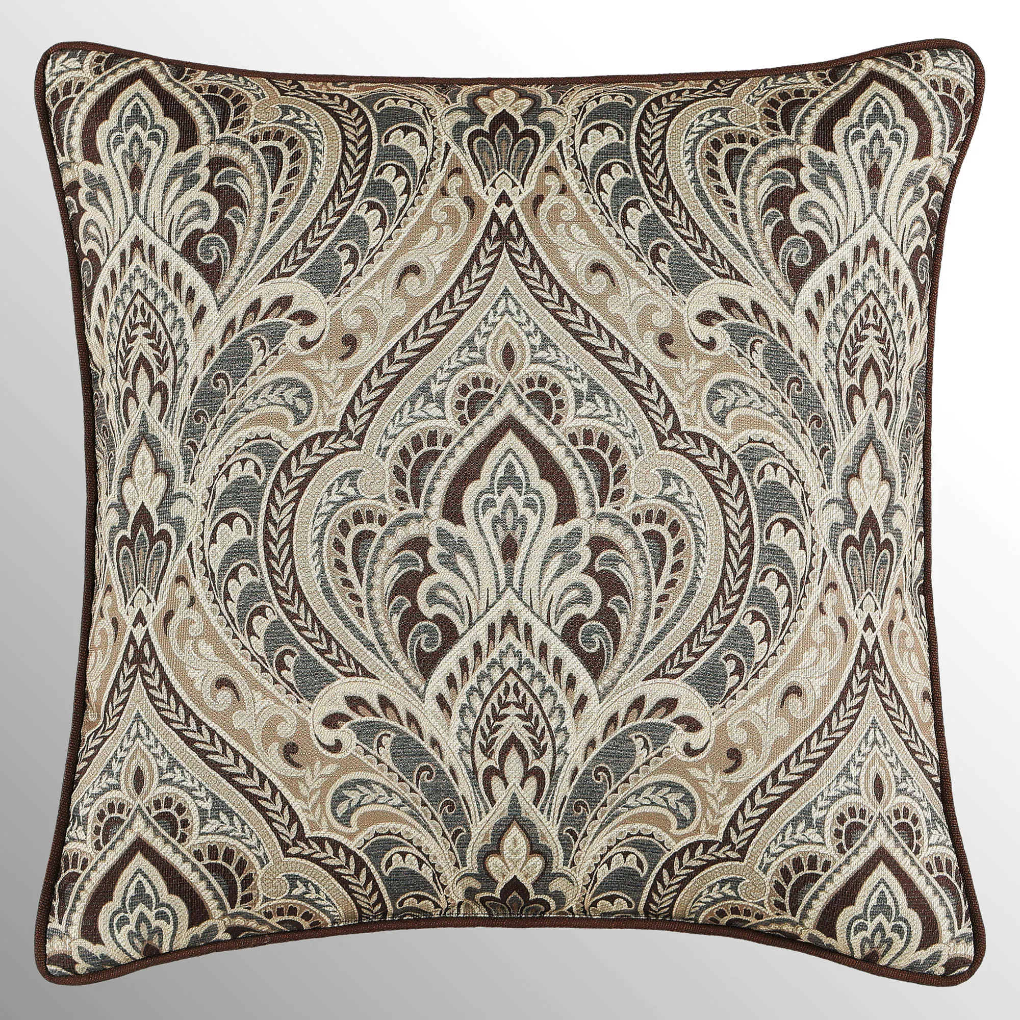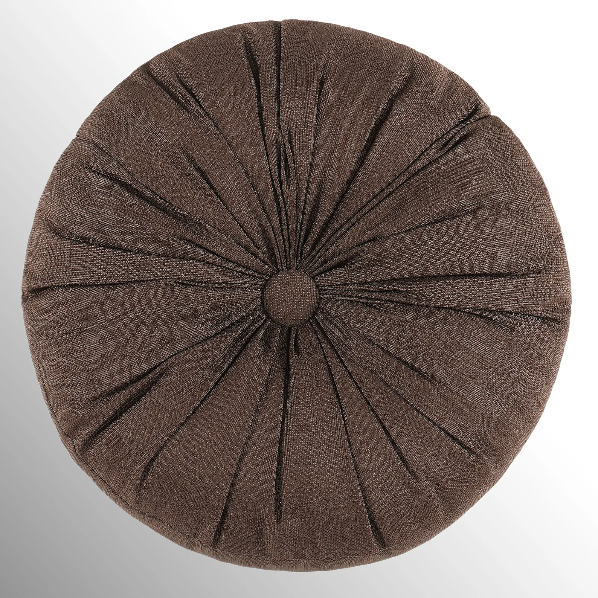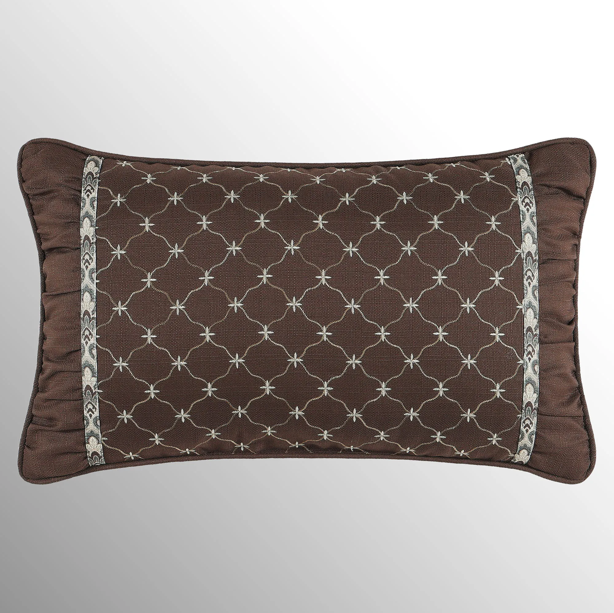 Pillows have piped edges, except the Round. Spot clean. The 16" Square has foulards. The 18" Square has damask. Rectangle is textured chocolate with embroidered unique latticework, foulard bands, and shirred ends. Reversible, handmade Round is shirred textured chocolate with a button-tuft center, tailored edges, and a 3" side gusset.