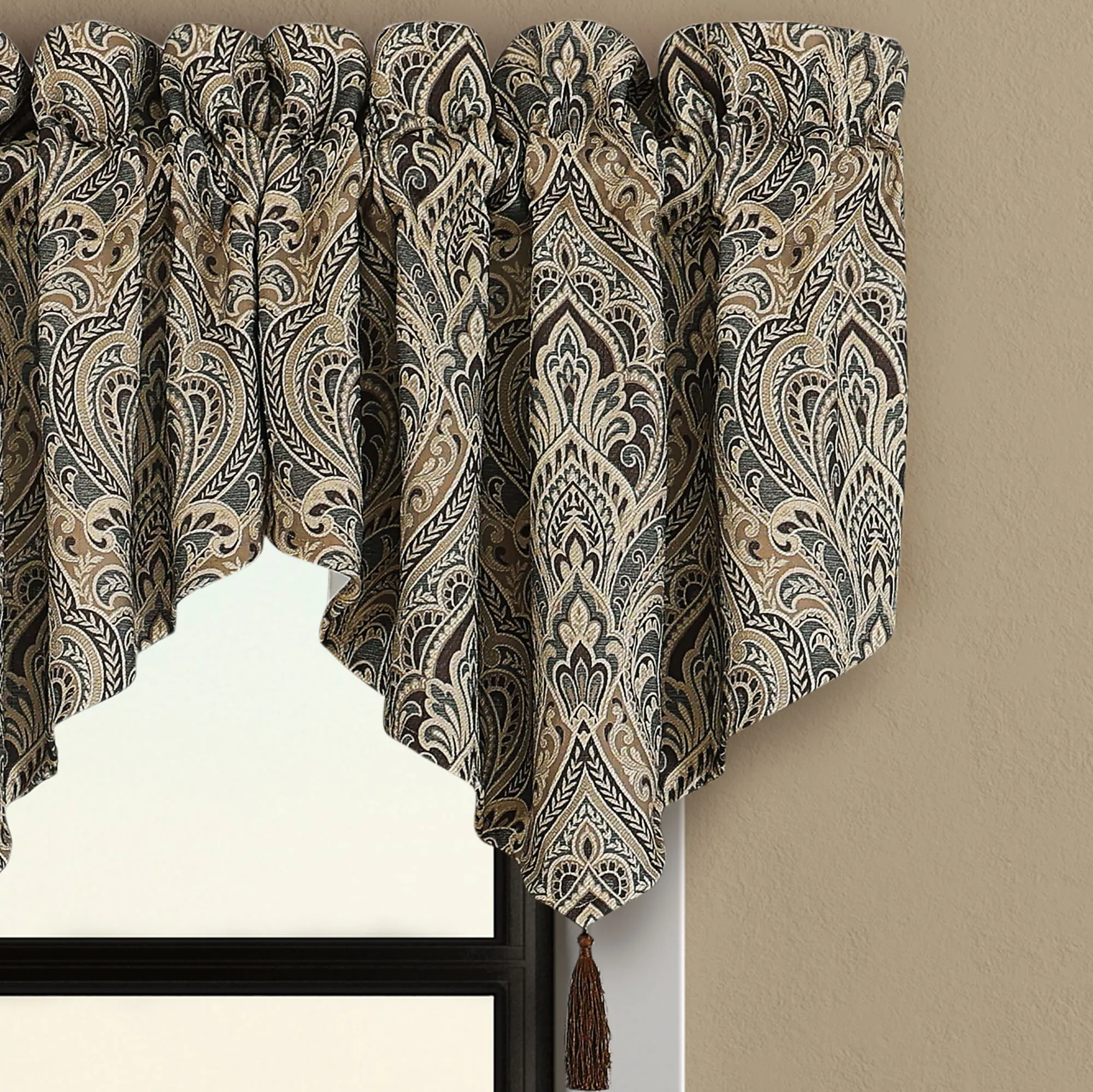 Lined Window Treatment has damask and tailored edges. Wide Curtain Pair has a 3" rod pocket. Tiebacks are included. Each Ascot Valance has a tassel on the end and a 3.25" rod pocket.