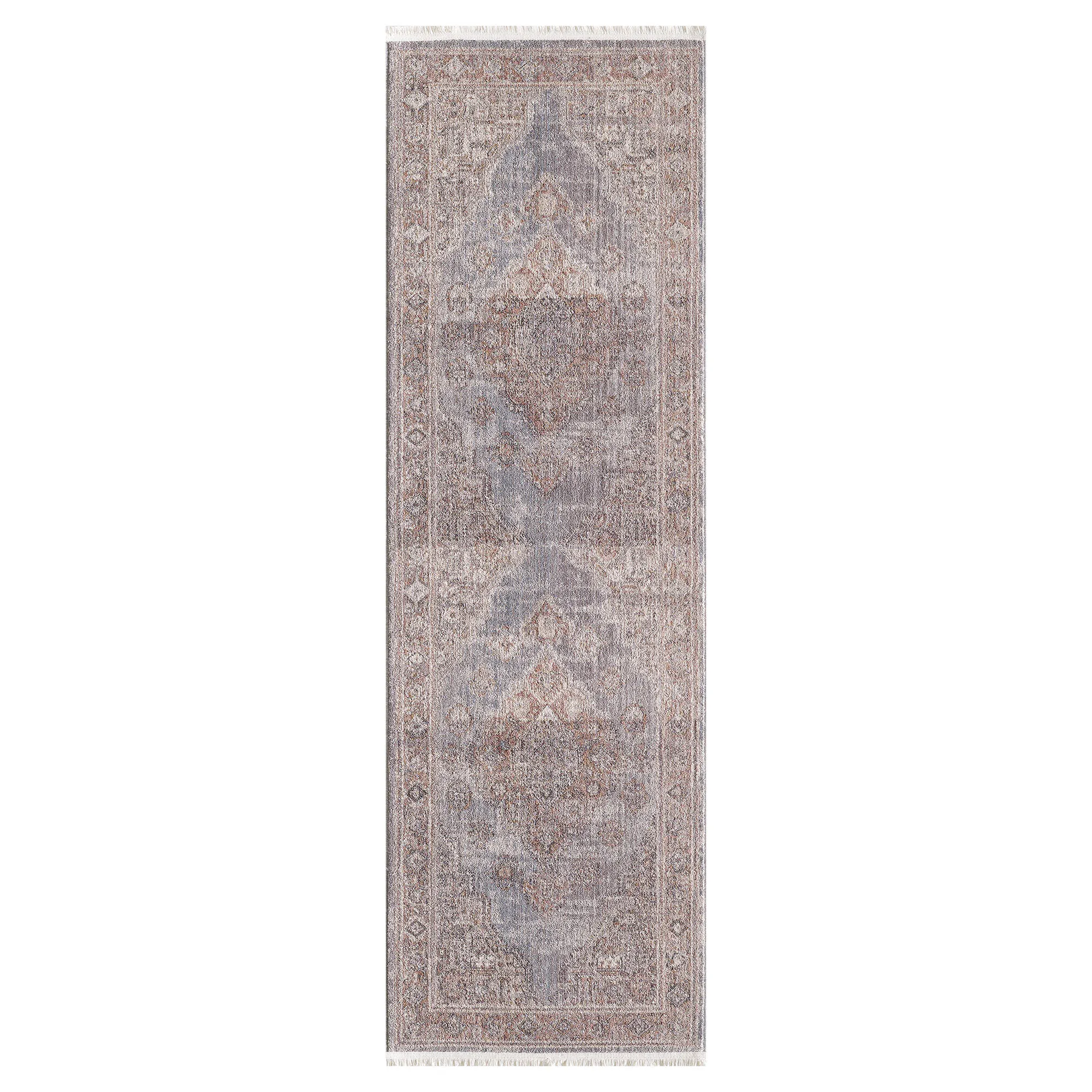 Turkish medallion designs add to the subtle beauty of the Margot Rug. This power-loomed polyester area rug, .5" thick, has classic motifs with a distressed and vintage look. Colors include shades of mauve, maroon, blue, gray, and parchment. Length-end fringe is .25"L. We recommend professional cleaning by a rug cleaner. Imported.