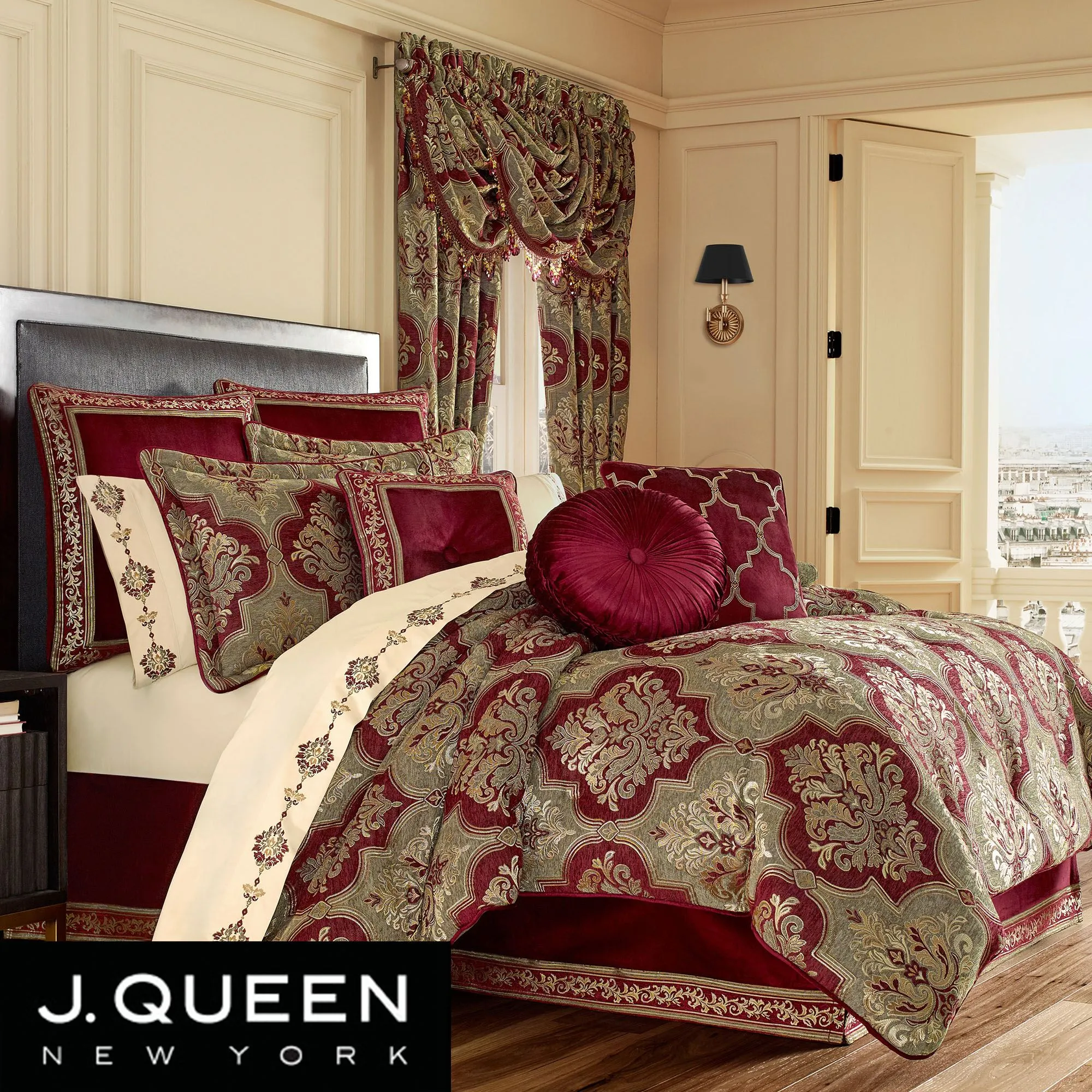 Lavish style radiates from the Maribella Damask Comforter Bedding from J. Queen New York. Oversized comforter features metallic light gold and harvest gold jacquard-woven damask and quatrefoil motifs on ruby and dark amber polyester chenille. Comforter is backed in ruby polyester. Bedding fill is polyester. Dry clean only. Imported.