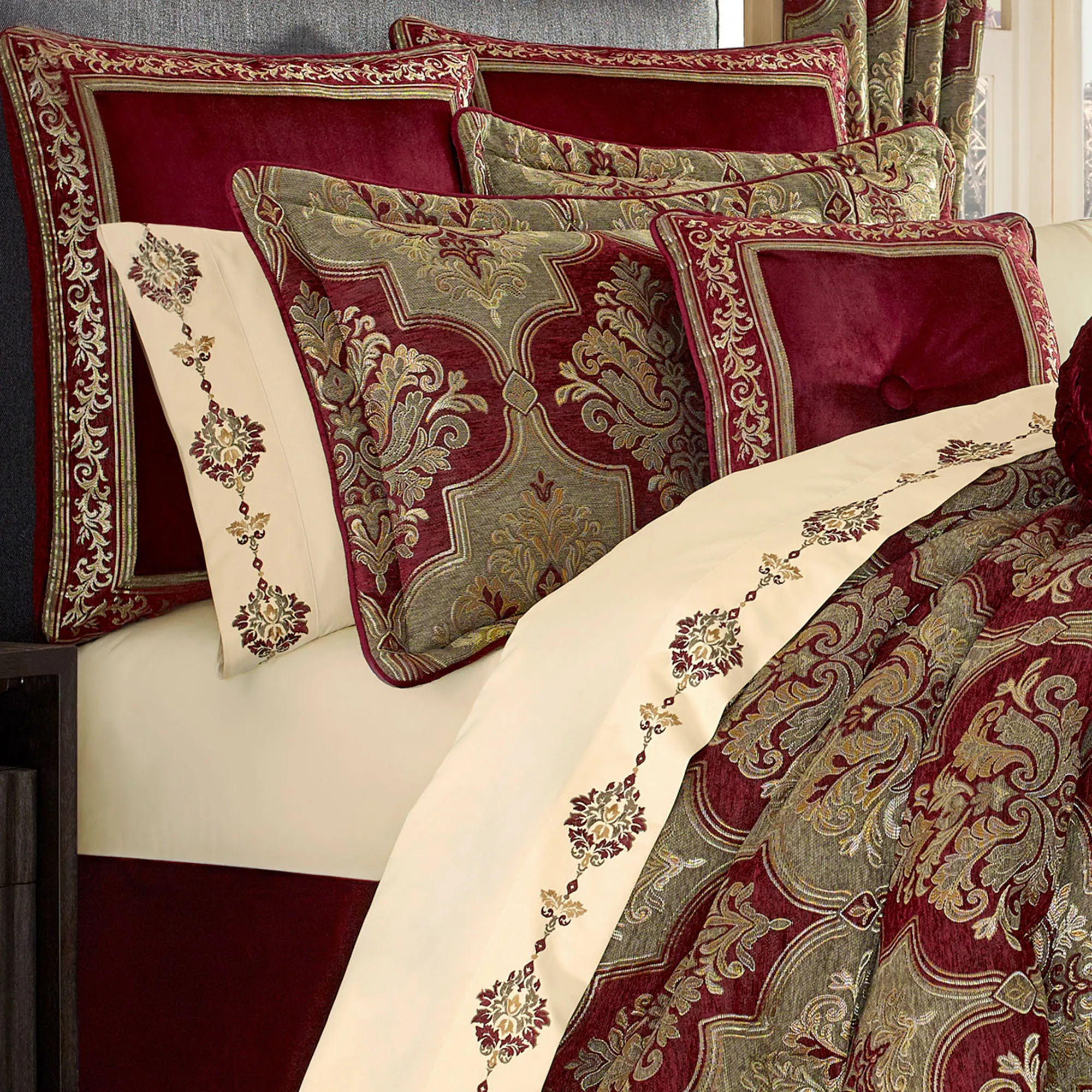 Lavish style strikes a rich chord upon the Maribella Bedding. From J. Queen New York, the polyester ensemble features metallic light gold and harvest gold jacquard-woven quatrefoil and leaf damask motifs upon opulent ruby and dark amber chenille. Sumptuous velvet adds a further element of grandeur.