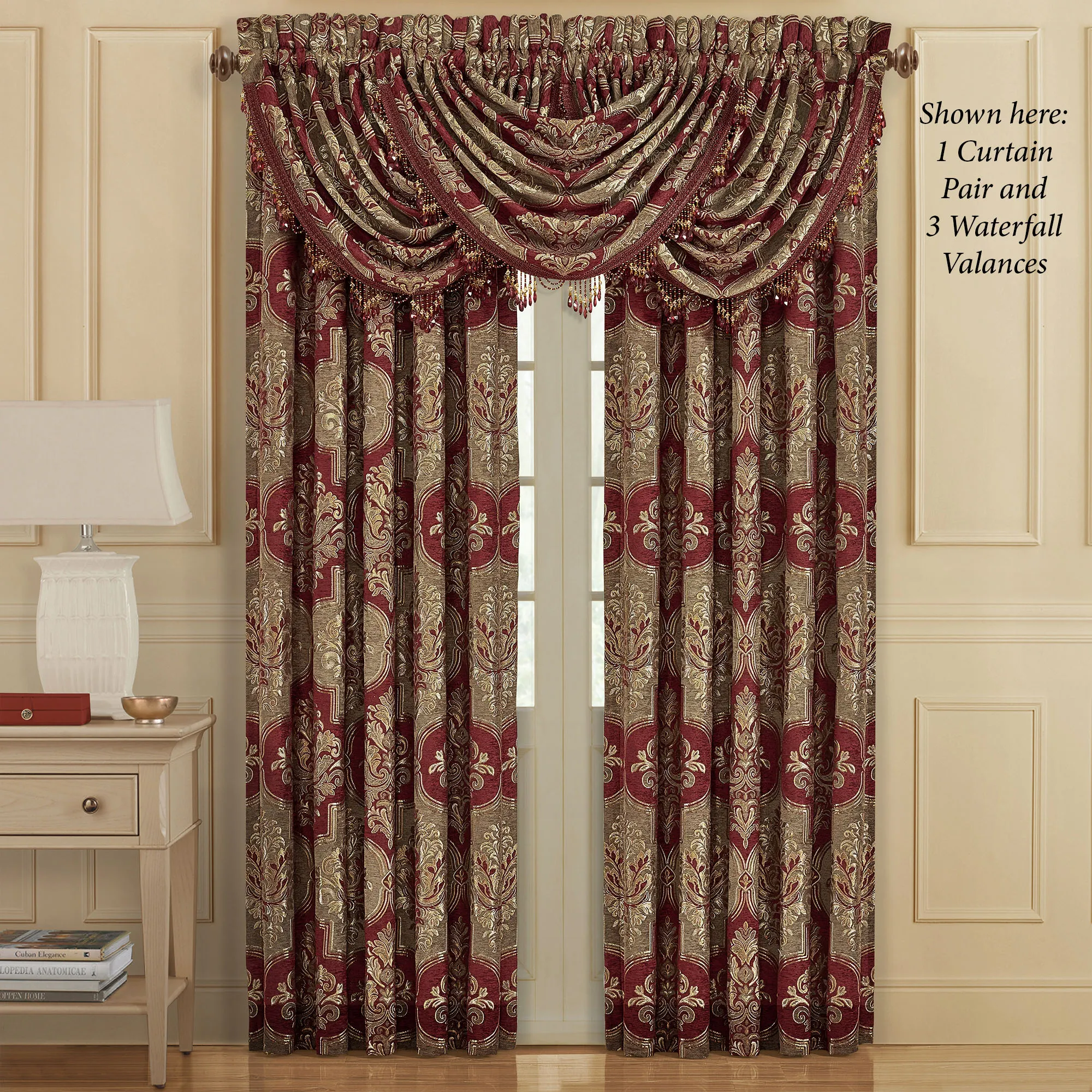 Window Treatment: Wide Curtain Pair has 3" rod pockets and is 100"W; choose 84"L or 95"L. Each Waterfall Valance has a 3.5" rod pocket and is 49"Wx33"L. We recommend one valance for every 12"-15" of window width.