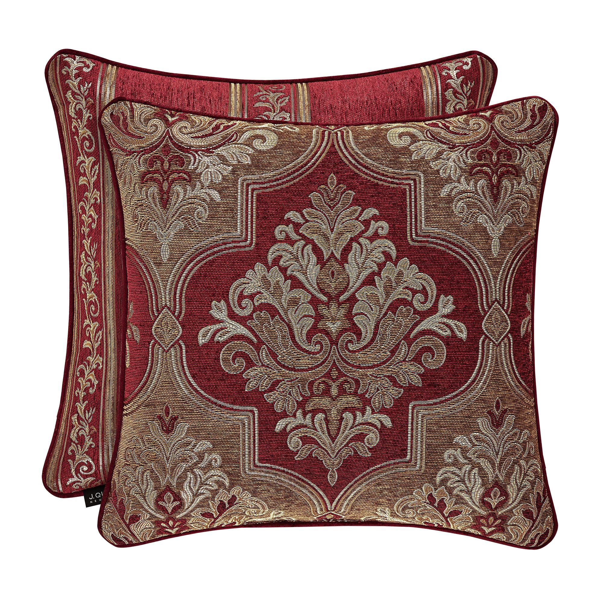 Pillows: Spot clean. Tufted 18" Square has a tufted ruby velvet center, mitred stripe and leafy border, and piped edges. Piped 20" Square mimics the comforter face; reverses to all-over stripe and leaf motifs. Embroidered 18" Square is ruby velvet embroidered with metallic golden quatrefoil shapes. Reversible Round is pleated ruby velvet with a center button tuft and a 4" side gusset; hidden zipper closure.