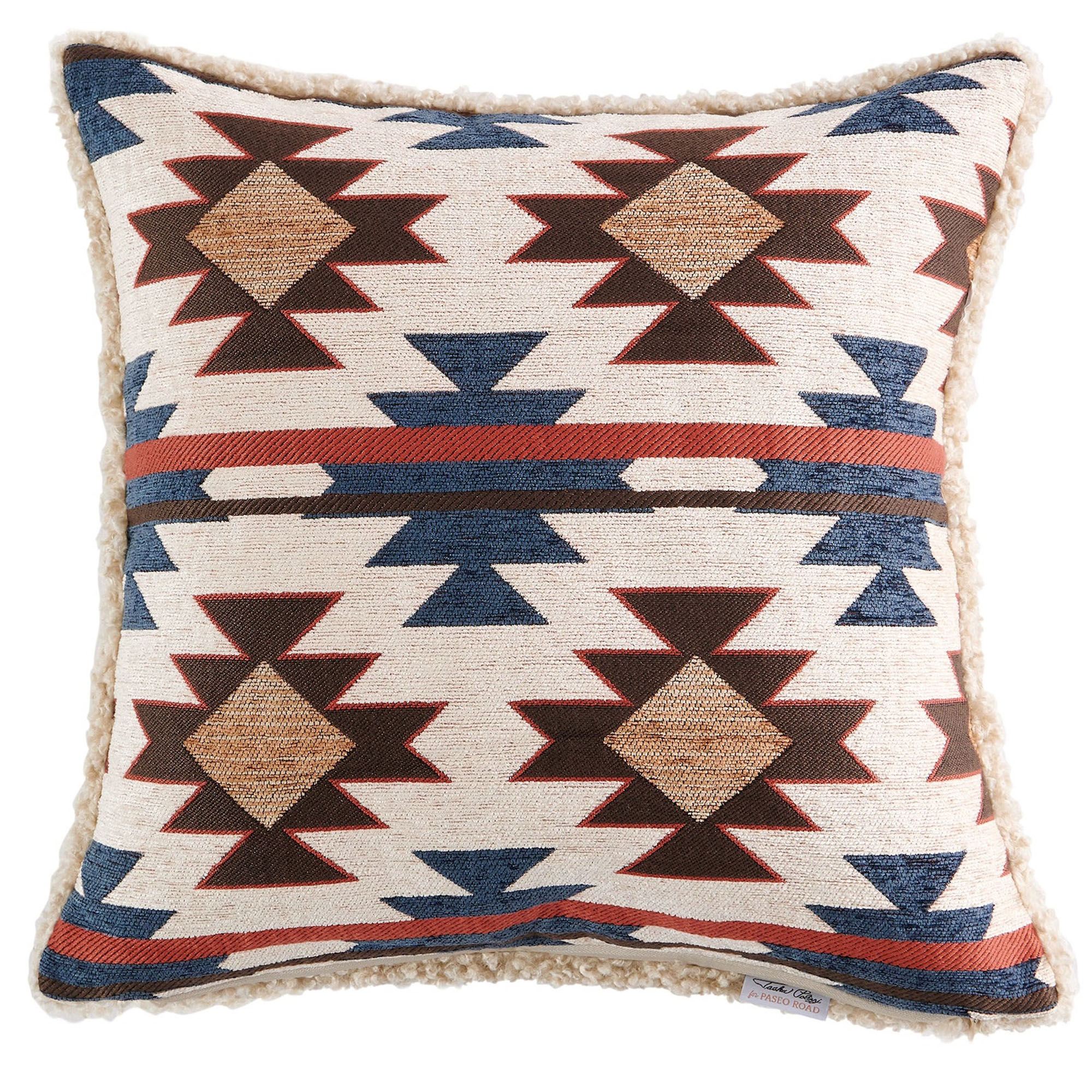The tailored Square Pillow has woven chenille Southwestern motifs on ivory chenille, a zipper closure, and a natural plush polyester teddy fabric backing. Spot clean.