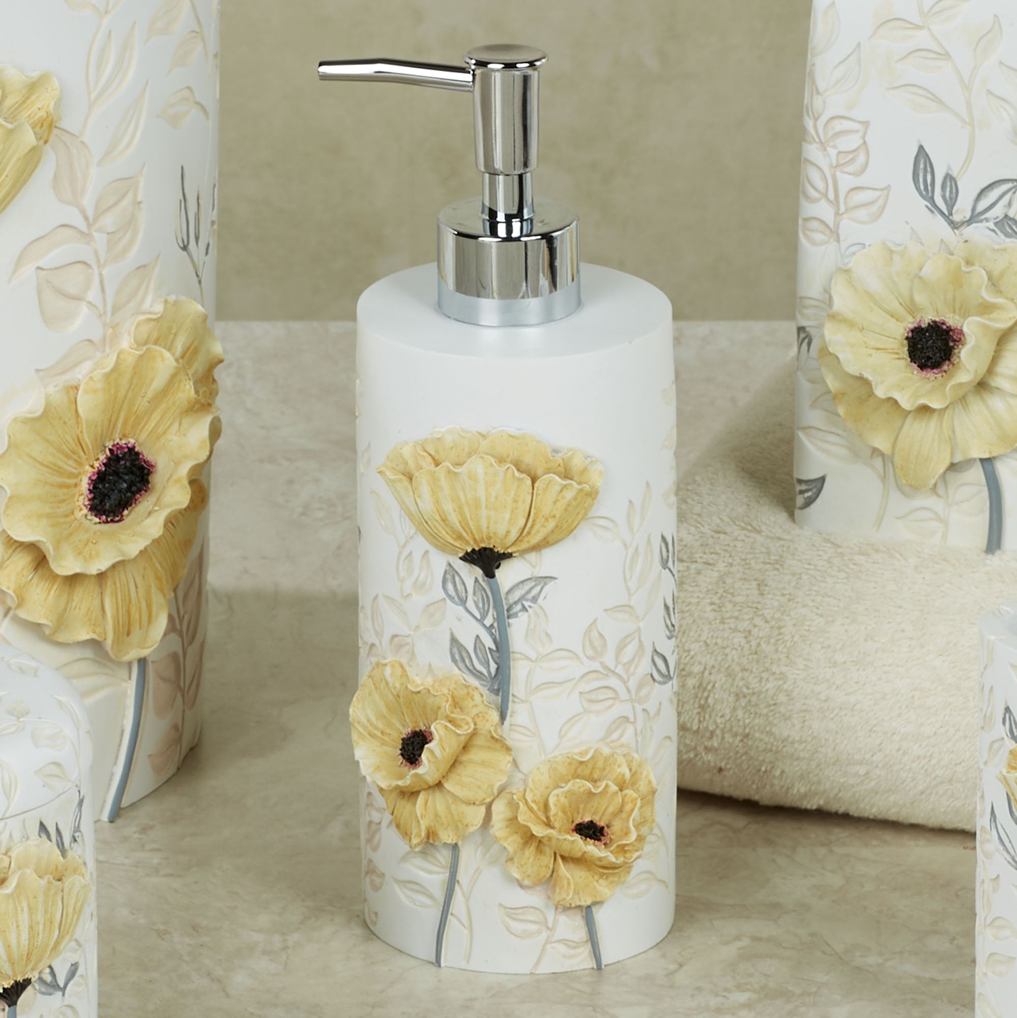 Blossoming in a cheery yellow hue, the Marielle Floral Bath Accessories unfurl dimensional poppies. All of the off-white resin designs, except the Soap Dish, feature carved ecru, wheat, and taupe vining leaves beside the lovely textured blooms. Soap Dish resembles a single yellow poppy flower with an aubergine center. The Brush Holder can be used to hold your toothbrushes or makeup brushes. Specify Brush Holder, Covered Jar, Lotion/Soap Dispenser, Soap Dish, Tissue Cover, Tray, or Wastebasket.
