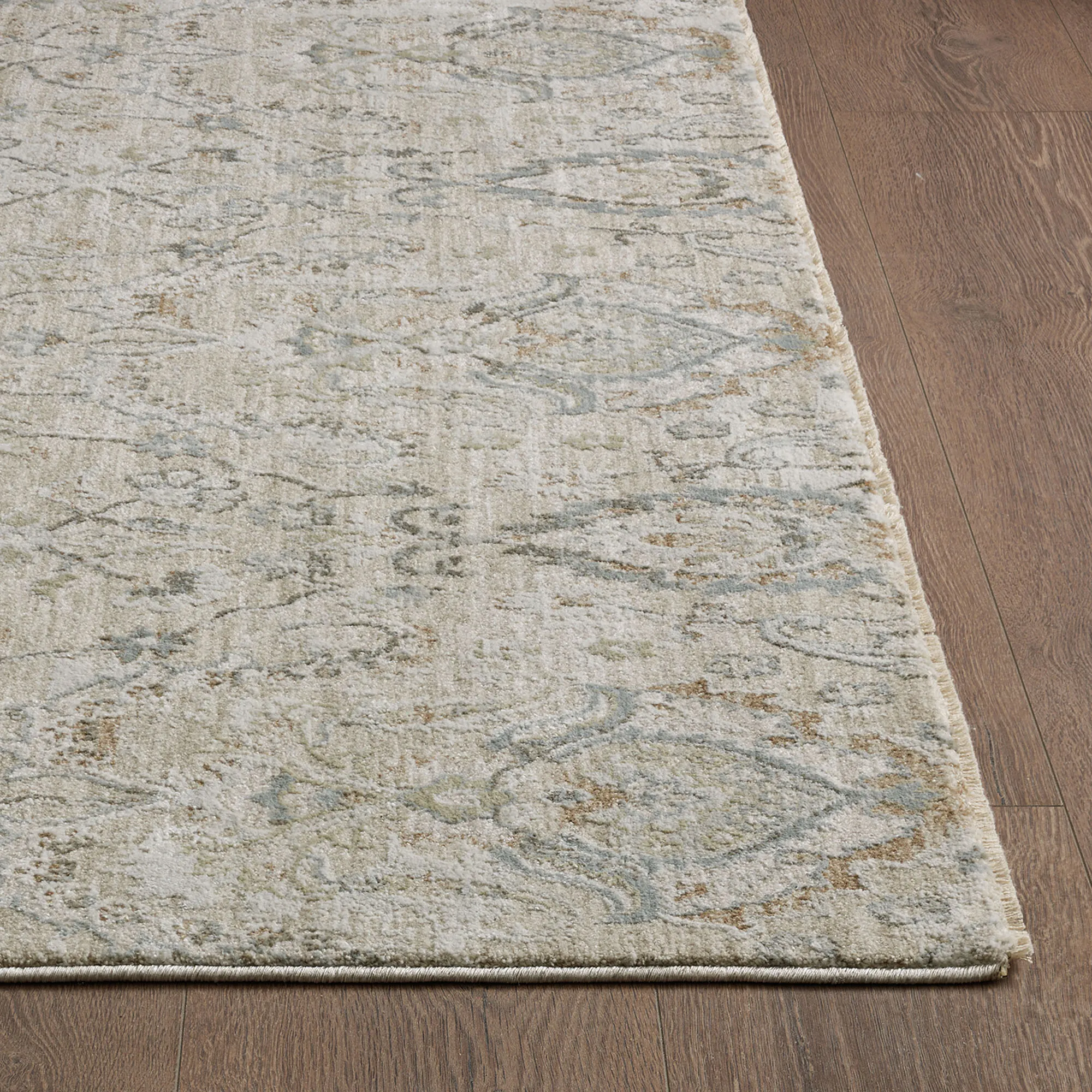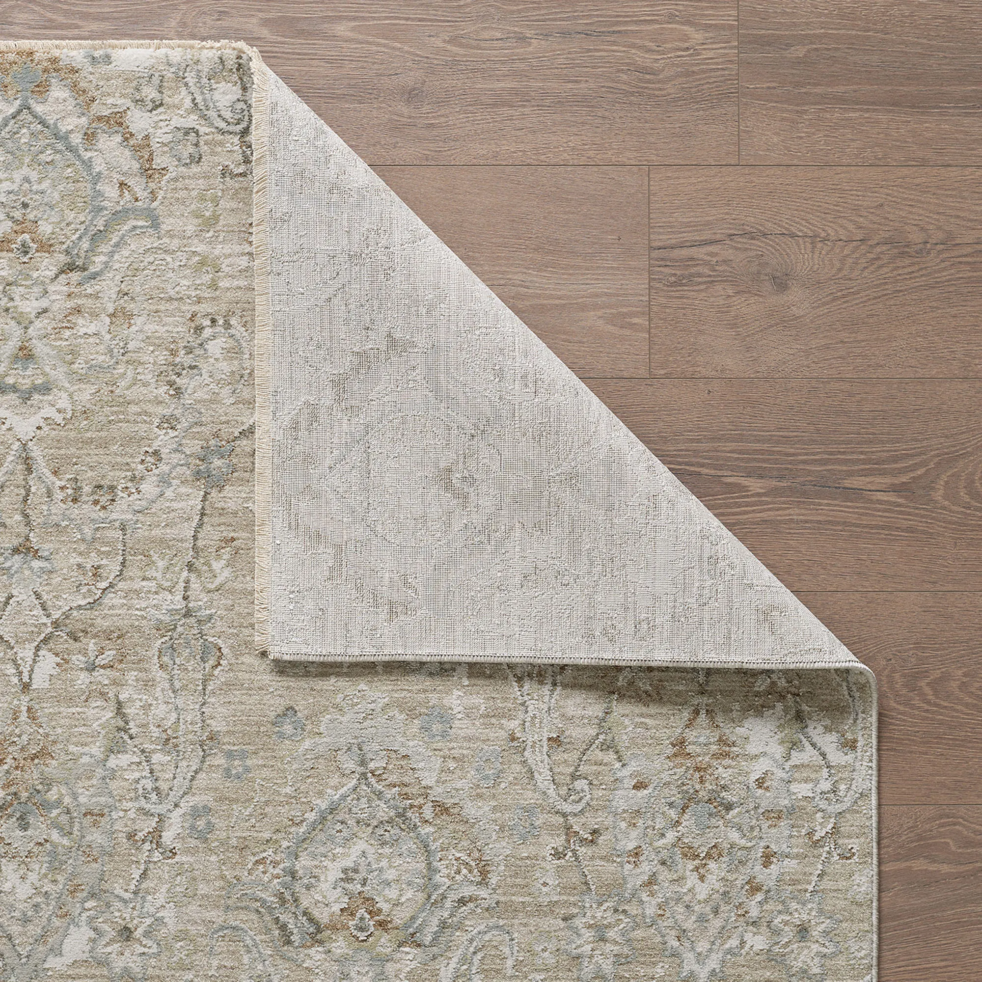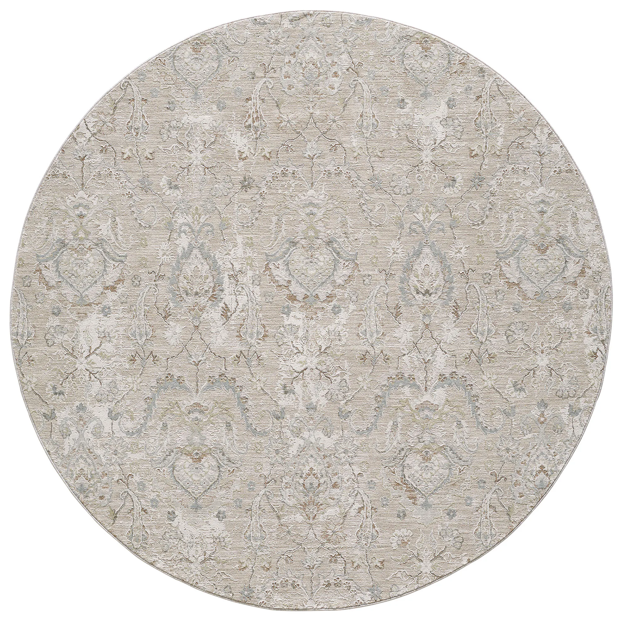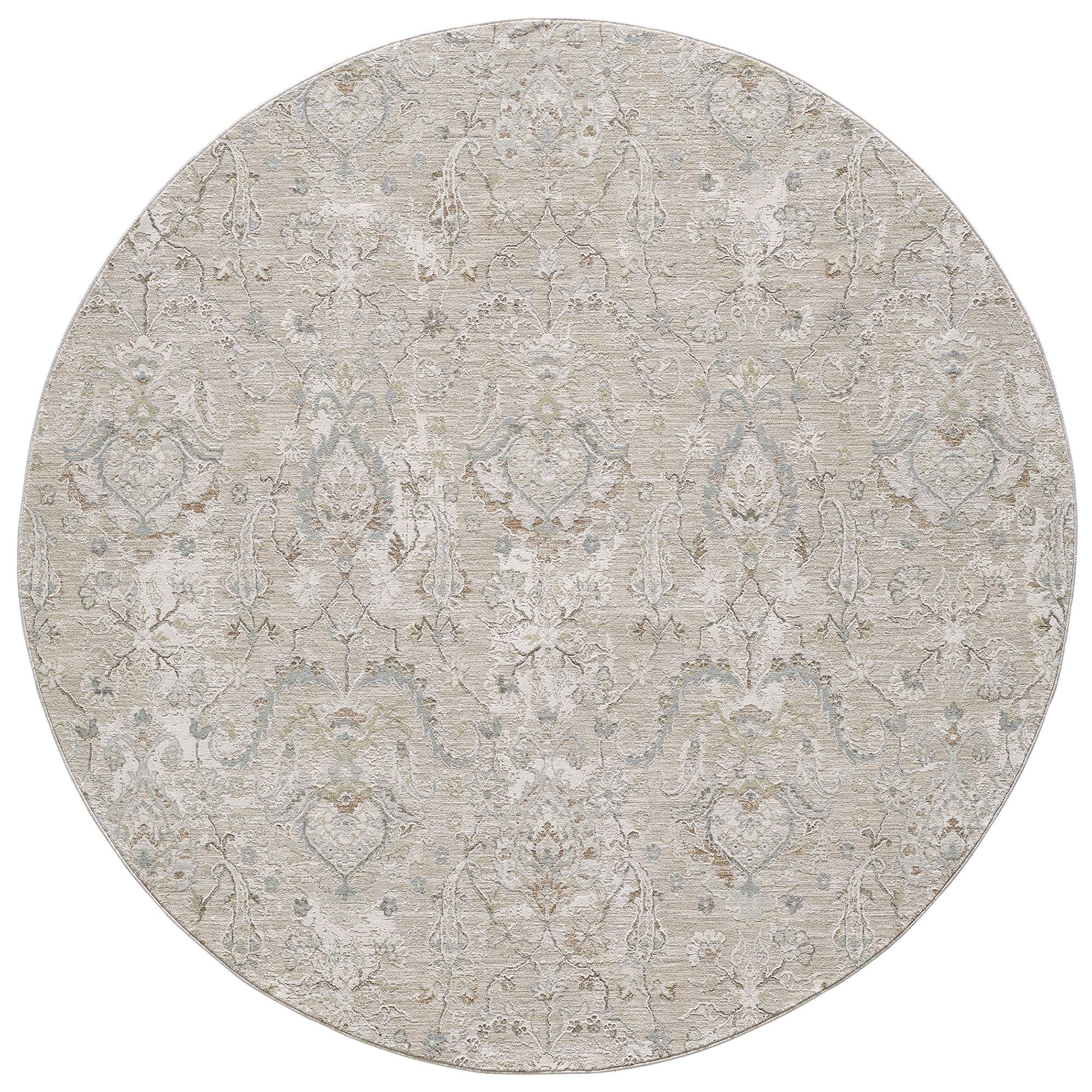 The textured damask jacquard design on the Marien Rug beautifully embellishes any space with subtle elegance and classic charm. This power-loomed polyester area rug, .25" thick, has length-end fringe that is .25"L; the round rug does not have fringe. Colors include shades of natural, ivory, gray, moss green, and tan. We recommend professional cleaning by a rug cleaner. Imported.