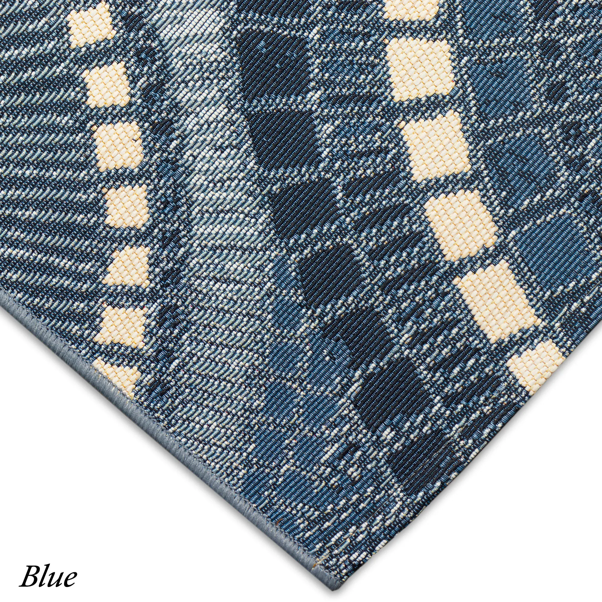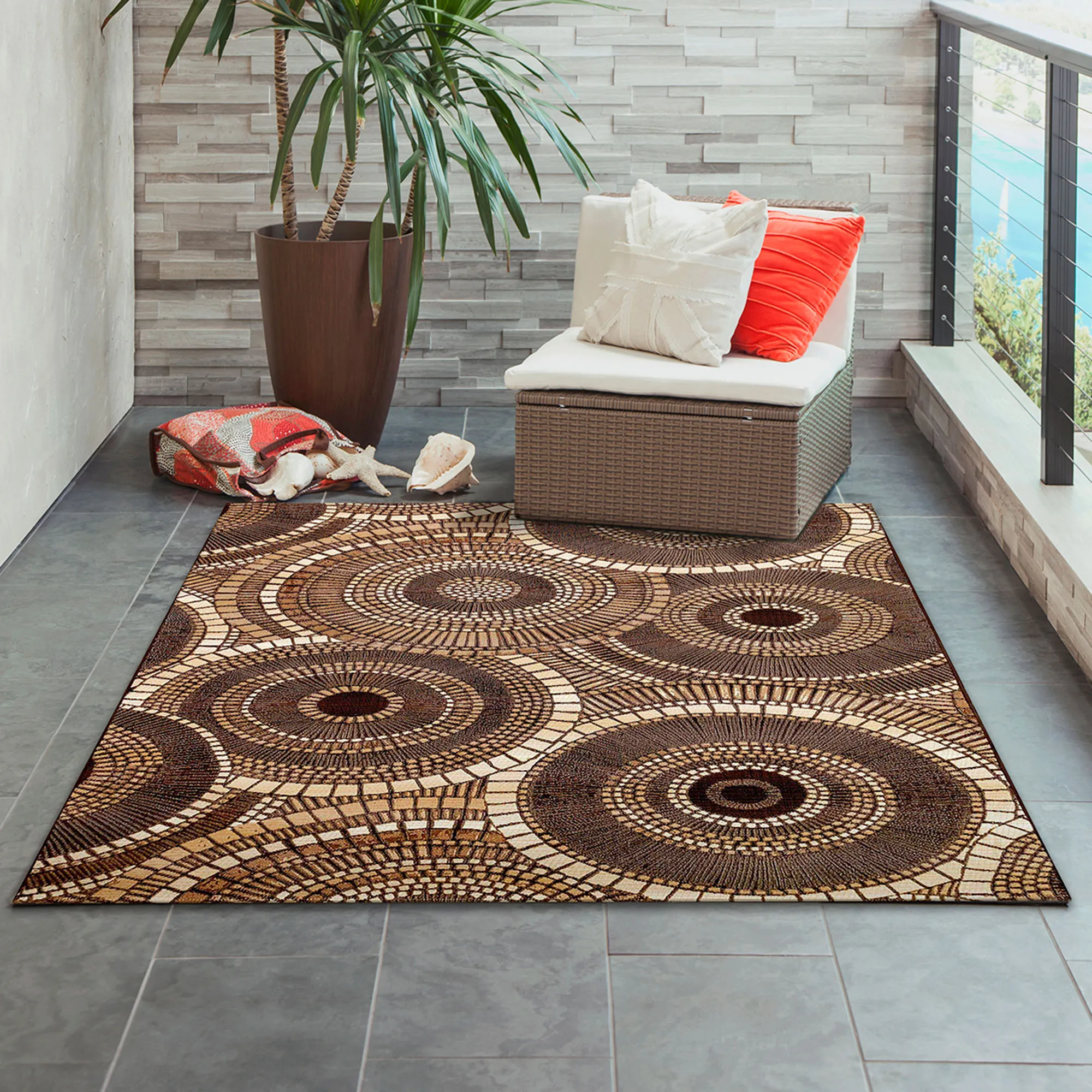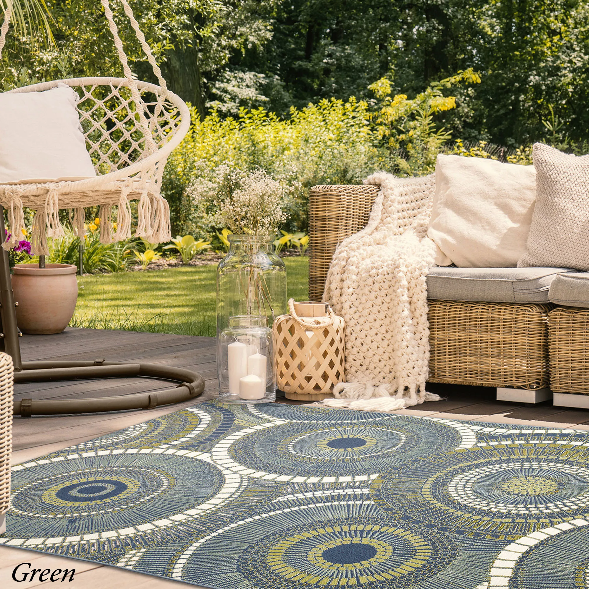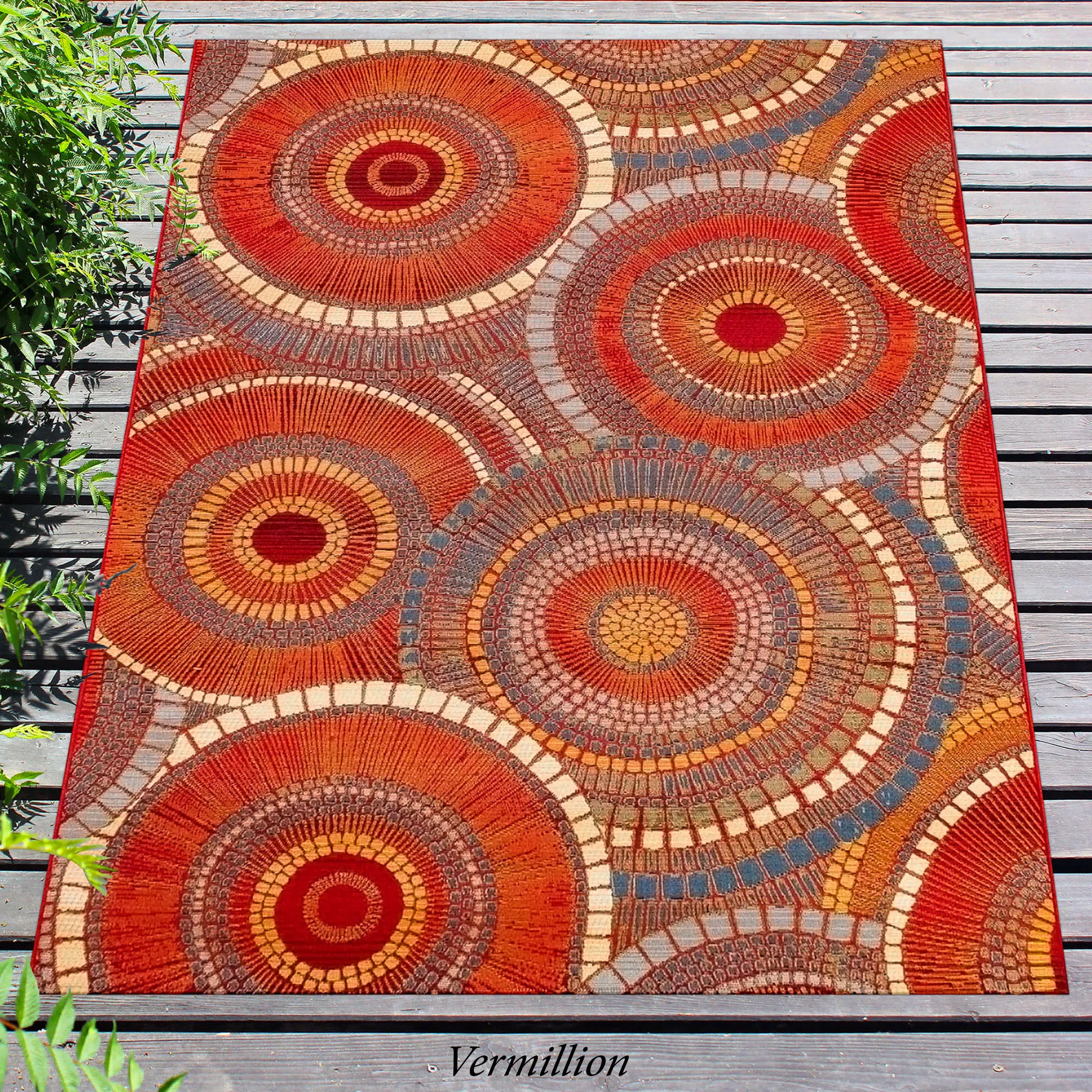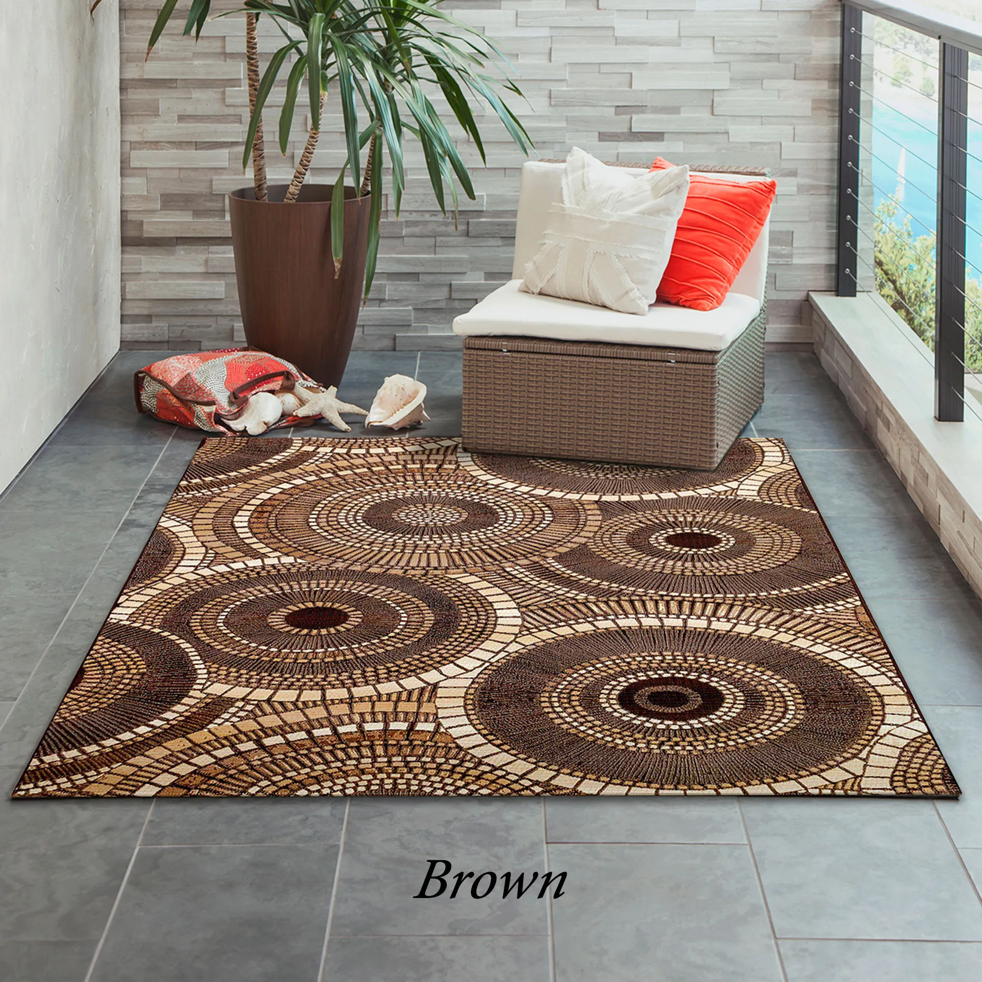 A mosaic pattern of dots, lines, and squares creates the retro designs on the Marina Circles Indoor/Outdoor Rug. Power-loomed polypropylene/polyester area rug, .12" thick, is flat-woven with a low profile, weather-resistant, and UV-stabilized for enhanced fade resistance. Area rug is durable and ideal for high-traffic areas. Vermillion includes hues of vermillion, brick red, gray, blue, and sunset colors. Blue includes shades of blue, denim, navy, and ivory. Brown has brown, mocha, ivory, tan, and chocolate. Green has moss green, denim, ivory, and navy shades. Outdoor seasonal use; do not expose this rug to freezing temperatures. Spot clean and rinse with a garden hose; for stubborn stains, we recommend professional cleaning by a rug cleaner. Imported.