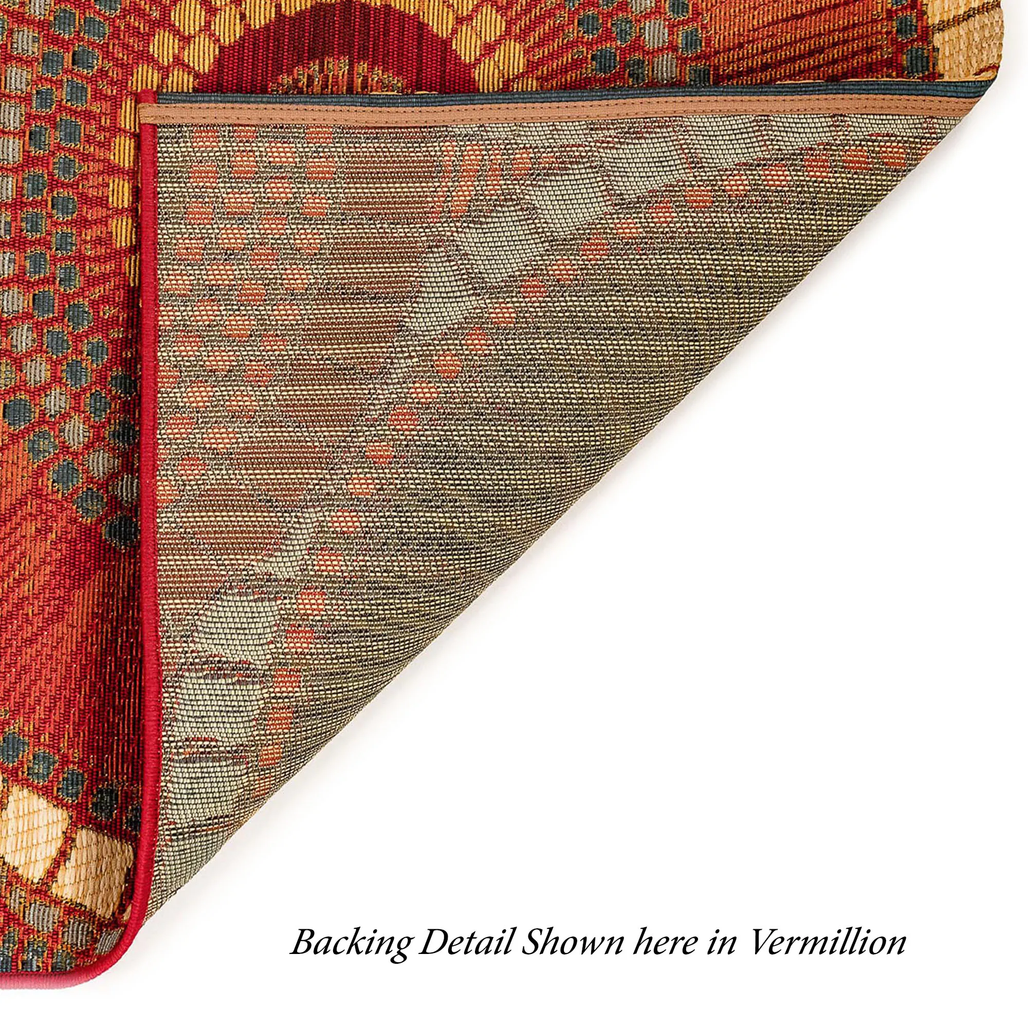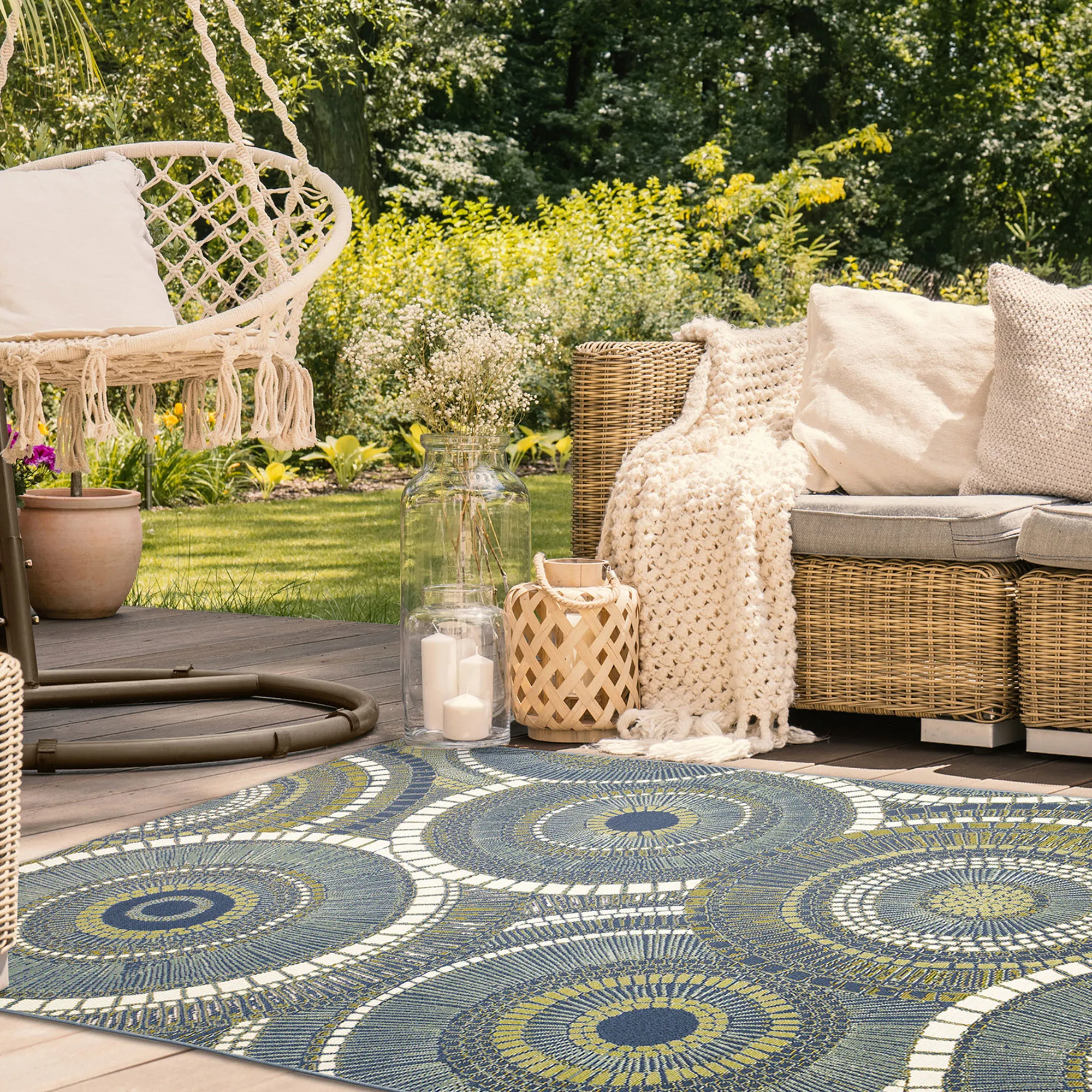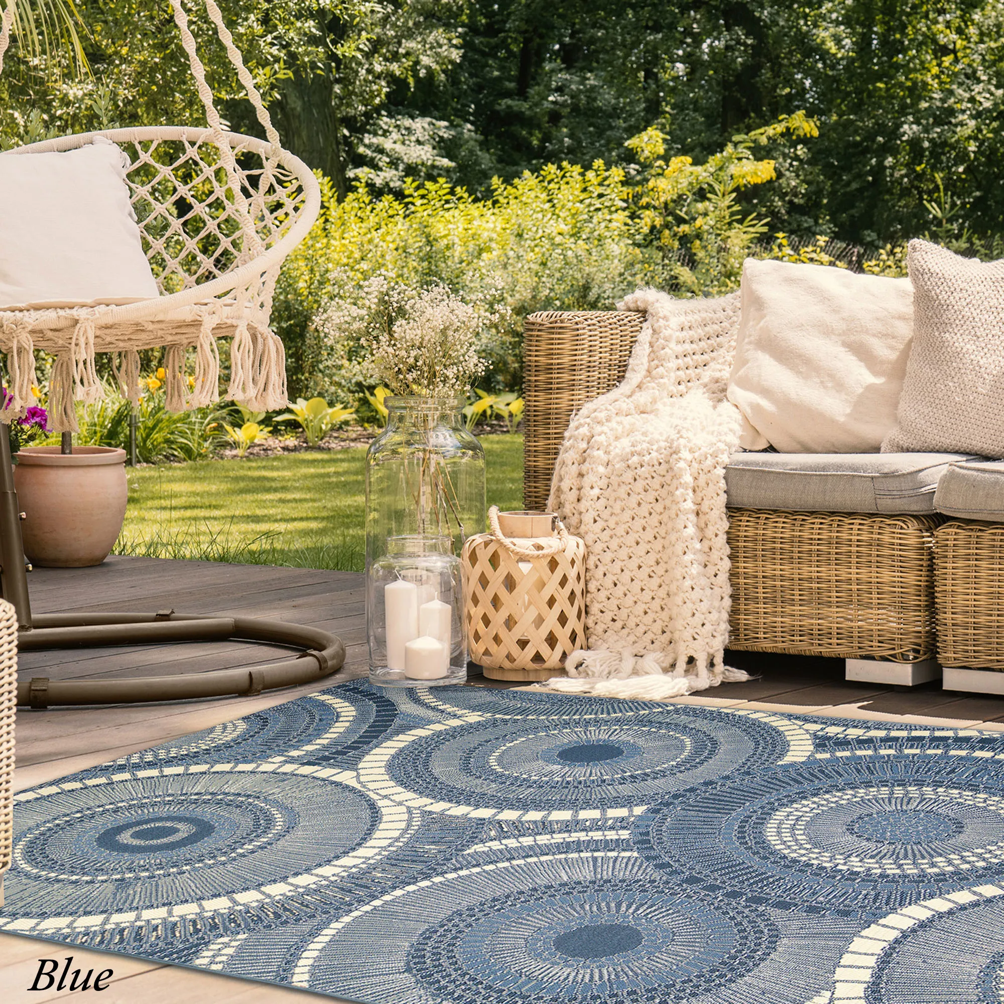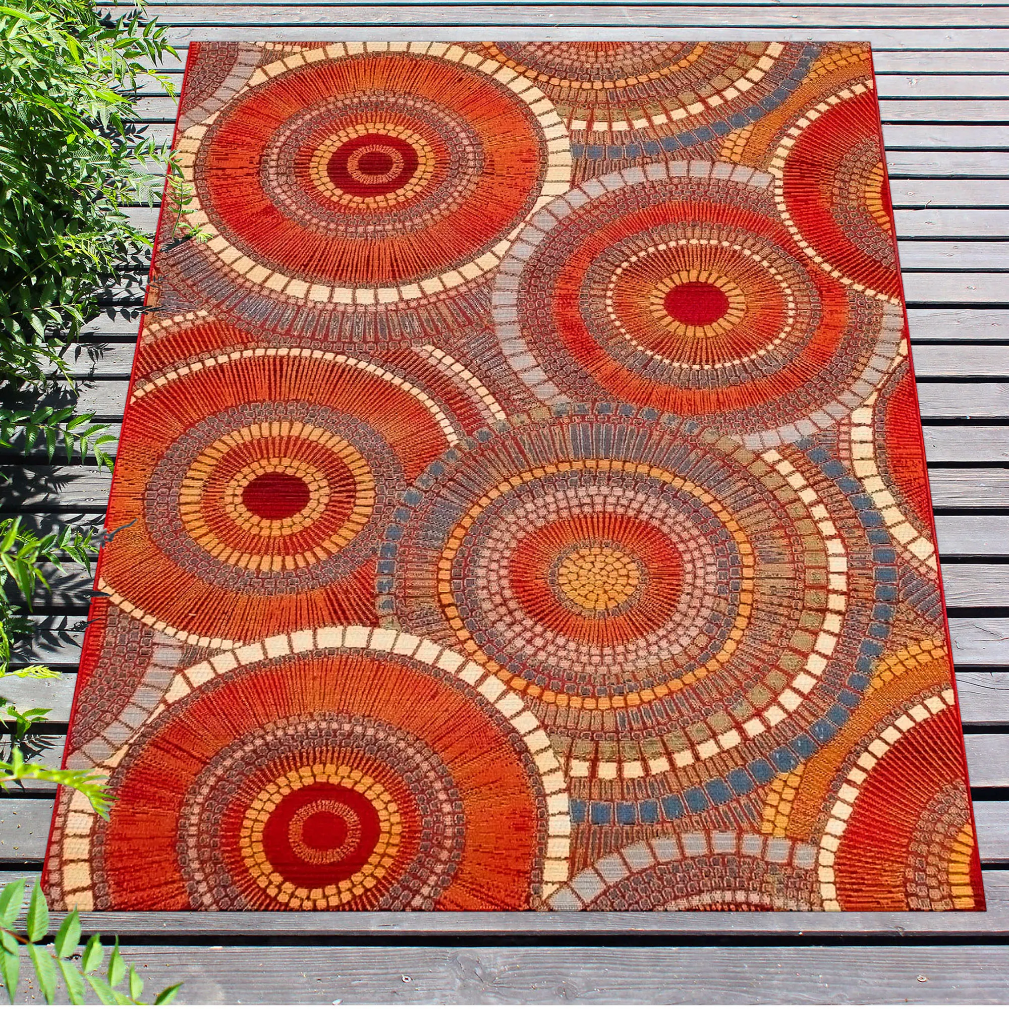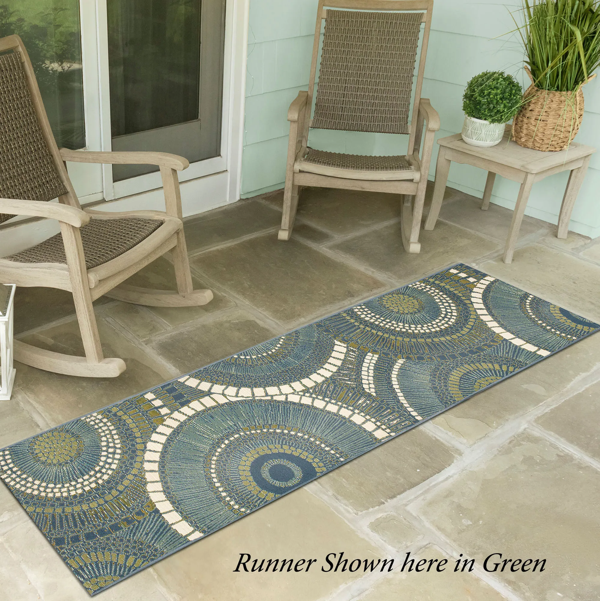 A mosaic pattern of dots, lines, and squares creates the retro designs on the Marina Circles Indoor/Outdoor Rug. Power-loomed polypropylene/polyester area rug, .12" thick, is flat-woven with a low profile, weather-resistant, and UV-stabilized for enhanced fade resistance. Area rug is durable and ideal for high-traffic areas. Vermillion includes hues of vermillion, brick red, gray, blue, and sunset colors. Blue includes shades of blue, denim, navy, and ivory. Brown has brown, mocha, ivory, tan, and chocolate. Green has moss green, denim, ivory, and navy shades. Outdoor seasonal use; do not expose this rug to freezing temperatures. Spot clean and rinse with a garden hose; for stubborn stains, we recommend professional cleaning by a rug cleaner. Imported.