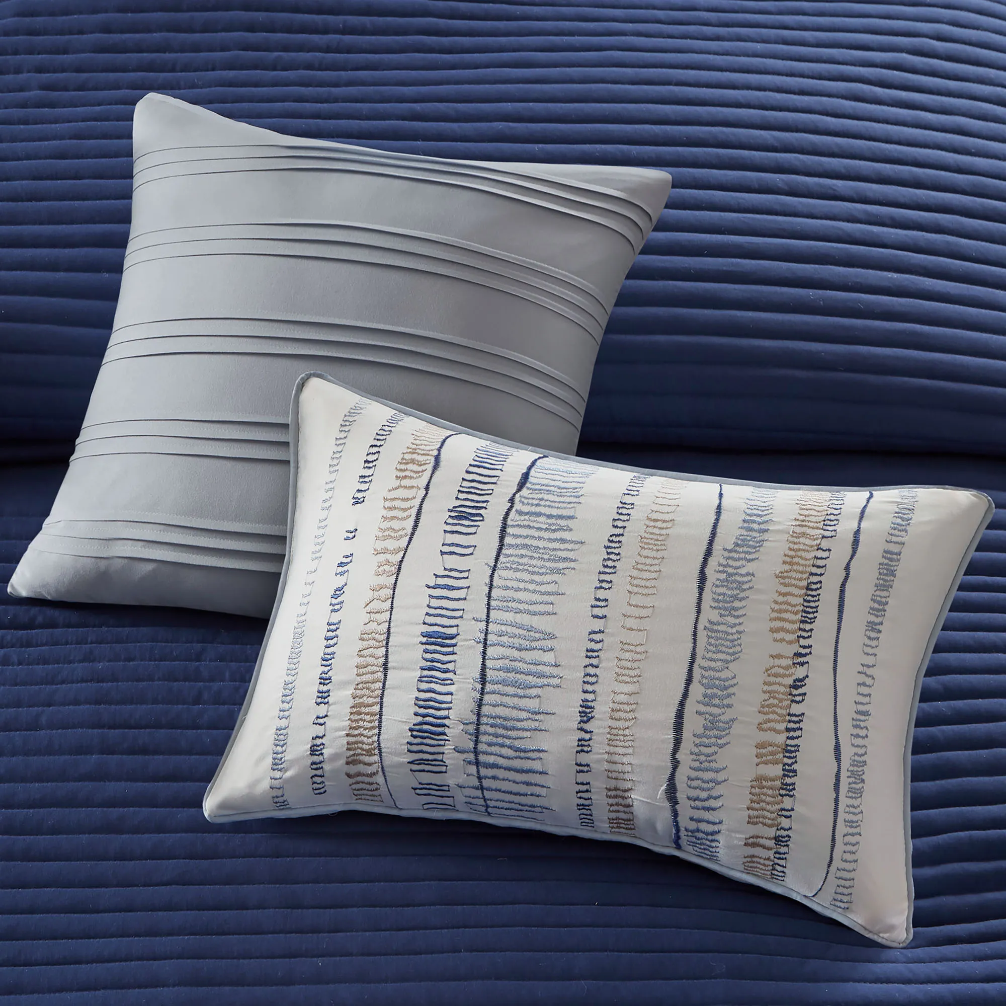 Pillows have piped edges; spot clean. Square pillow is gray with pleats. Rectangle pillow is off-white embroidered with blue and dark beige contemporary stripes.