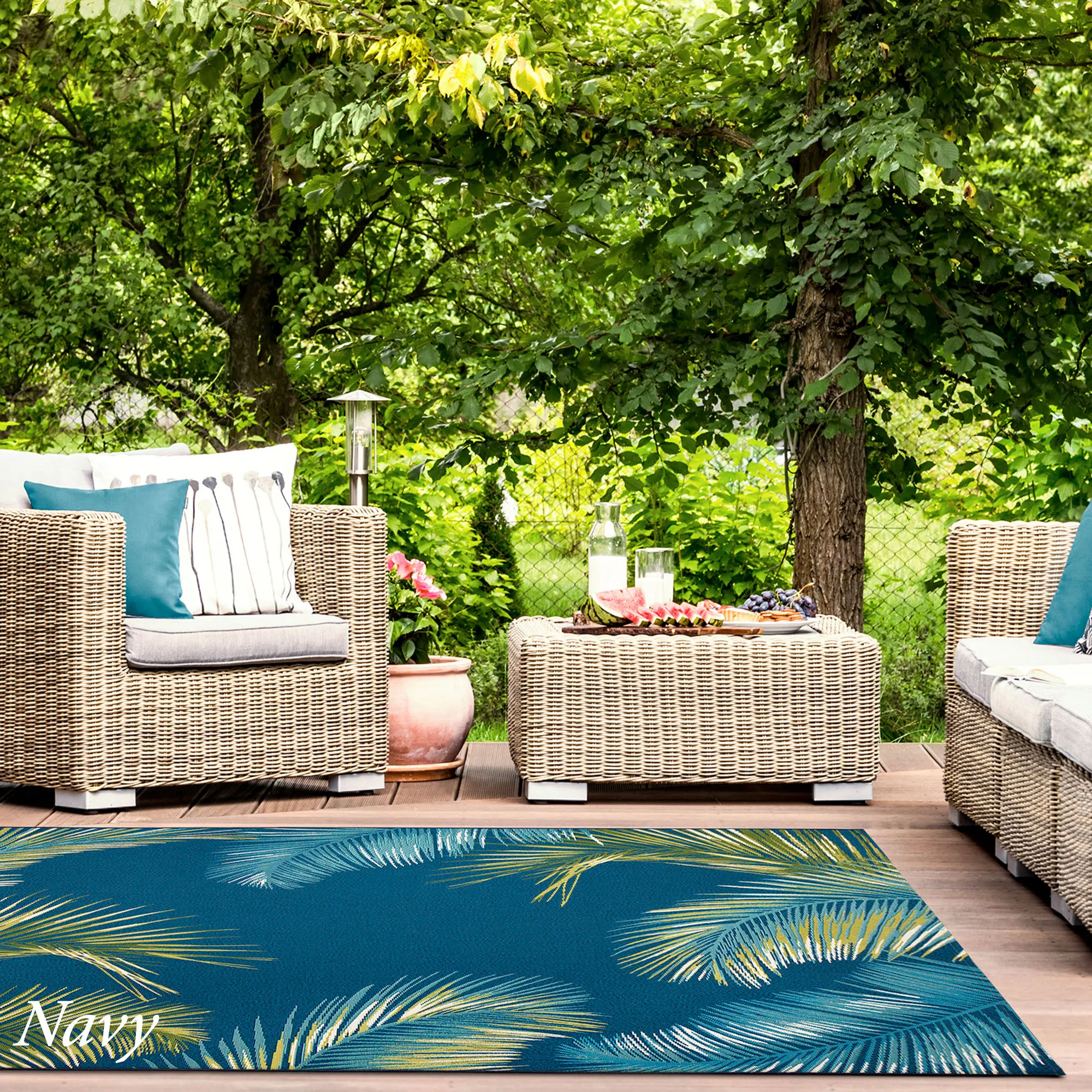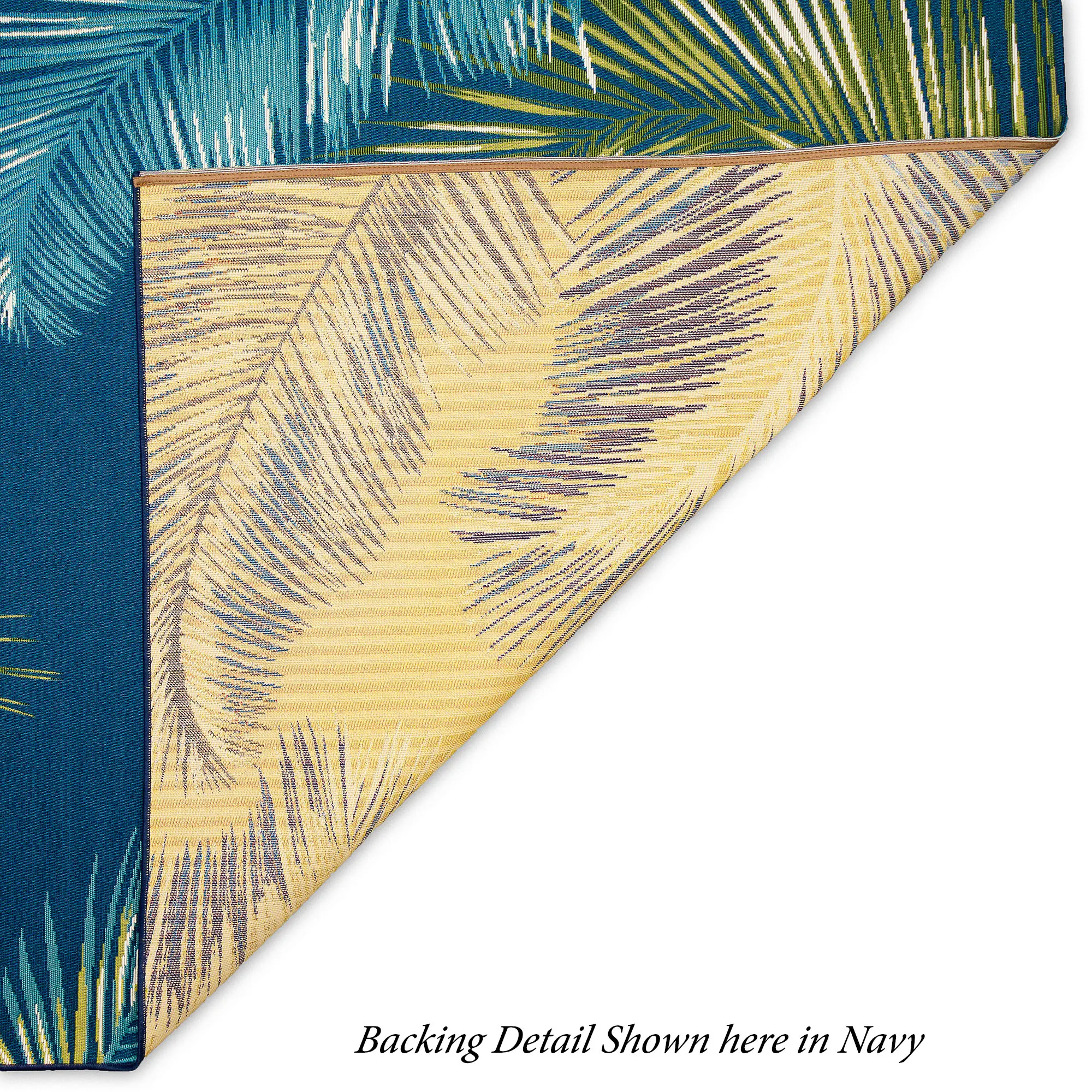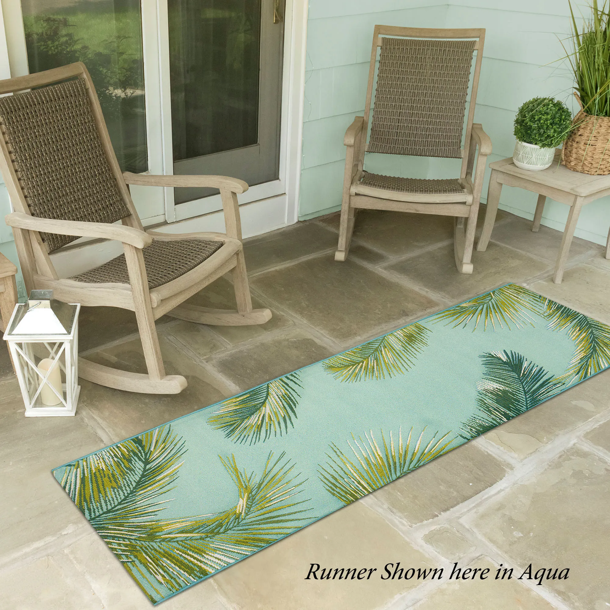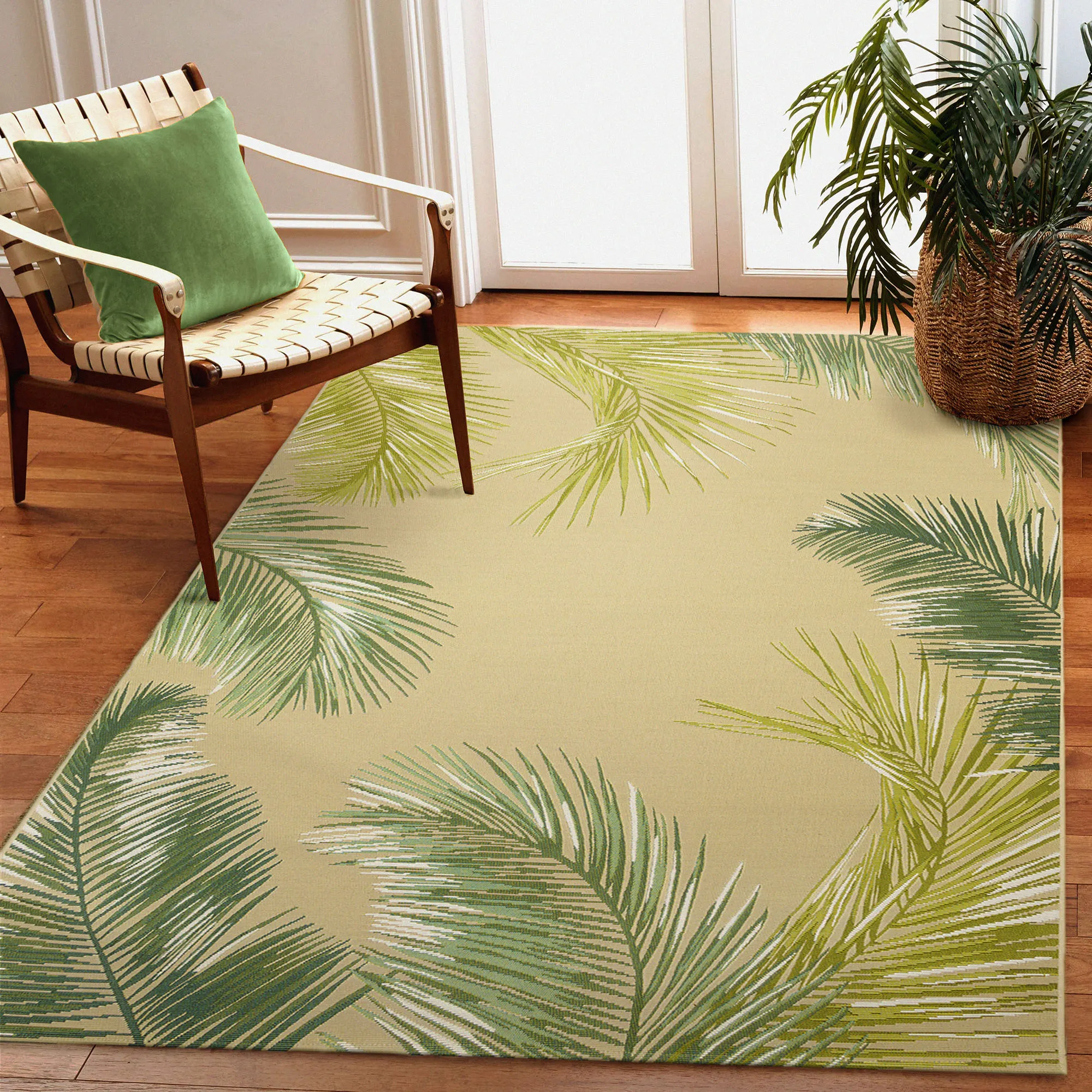 Lush tropical leaves look beautiful on the Marina Palm Border Indoor/Outdoor Rug. Power-loomed, flat-woven, polypropylene/polyester area rug, .12" thick, has a low profile, is weather-resistant, and is UV-stabilized for enhanced fade resistance. Designed by Liora Manne, this durable rug features a palm leaf border and a solid color field. Rug may be used indoors or outdoors seasonally; do not expose this item to freezing temperatures. Spot clean and rinse with a garden hose; for stubborn stains, we recommend professional cleaning by a rug cleaner. Imported.