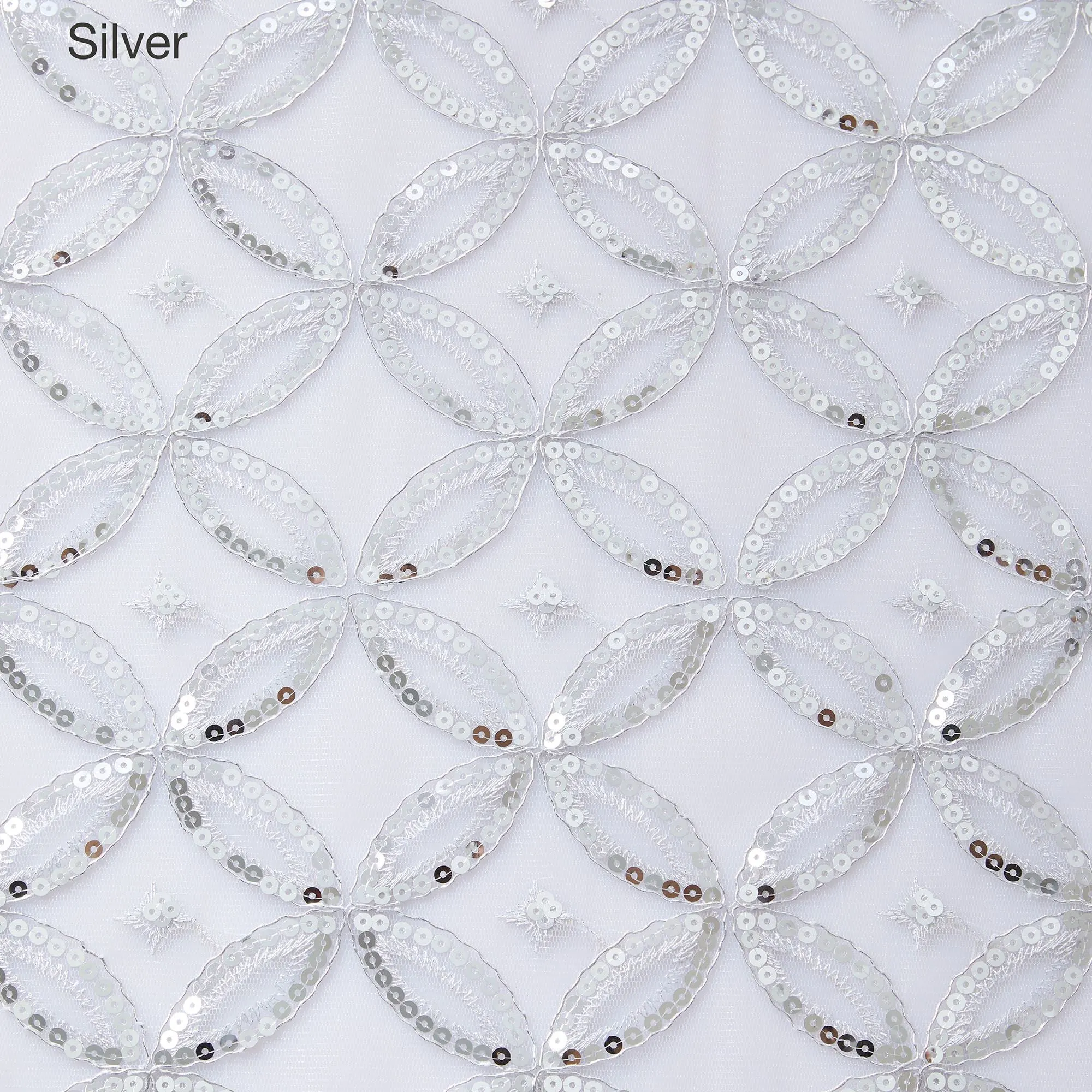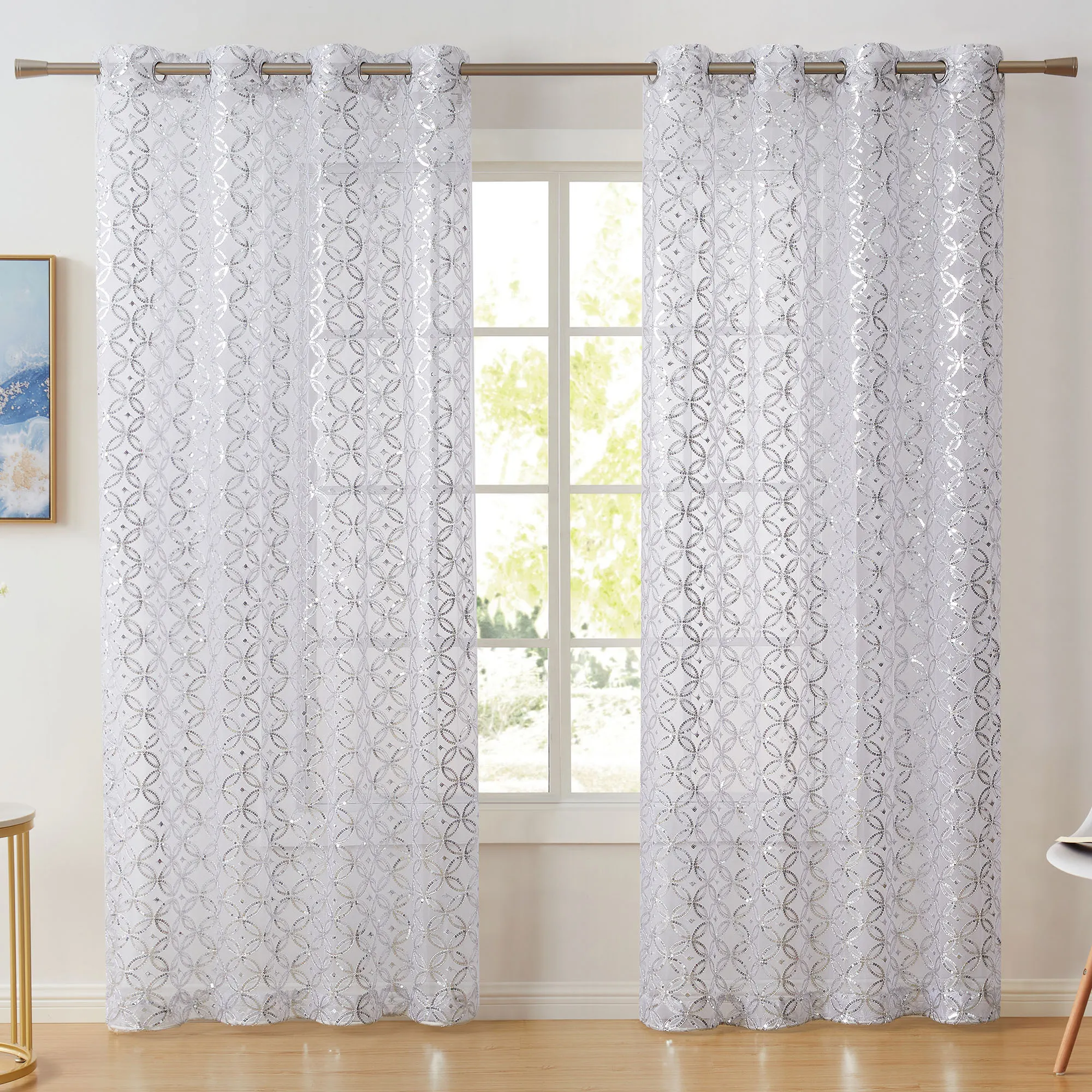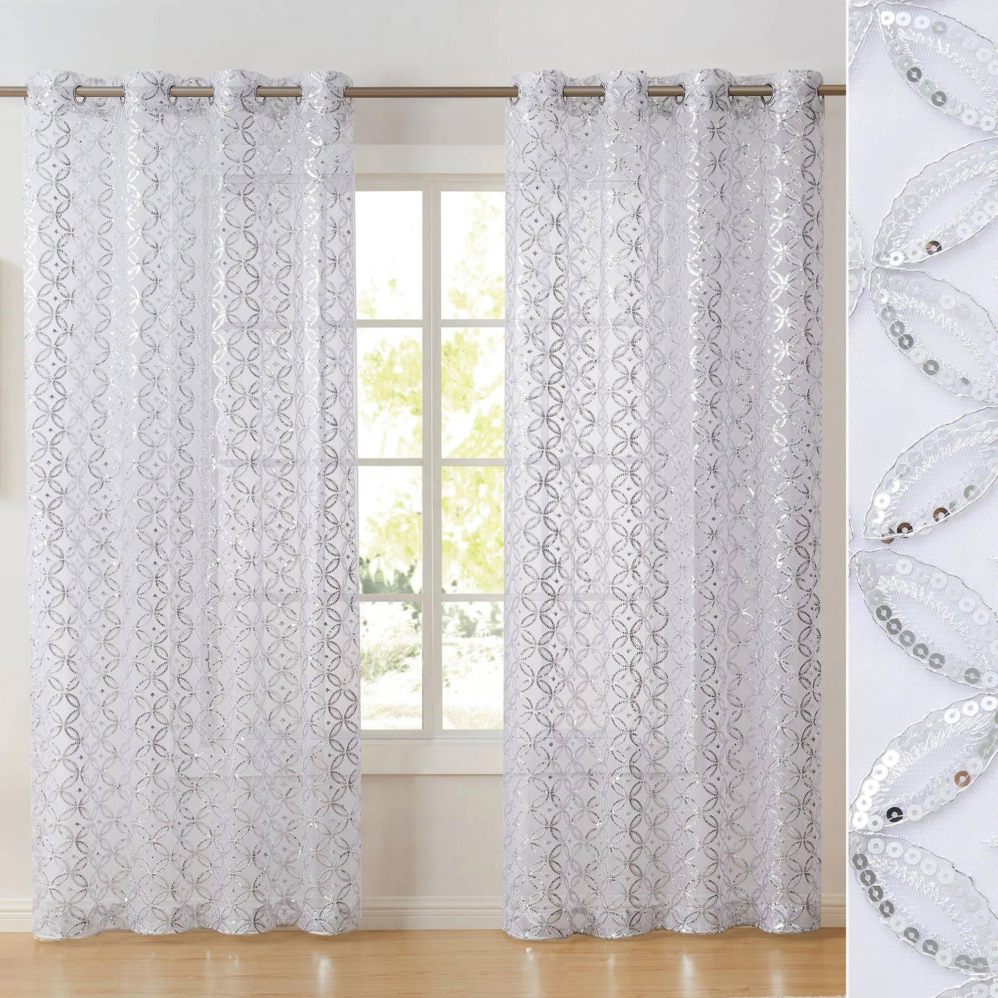 Metallic embroidery and sequins create the glamorous geometric pattern on the Marinette Grommet Curtain Pair. This sheer, mesh-like polyester lace window treatment has an interlocking circular pattern and metal grommets, 1.5" dia., finished in silver. Wide curtain pair is 106"Wx84"L. Hand wash. Imported.