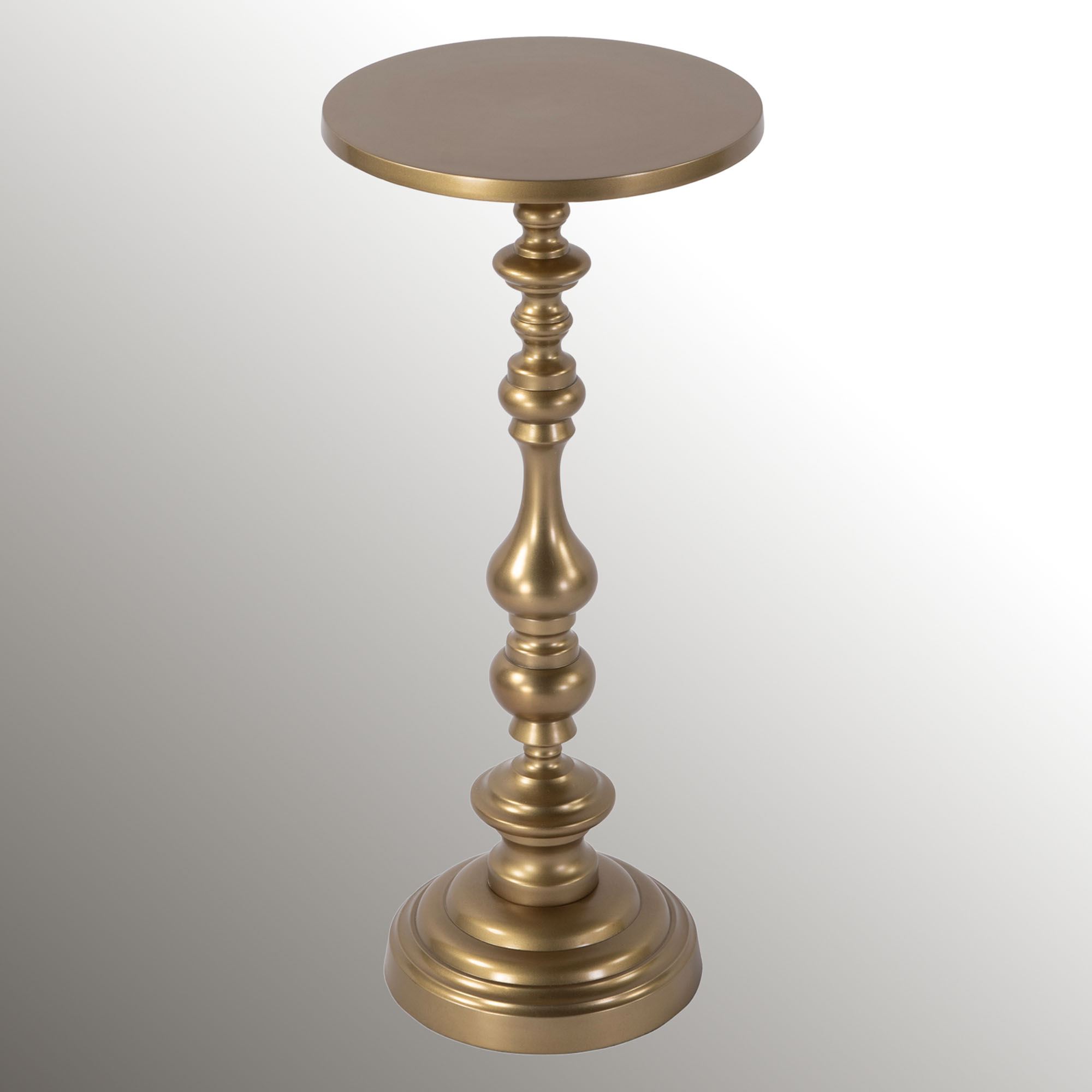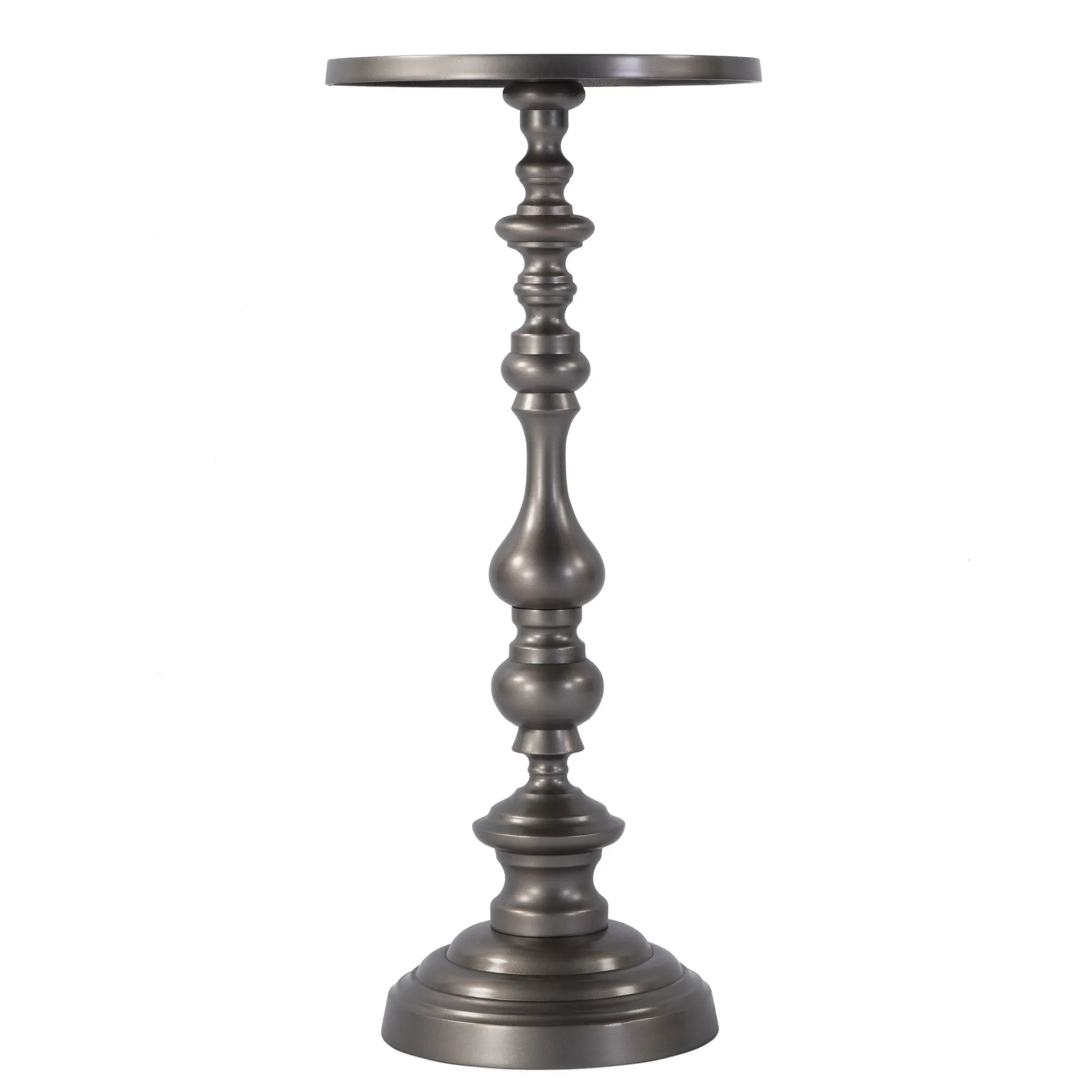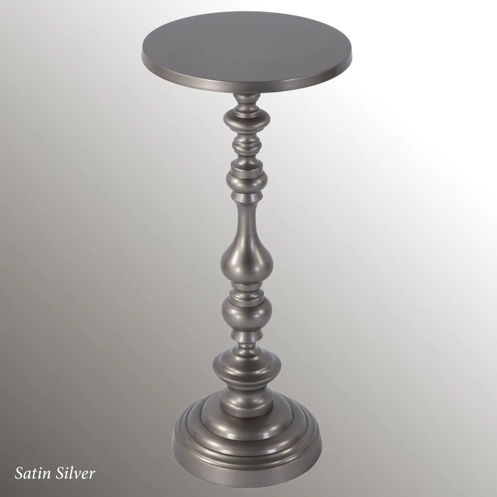 The Mario Pedestal Table from Butler Specialty is perfect for those with grand tastes in small spaces. Crafted from aluminum for a lightweight, sturdy construction, the table features a pedestal base, unique spindle-like support, and round tabletop. A satin powder-coat hue provides a durable finish. Overall, the accent table measures 10"dia.x22.5"H.