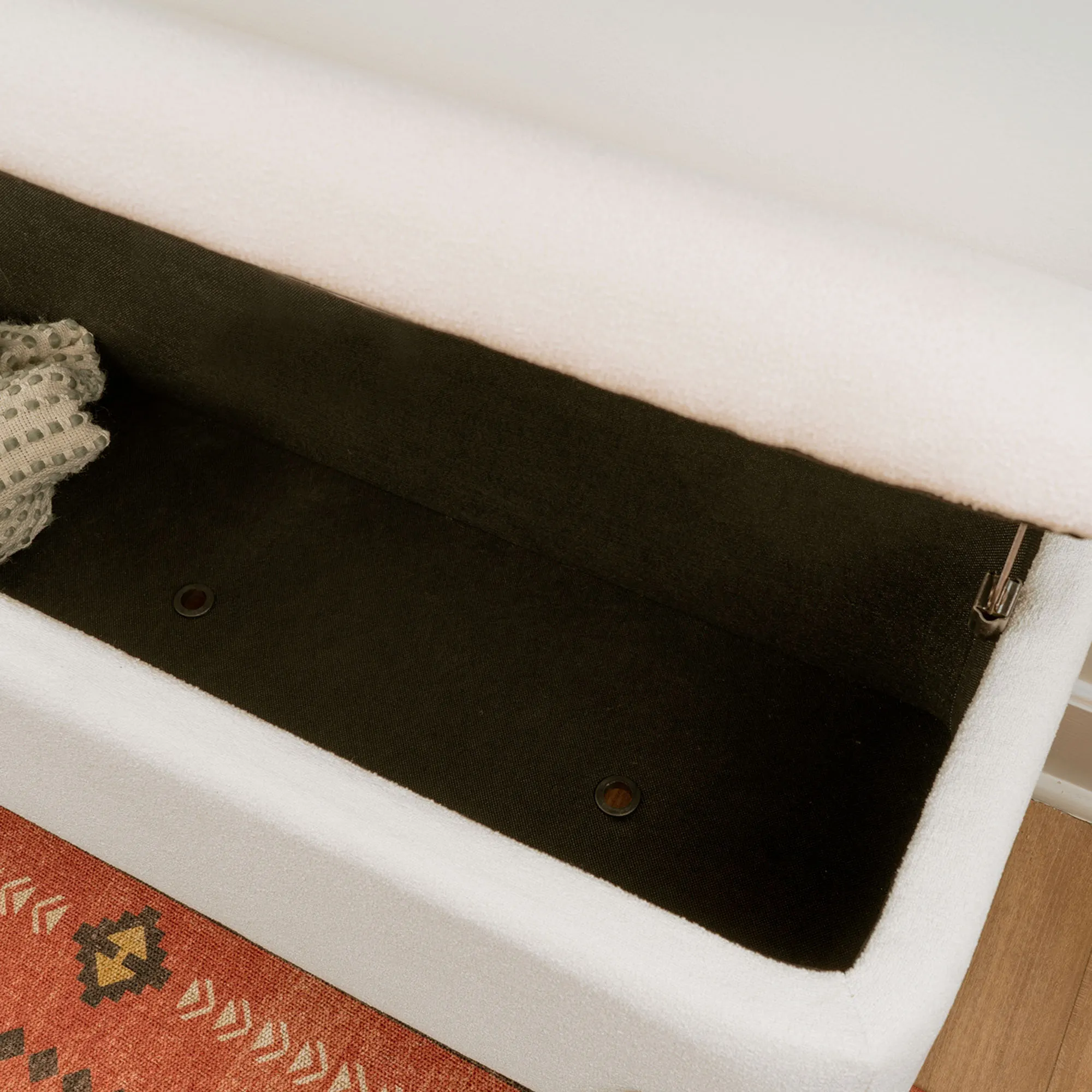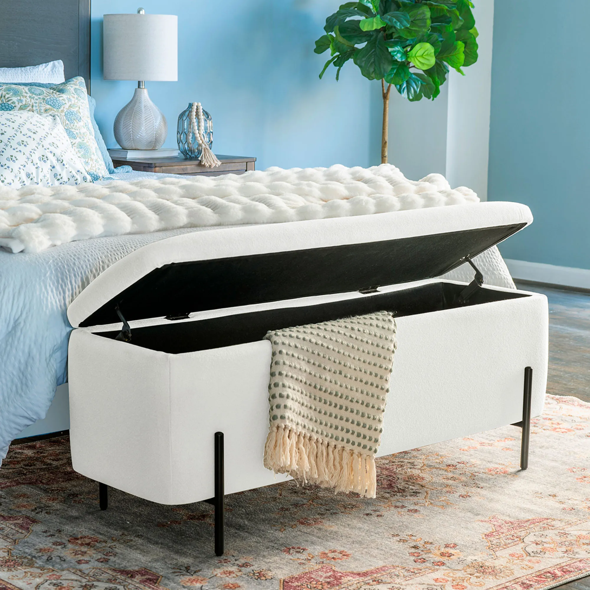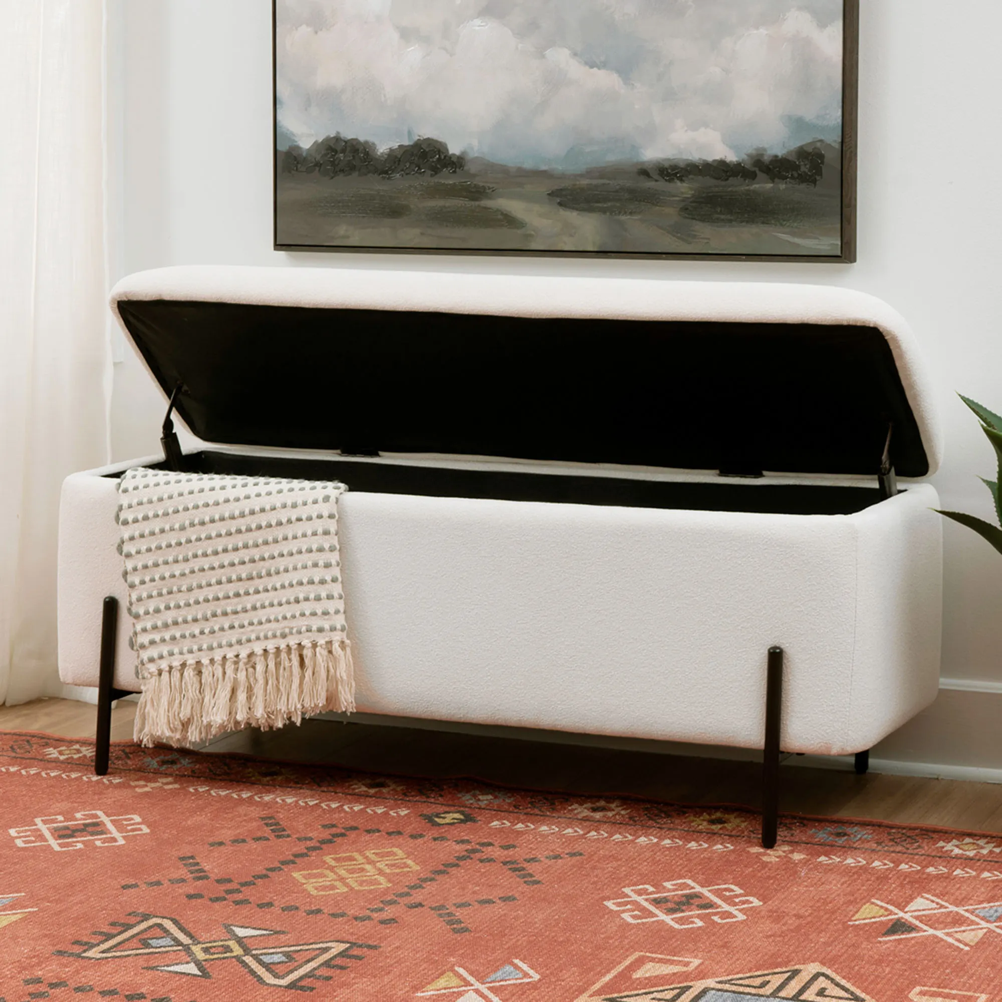 The Marlo Upholstered Storage Bench adds functionality, style, and subtle texture to your space. Perfect for storing extra blankets, clutter, or pillows, the bench features an off-white boucle polyester upholstered design that opens with a flip-top lid on locking hinges. Complete with a durable powder-coat finish, the black metal legs add a chic contrast. Maximum recommended weight is 400 lbs. Overall, the storage bench measures 47"Wx16.5"Dx20"H and weighs approx. 33 lbs. Spot clean the fabric.