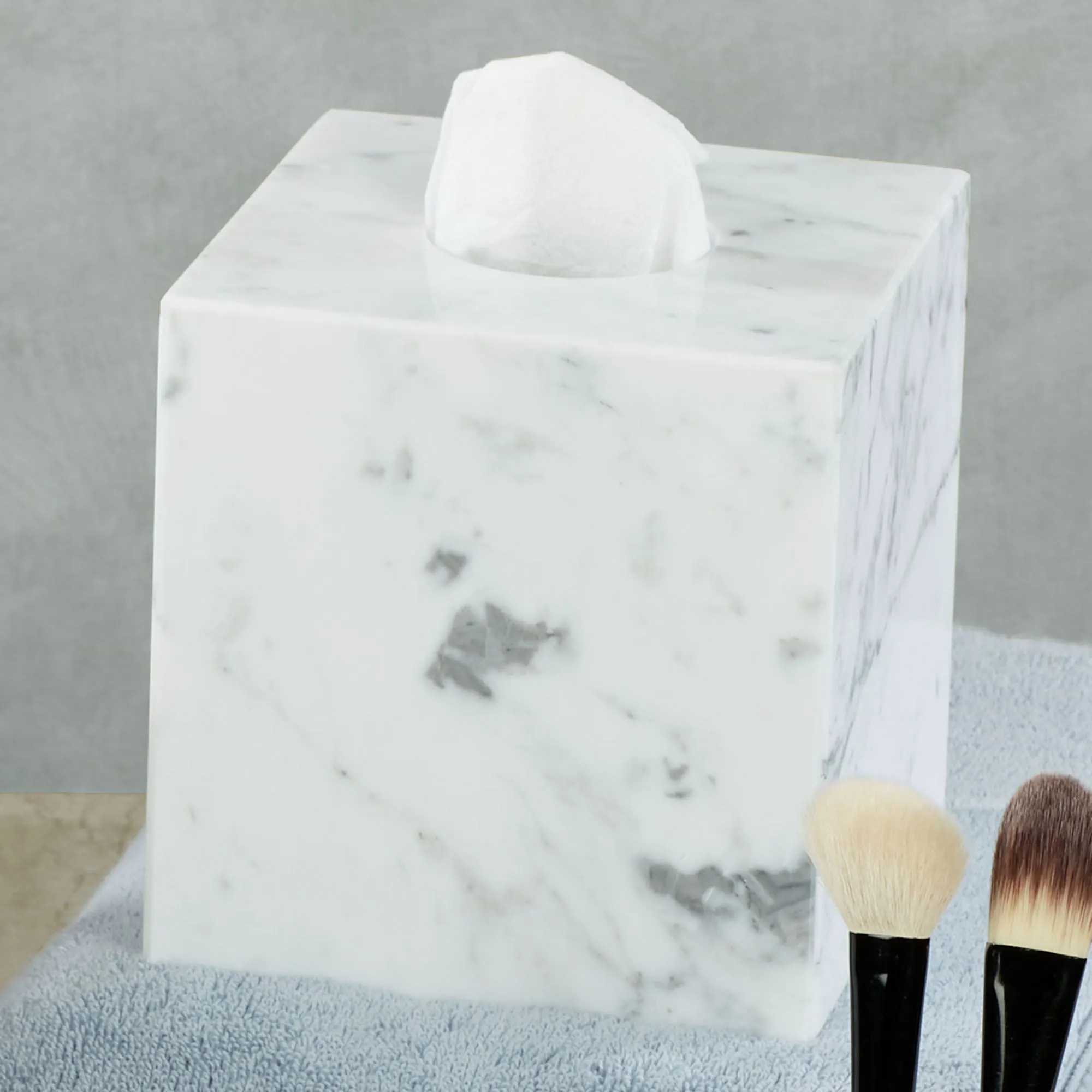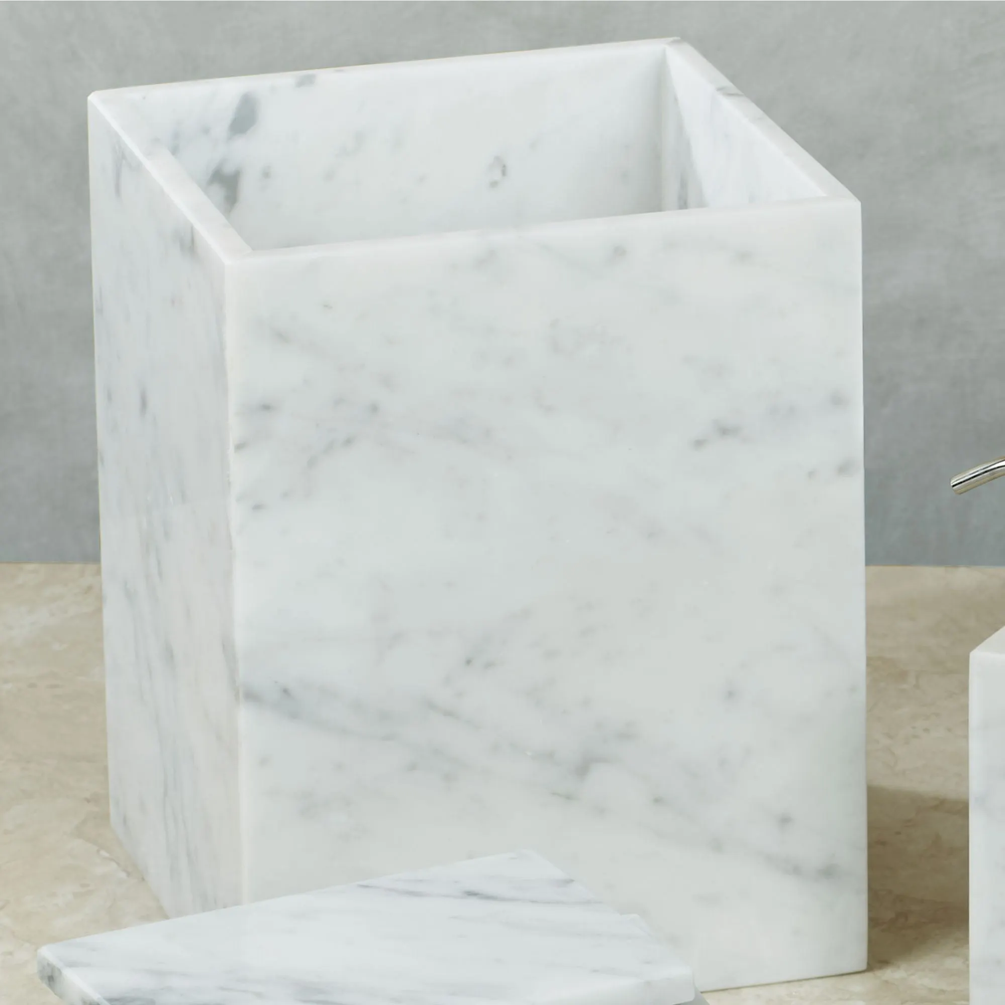 Elegantly crafted from Italian marble, the Marmol Bath Accessories look stunning. These classic bath essentials have a gray design on ivory. Slight color variations may occur. Brush Holder will hold makeup brushes or toothbrushes. Tumbler has a square base and includes a clear glass cup. Specify Wastebasket, Tray, Lotion/Soap Dispenser, Tissue Cover, Vanity Box, Covered Jar, Brush Holder, Tumbler, or Soap Dish.