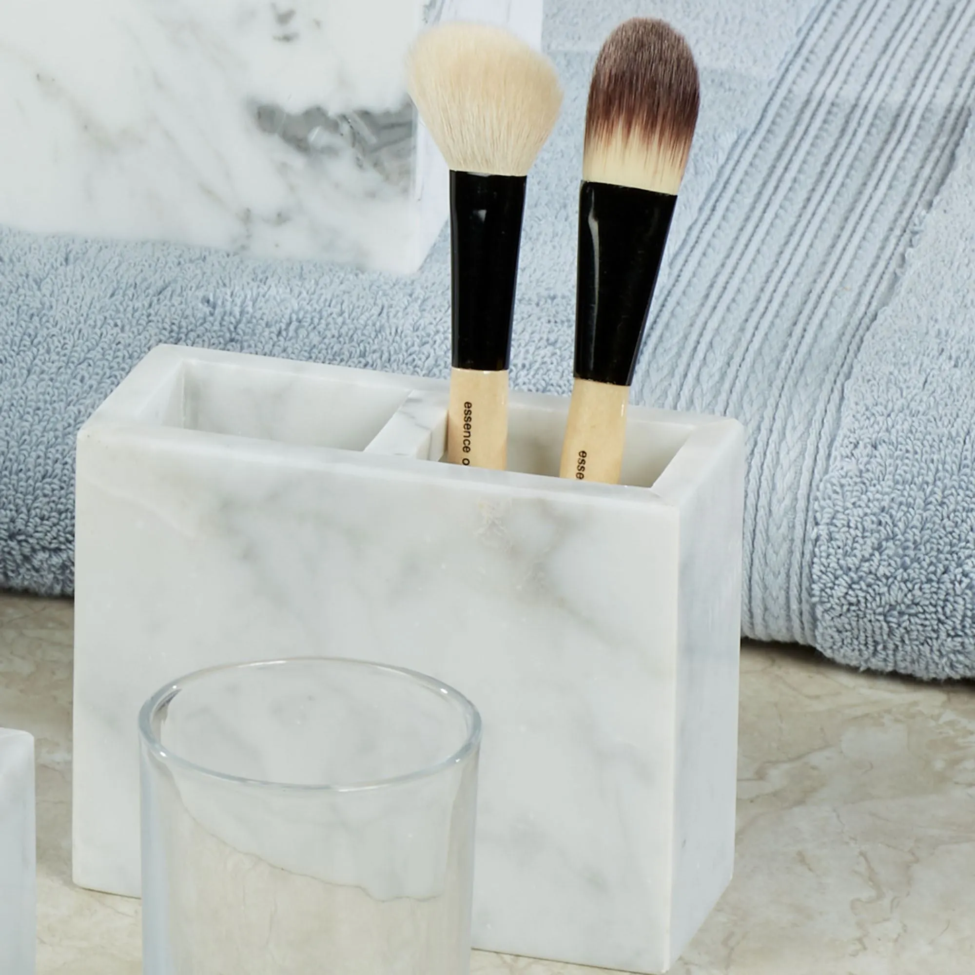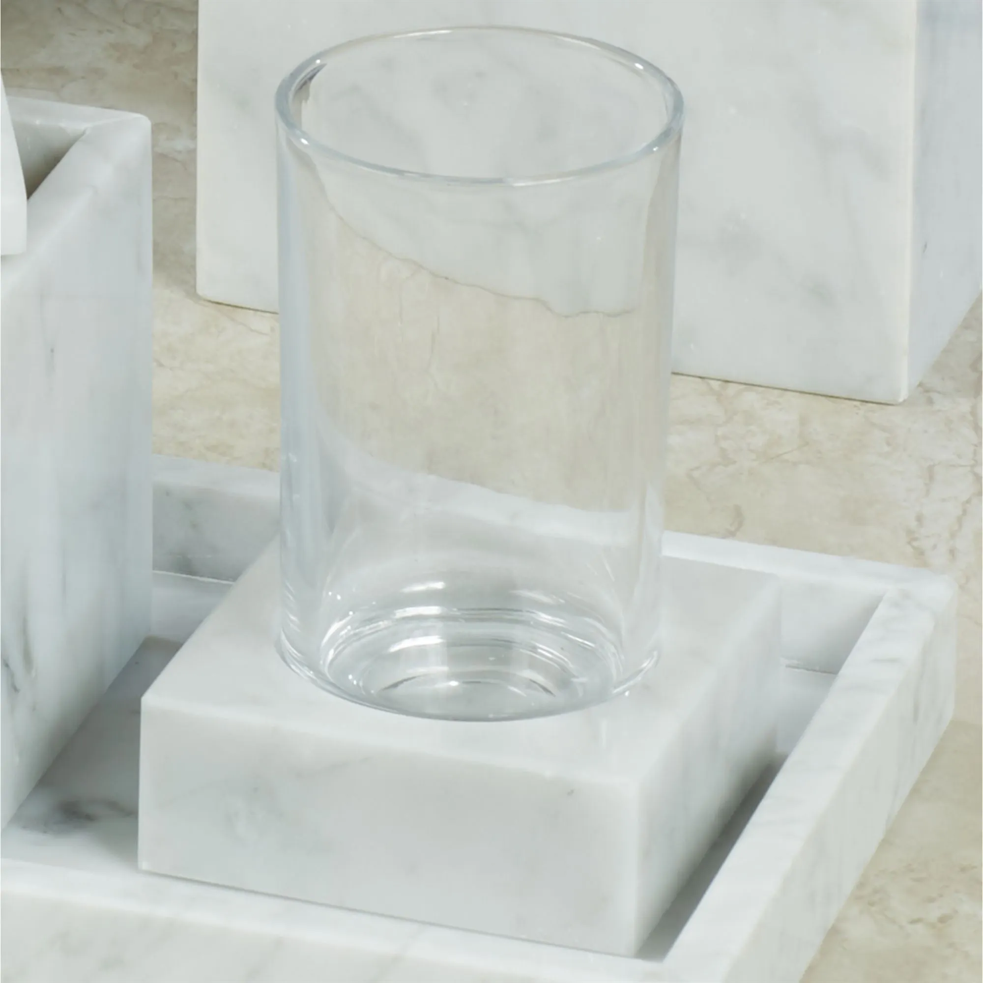 The Marmol Bath Accessories are made from Italian marble. Tumbler has a clear glass.