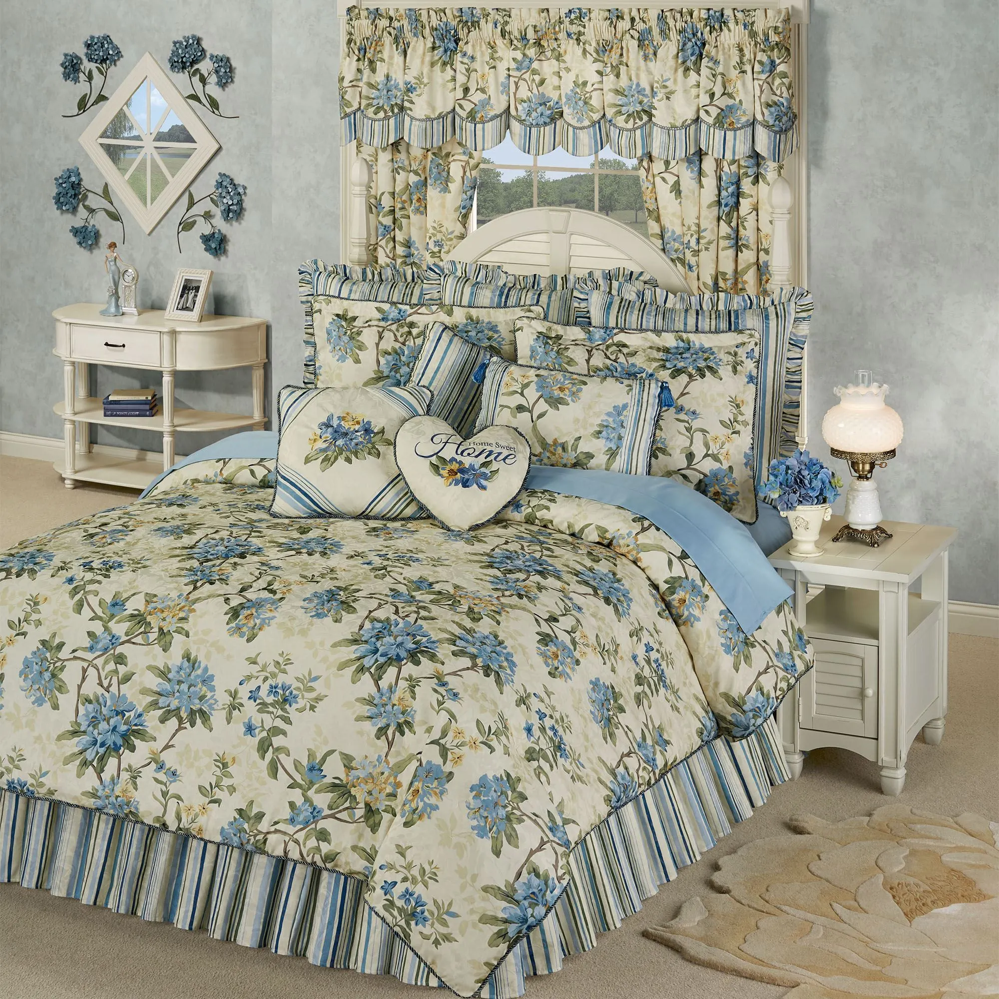 The cheerful Marquette Floral Comforter Bedding blooms with garden delight. This jacquard-woven polyester ensemble has a fresh style with its charming floral and stripe prints. Colors include shades of blue, caramel, golden yellow, brown, green, and buttercream.