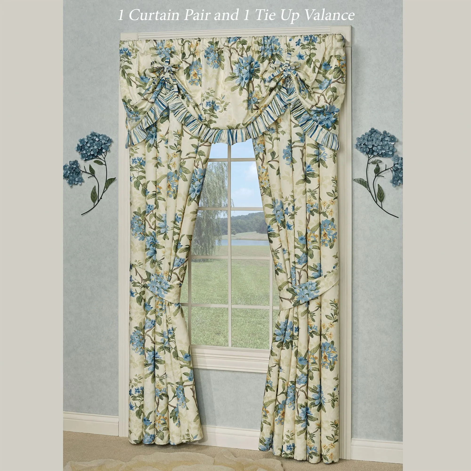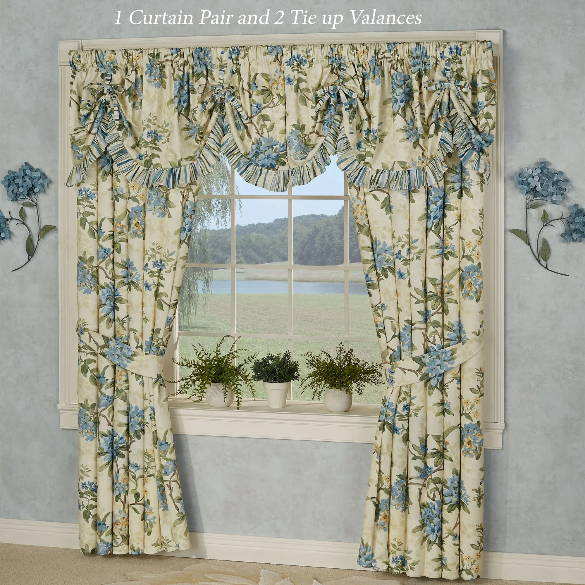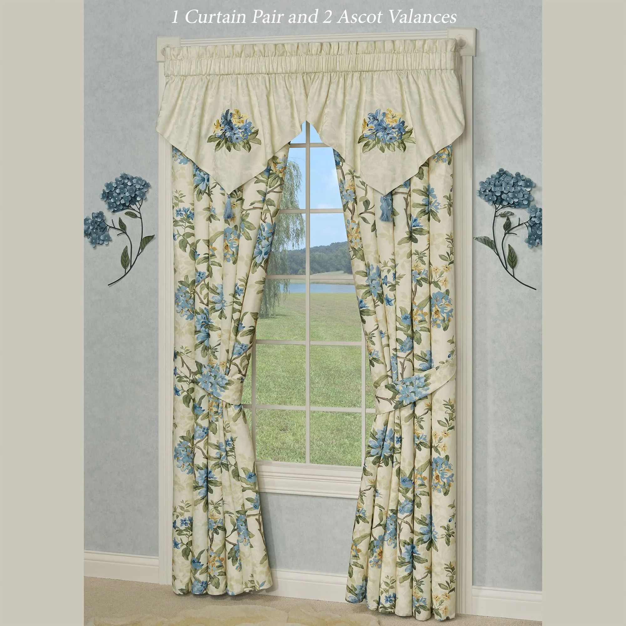 Lined Window Treatments have 2.5" rod pockets. Tailored Curtains have florals and include tiebacks. Each Ascot Valance has embroidered florals and a 4"L end tassel. The Scalloped Valance has florals pieced with stripes and gimp trim. The Tie-Up Valance has florals pieced with a striped ruffle and 26"L ties.