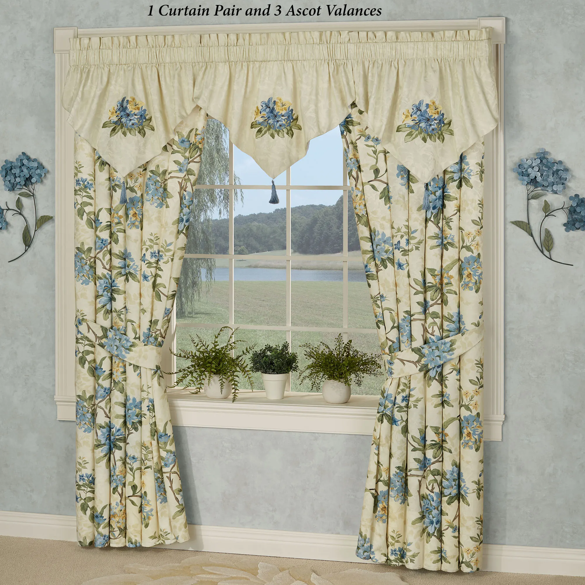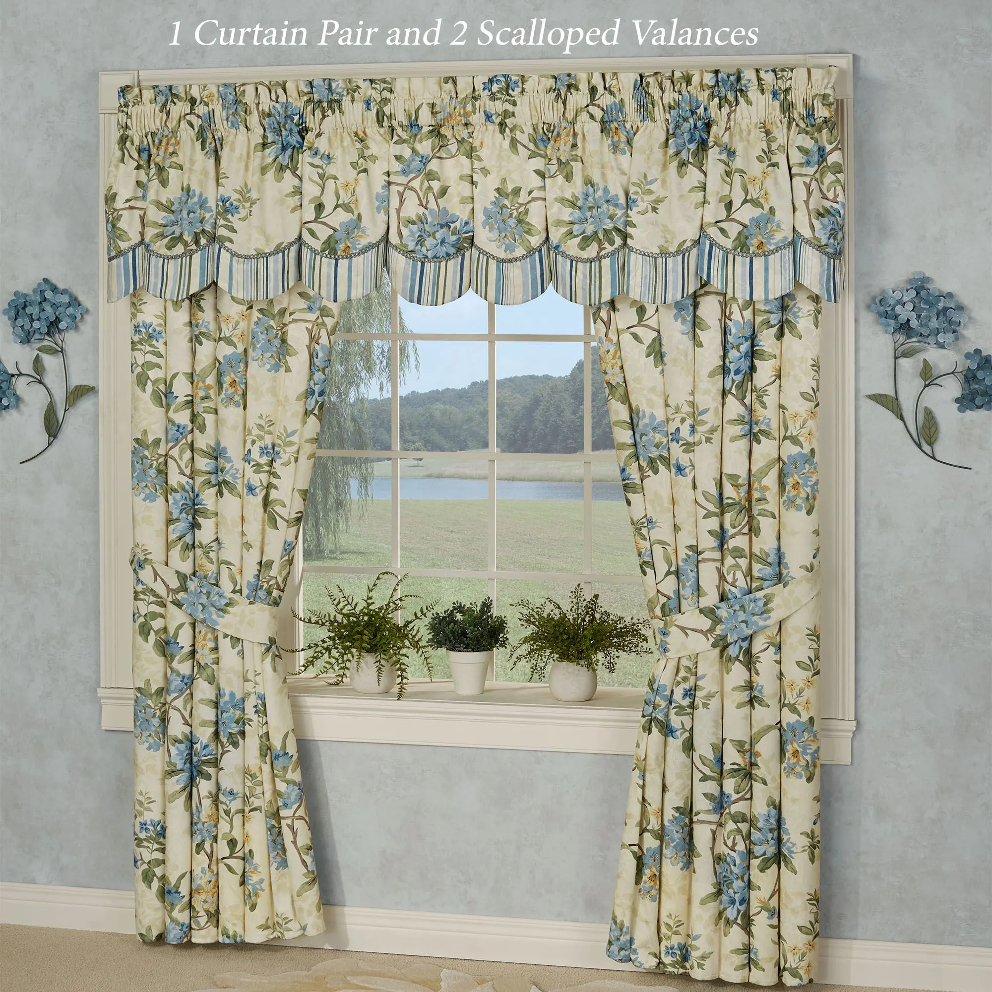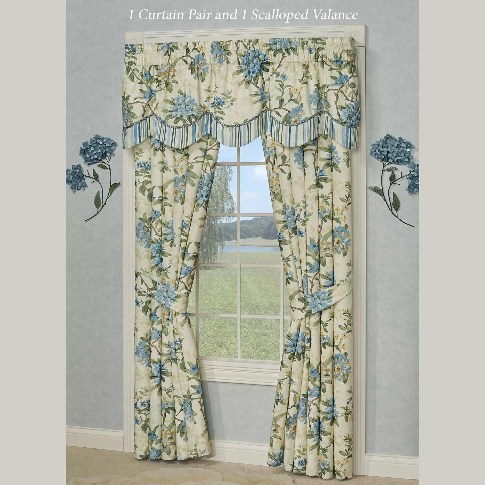 Lined Window Treatments have 2.5" rod pockets. Tailored Curtains have florals and include tiebacks. Each Ascot Valance has embroidered florals and a 4"L end tassel. The Scalloped Valance has florals pieced with stripes and gimp trim. The Tie-Up Valance has florals pieced with a striped ruffle and 26"L ties.