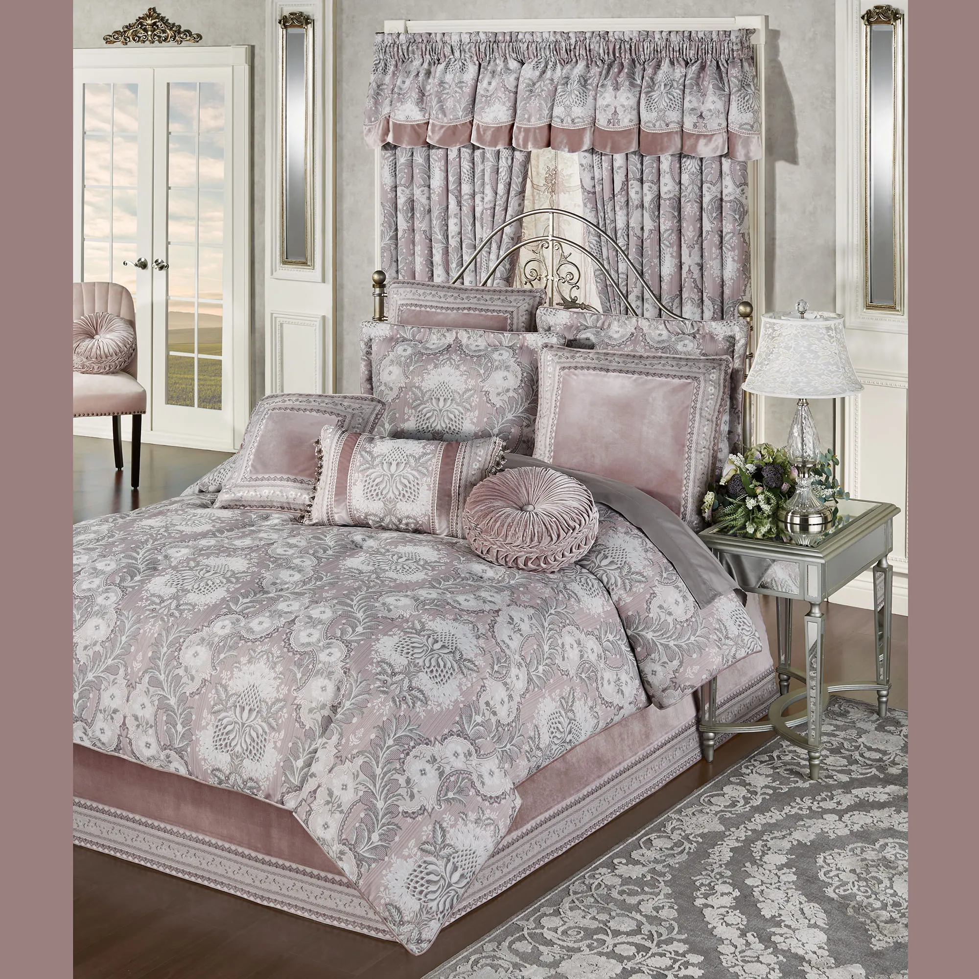 Whisk your dreams away to Marseille with this bedding, an exclusive Touch of Class(R) design by J. Queen New York. Jacquard-woven with brilliant detail, the polyester ensemble features Victorian rose, dark gray, gray, and ivory exquisite acanthus leaves and florals across a dusky orchid and lilac striated ground. Soft lilac velveteen and coordinating jacquard-woven trim complete the design with grace.