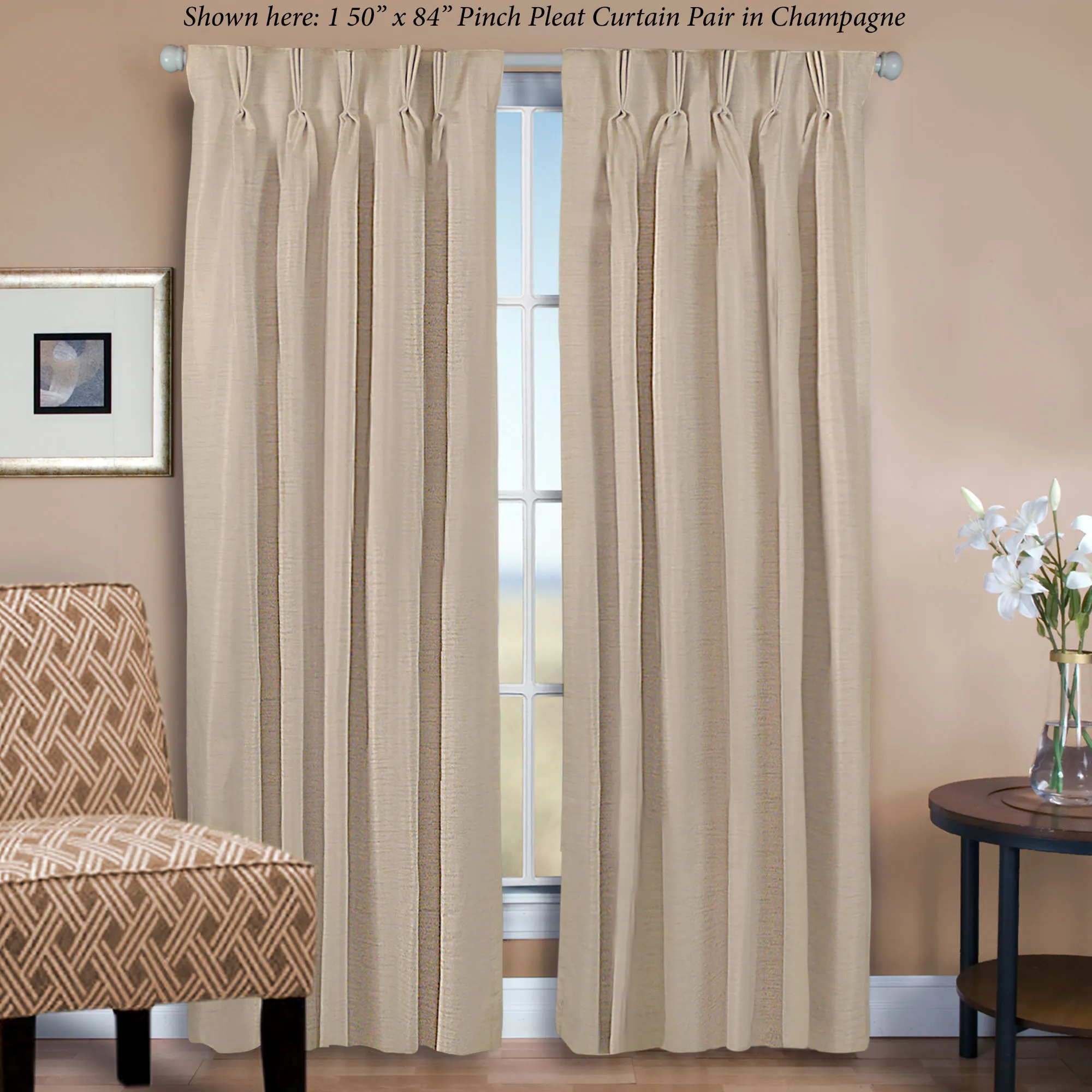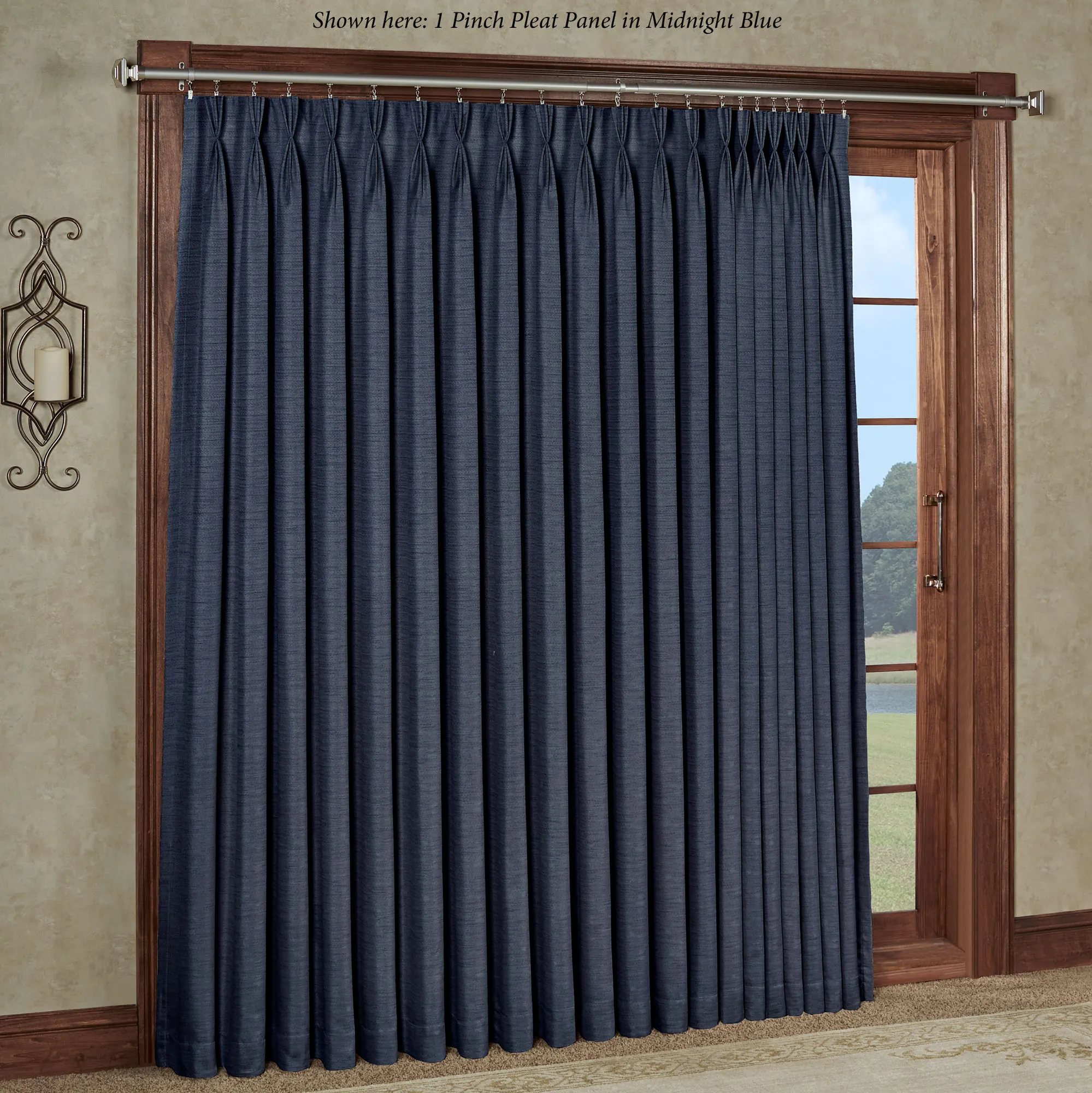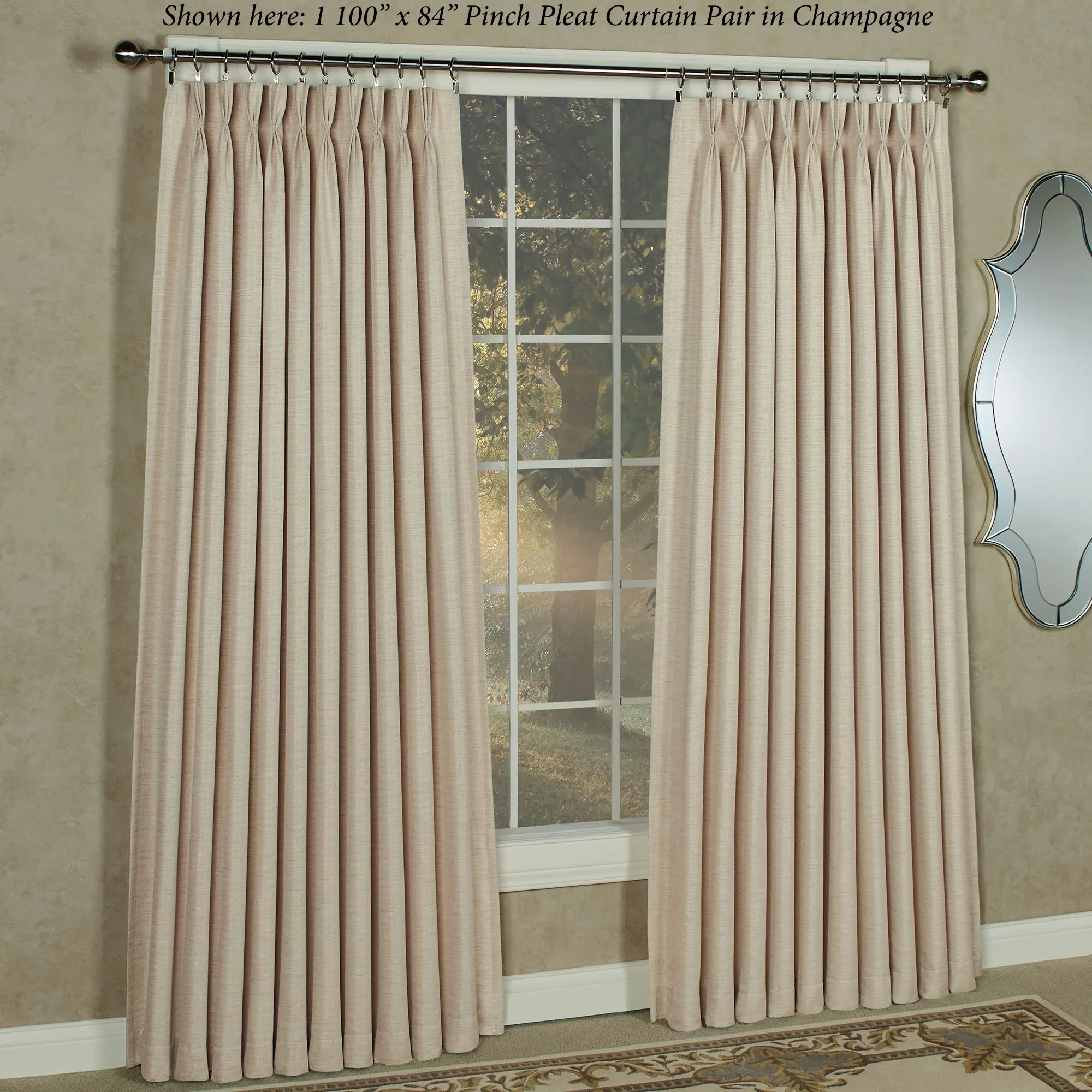Coordinate any decorating style with the Marshfield Pinch Pleat Patio Panel. Made of woven polyester with a slight sheen, this energy-efficient patio panel has a heavyweight brushed white lining and corner weights in the bottom hem. Patio panel filters light and reduces noise. Hang this panel via your 22 clip rings; panel can also be hung using the hidden 3" back tabs. Patio panel, 100"W, has 20 pinch pleats or 21 back tabs. Specify Champagne, exclusive Gold (84"L only), Gray, Midnight Blue, Off-White, Parchment, or Sage. Machine washable. Imported.
