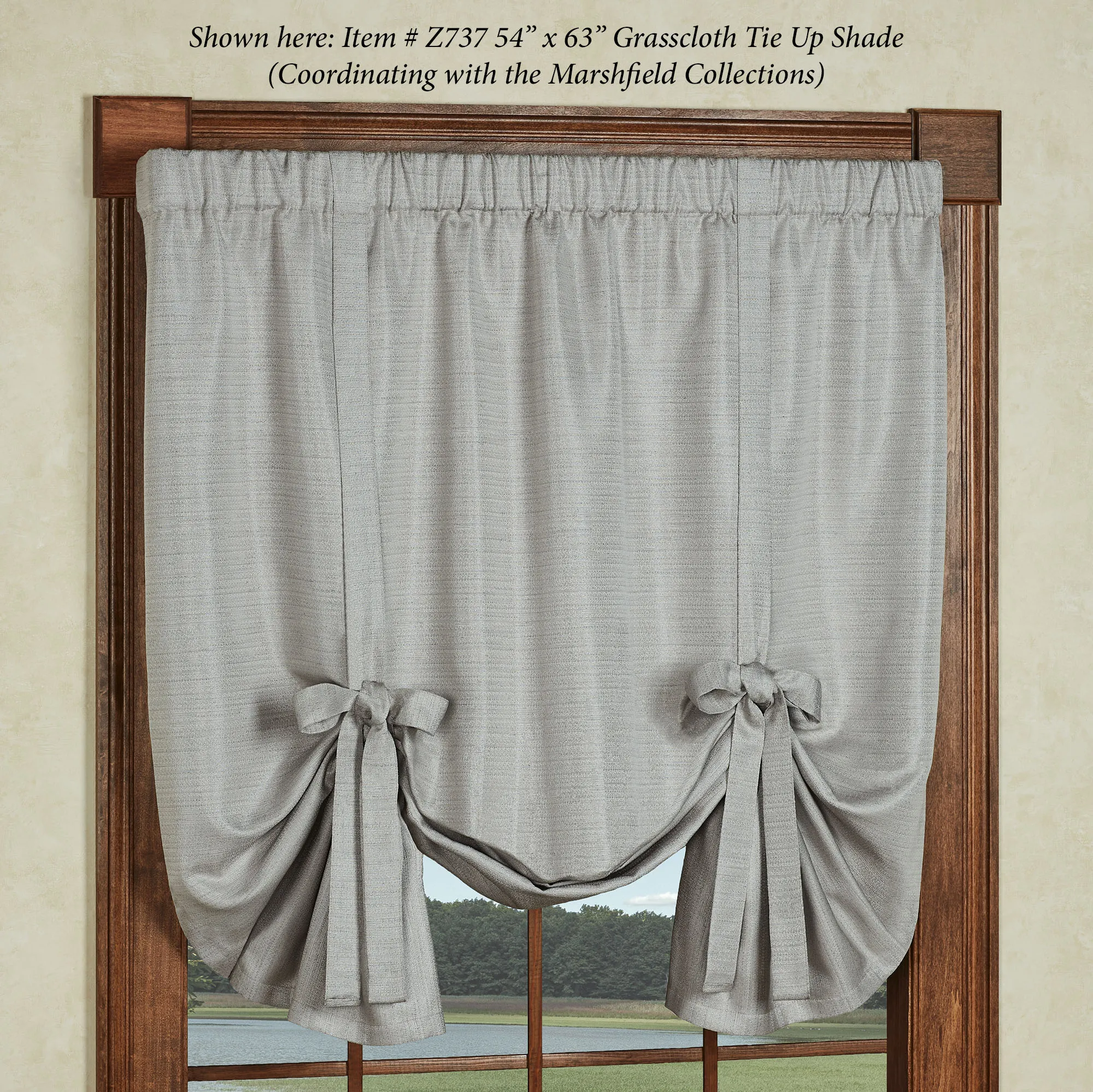 The Grasscloth Tie-Up Shade has a 3" rod pocket and is 54"Wx63"L.