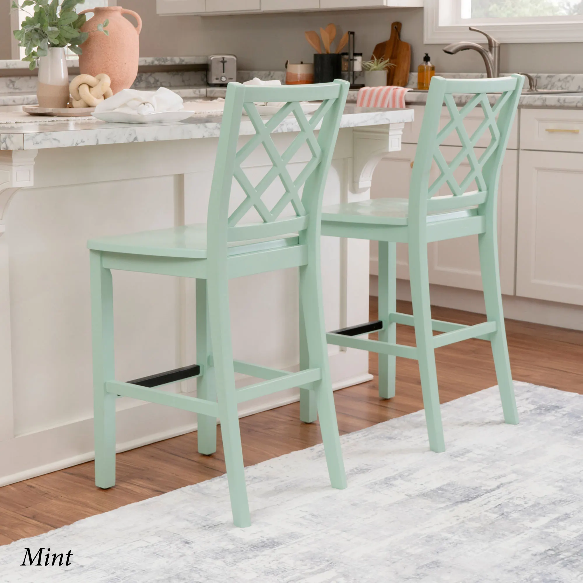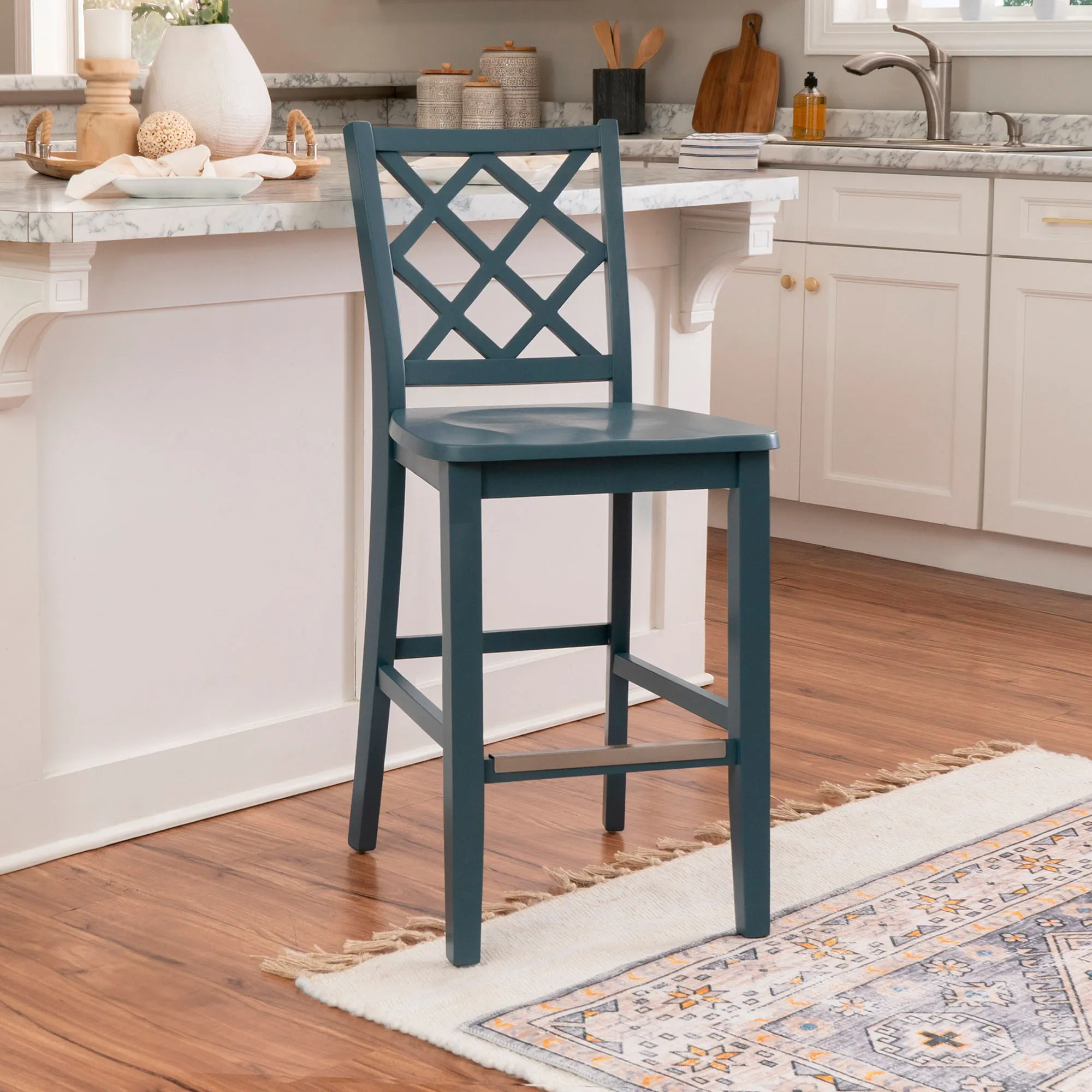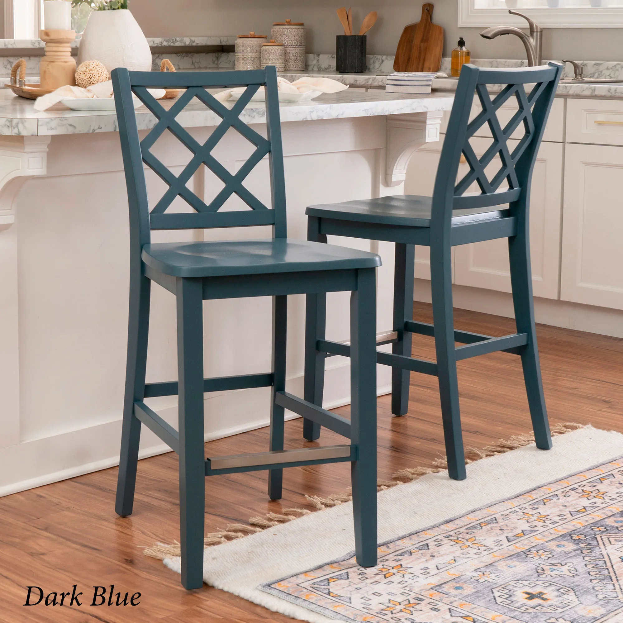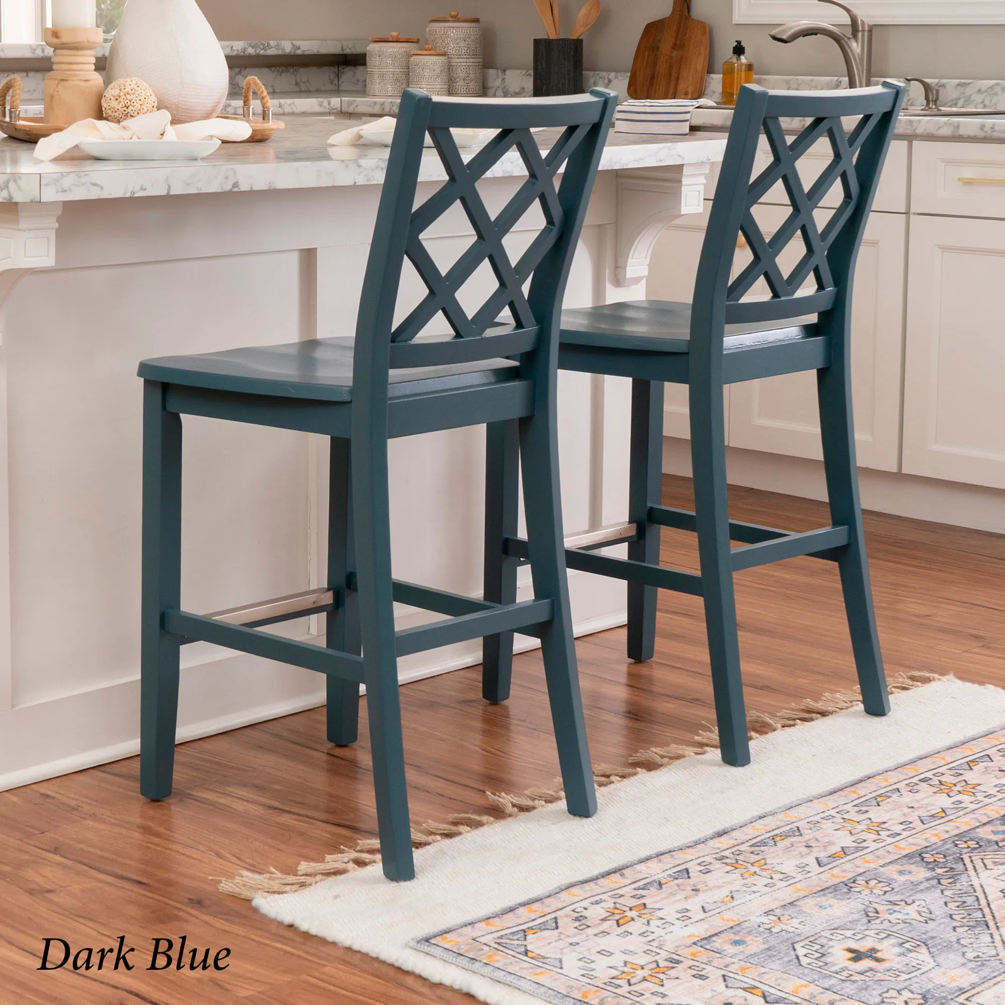 Take a seat in style with the Martelle Counter Stool. Finished in a bold solid color hue, the wood stool features long sleek lines, an open latticework back, a smooth seat, and convenient footrests. The front footrest has a protective metal kick plate; White and Mint have a matte black accent; Dark Blue and Gray have a pewter-finished design. Maximum recommended weight is 350 lbs. Seat-to-floor height is 25.5". Perfect for kitchen islands, counters, or tables measuring 35"H to 39"H, the counter-height chair measures 18"Wx21.5"Dx40.5"H overall and weighs approx. 18 lbs.
