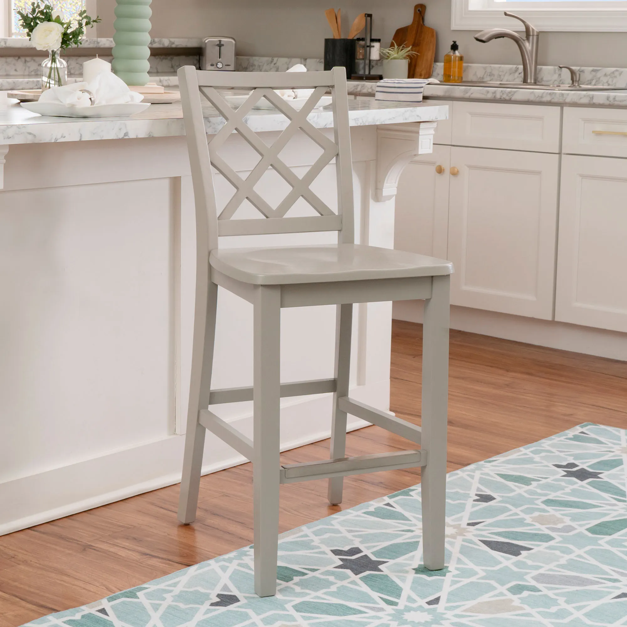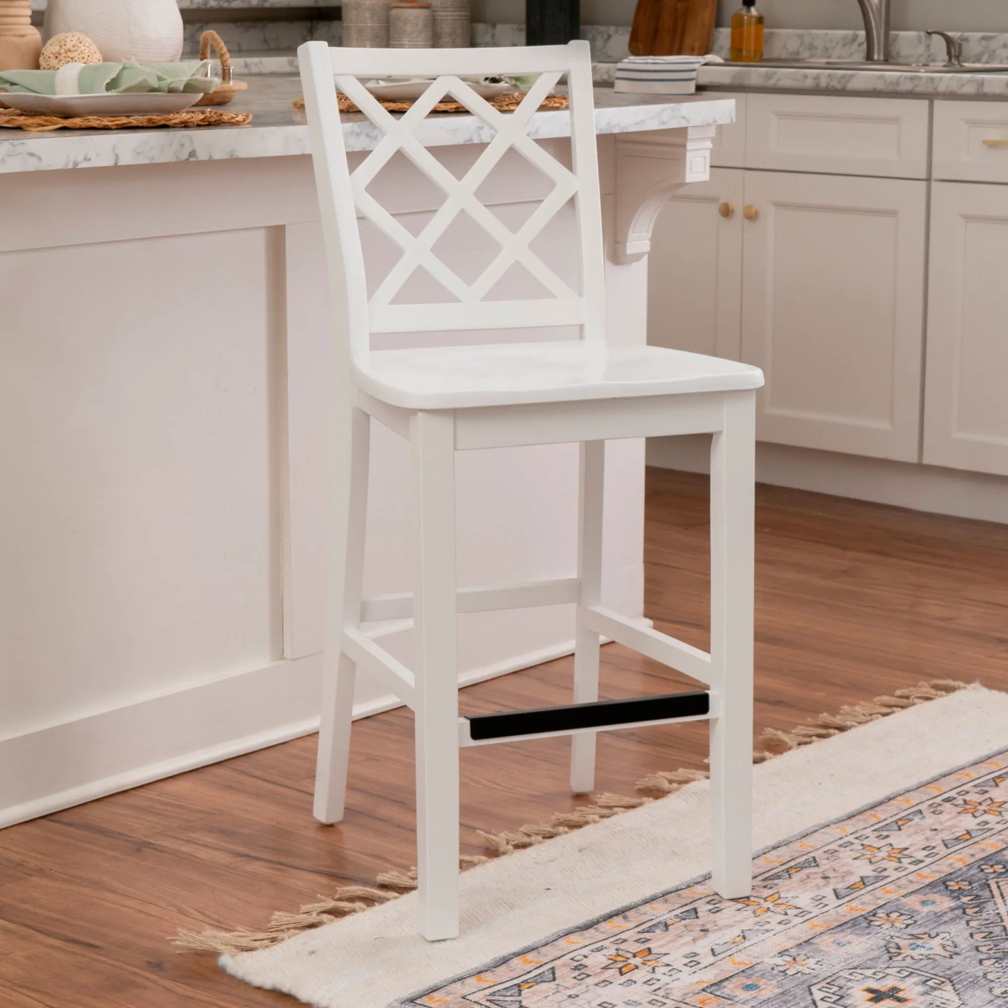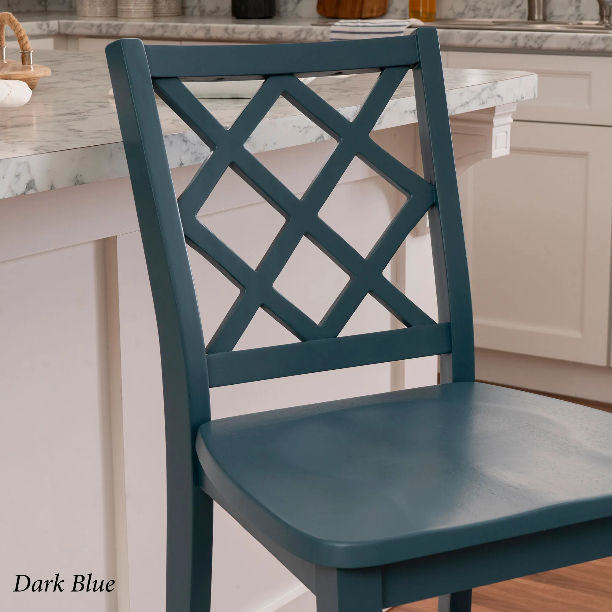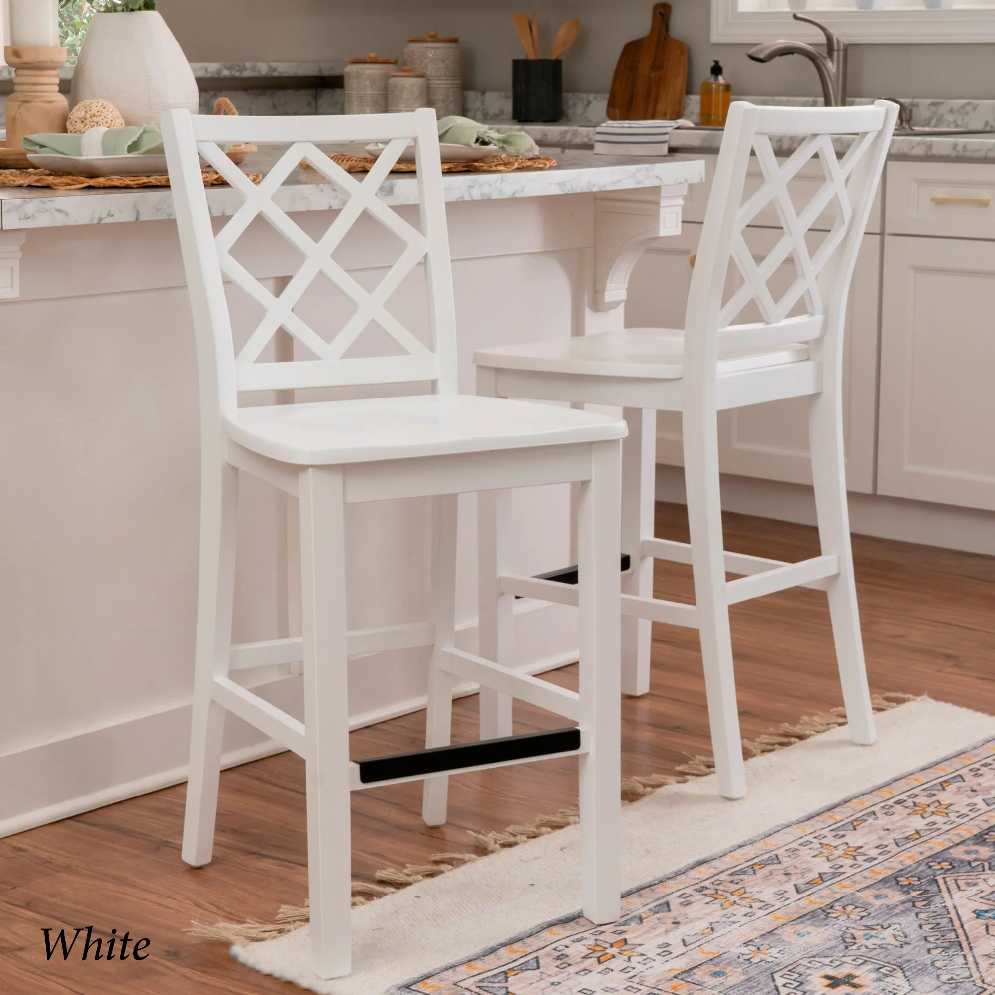Take a seat in style with the Martelle Counter Stool. Finished in a bold solid color hue, the wood stool features long sleek lines, an open latticework back, a smooth seat, and convenient footrests. The front footrest has a protective metal kick plate; White and Mint have a matte black accent; Dark Blue and Gray have a pewter-finished design. Maximum recommended weight is 350 lbs. Seat-to-floor height is 25.5". Perfect for kitchen islands, counters, or tables measuring 35"H to 39"H, the counter-height chair measures 18"Wx21.5"Dx40.5"H overall and weighs approx. 18 lbs.