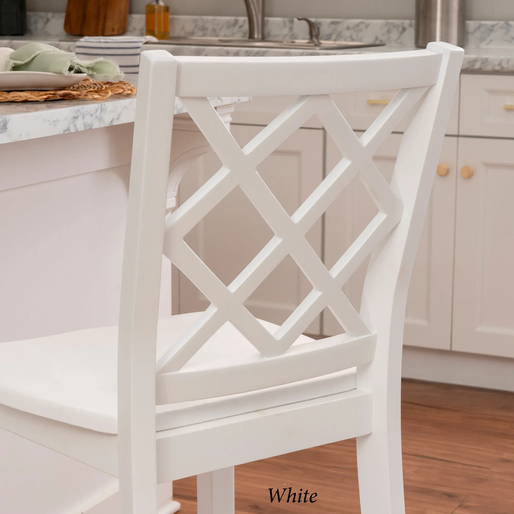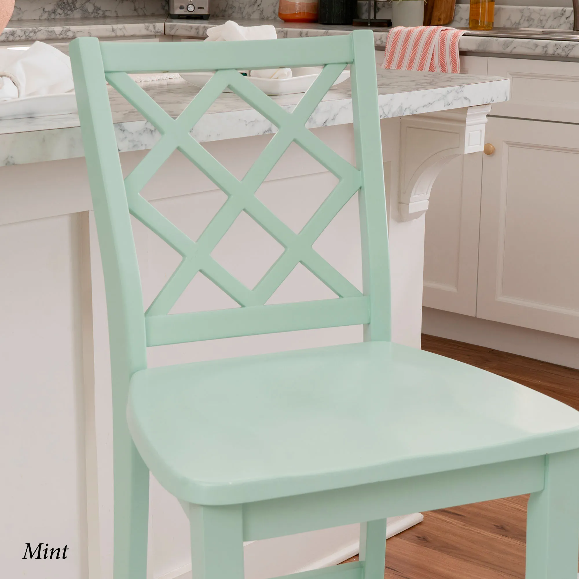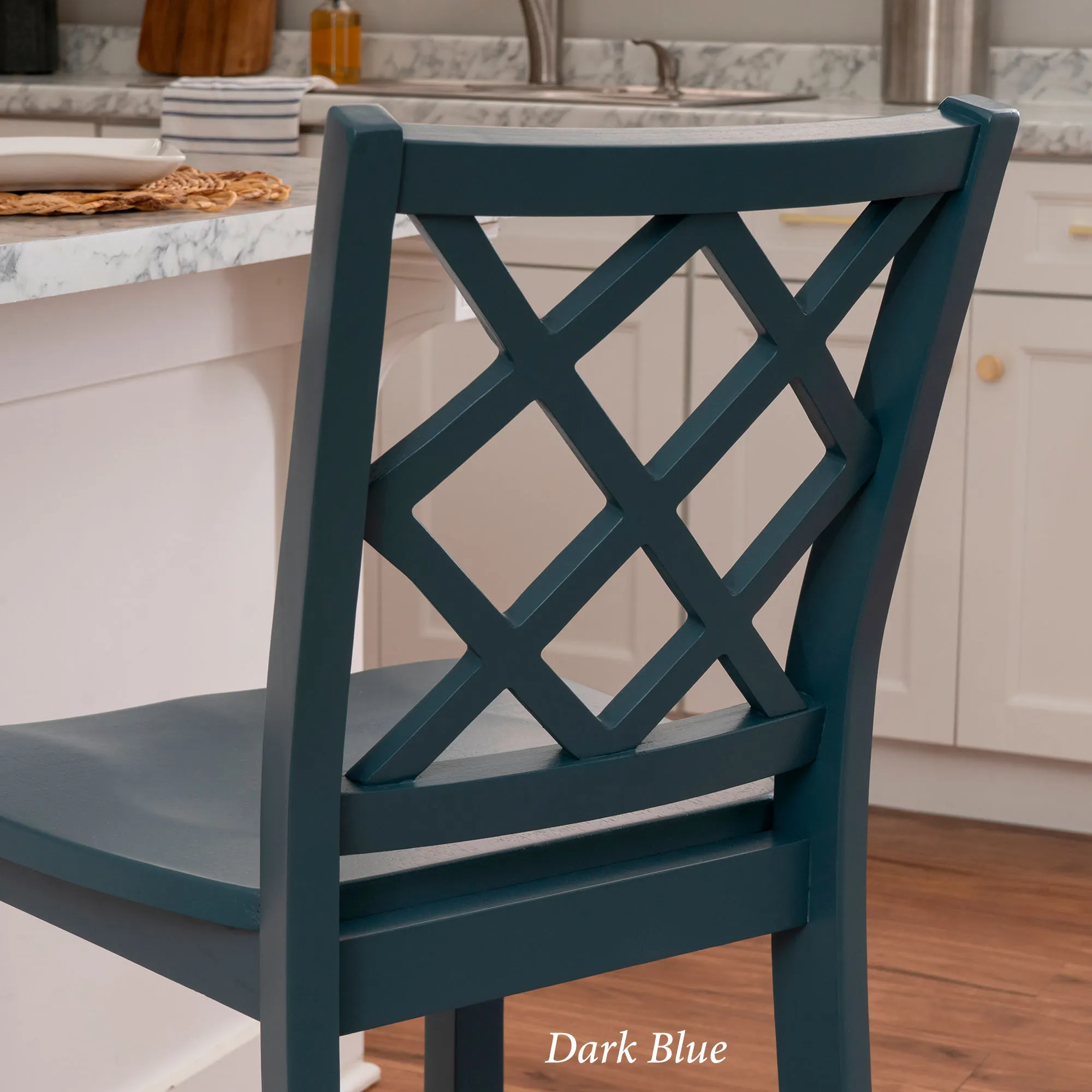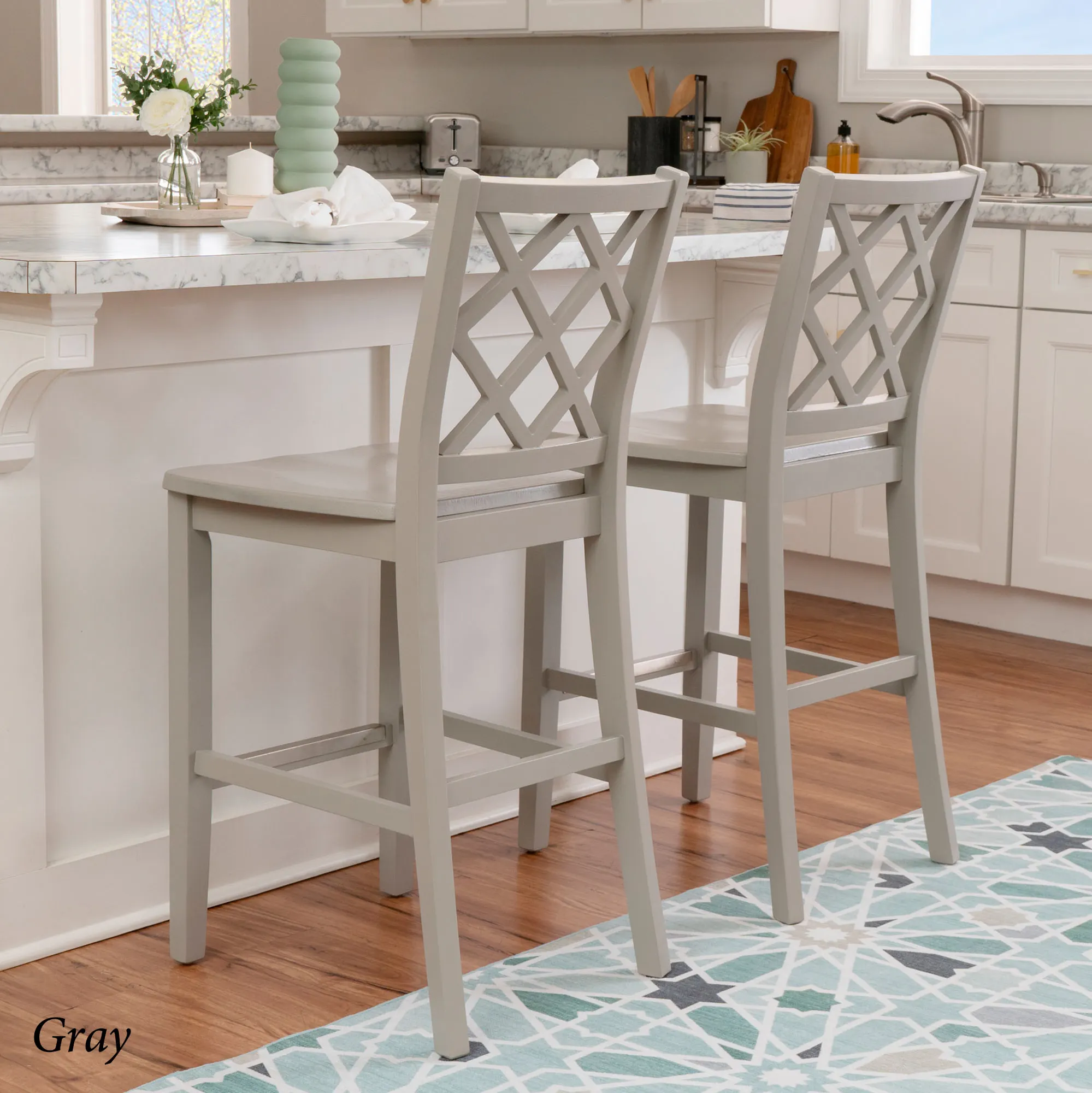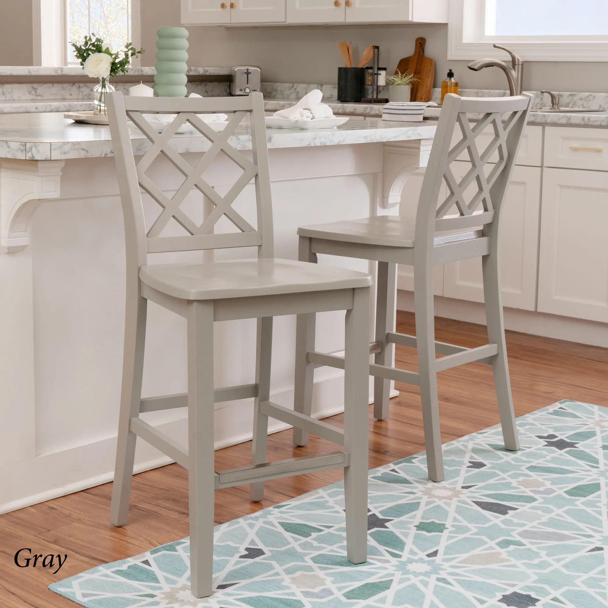 Take a seat in style with the Martelle Counter Stool. Finished in a bold solid color hue, the wood stool features long sleek lines, an open latticework back, a smooth seat, and convenient footrests. The front footrest has a protective metal kick plate; White and Mint have a matte black accent; Dark Blue and Gray have a pewter-finished design. Maximum recommended weight is 350 lbs. Seat-to-floor height is 25.5". Perfect for kitchen islands, counters, or tables measuring 35"H to 39"H, the counter-height chair measures 18"Wx21.5"Dx40.5"H overall and weighs approx. 18 lbs.