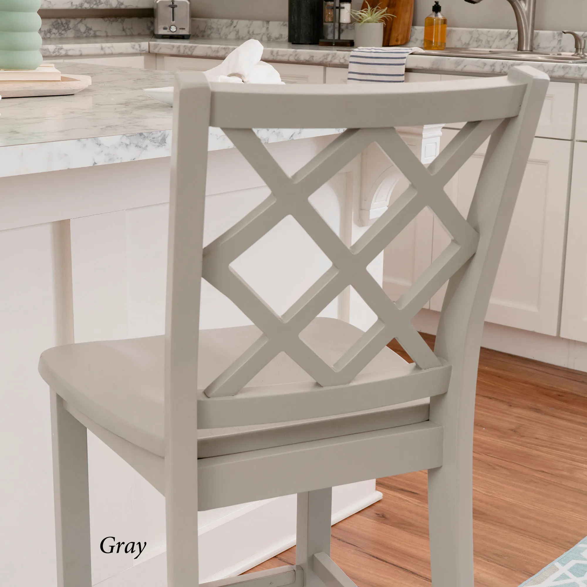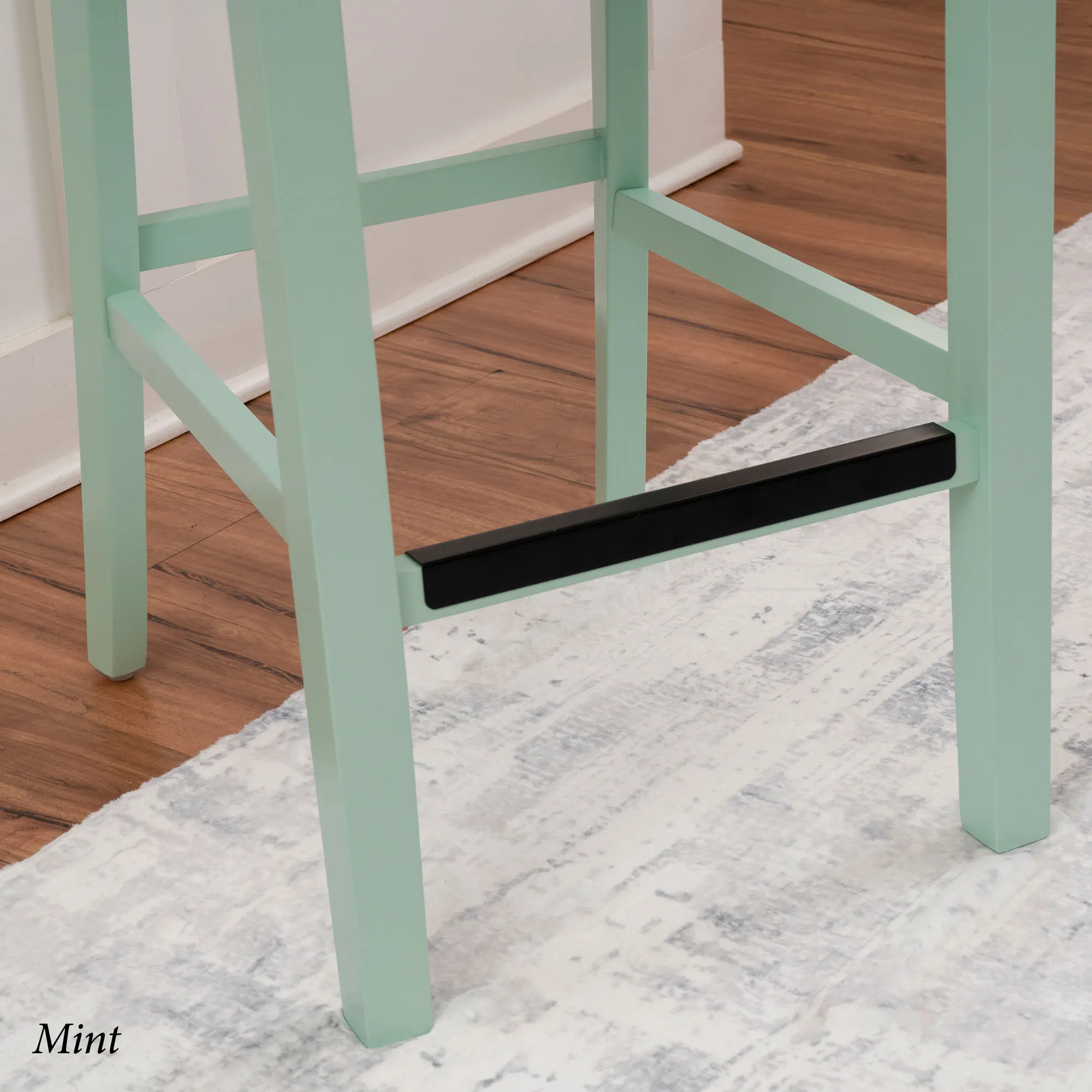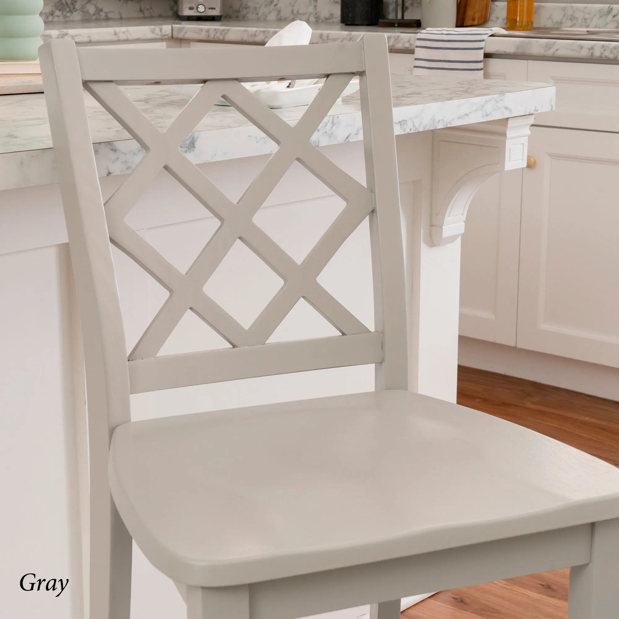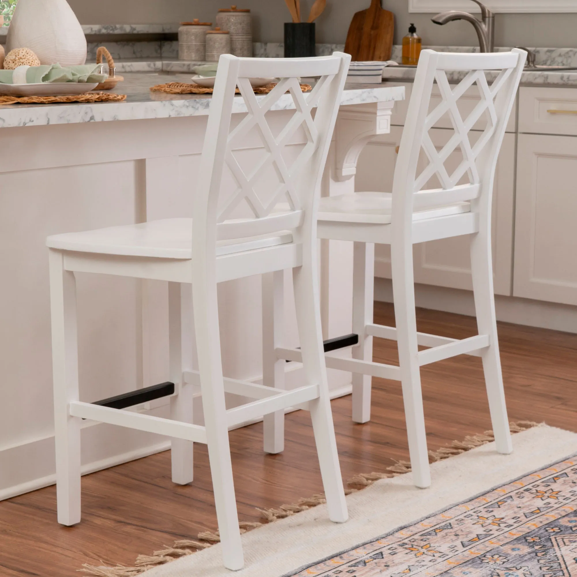 Take a seat in style with the Martelle Counter Stool. Finished in a bold solid color hue, the wood stool features long sleek lines, an open latticework back, a smooth seat, and convenient footrests. The front footrest has a protective metal kick plate; White and Mint have a matte black accent; Dark Blue and Gray have a pewter-finished design. Maximum recommended weight is 350 lbs. Seat-to-floor height is 25.5". Perfect for kitchen islands, counters, or tables measuring 35"H to 39"H, the counter-height chair measures 18"Wx21.5"Dx40.5"H overall and weighs approx. 18 lbs.
