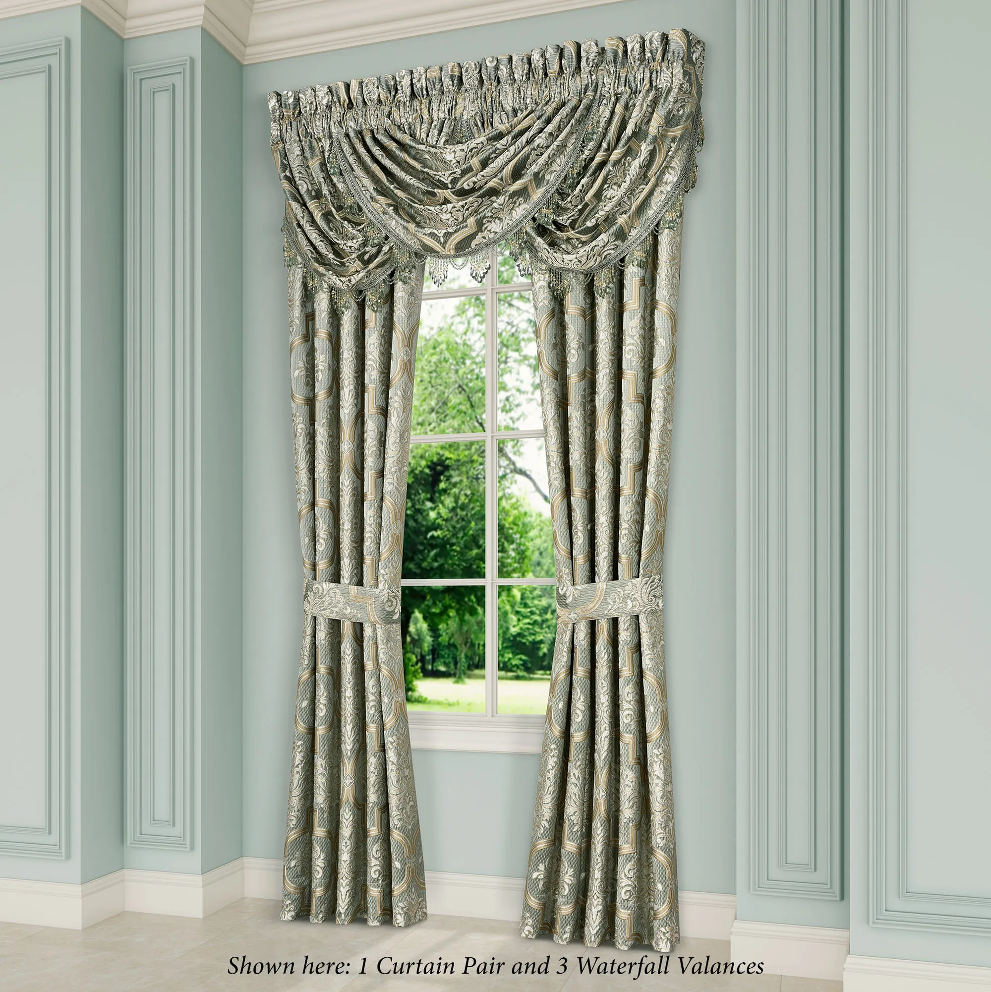 Window Treatment: Wide Curtain Pair has a 3" rod pocket and is 100"W; choose 84"L or 95"L. Each Waterfall Valance has a 3.25" rod pocket and is 43"Wx33"L. We recommend one valance for every 12"-15" of window width.