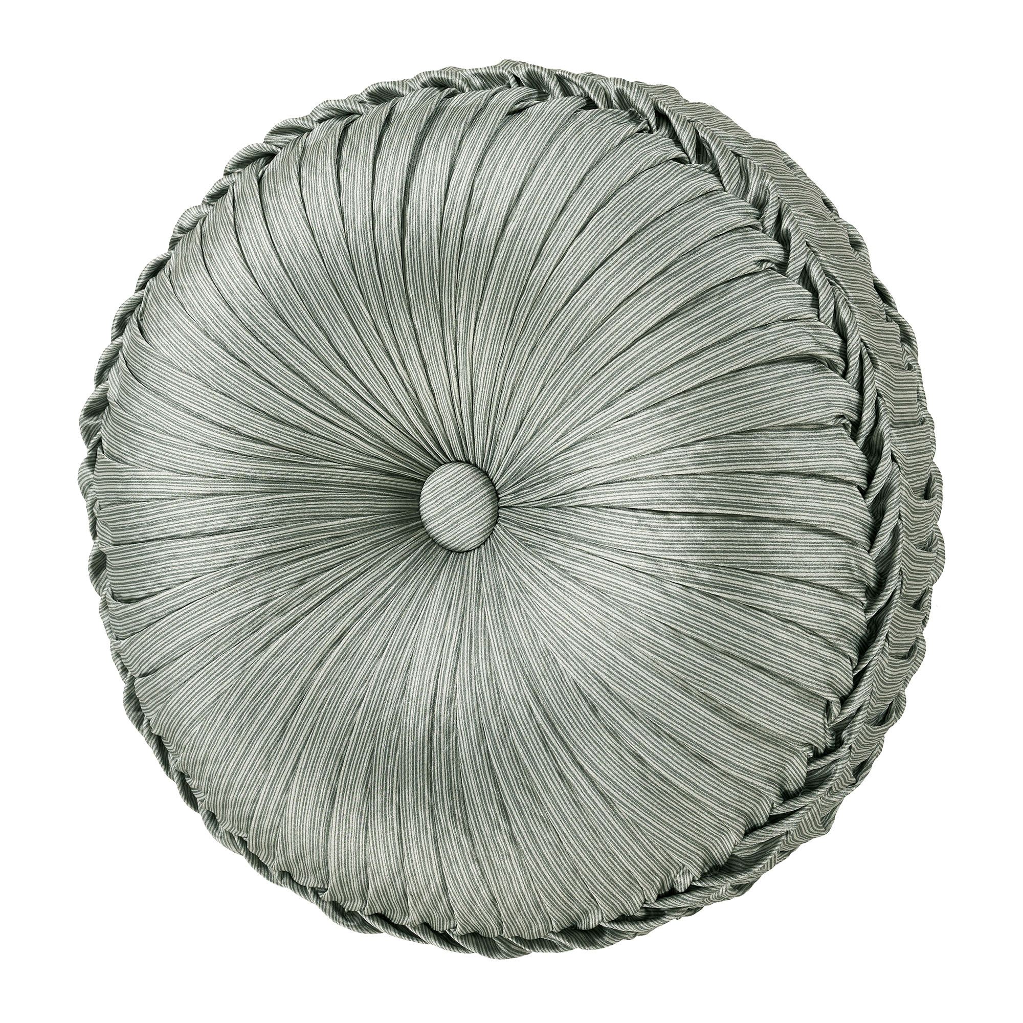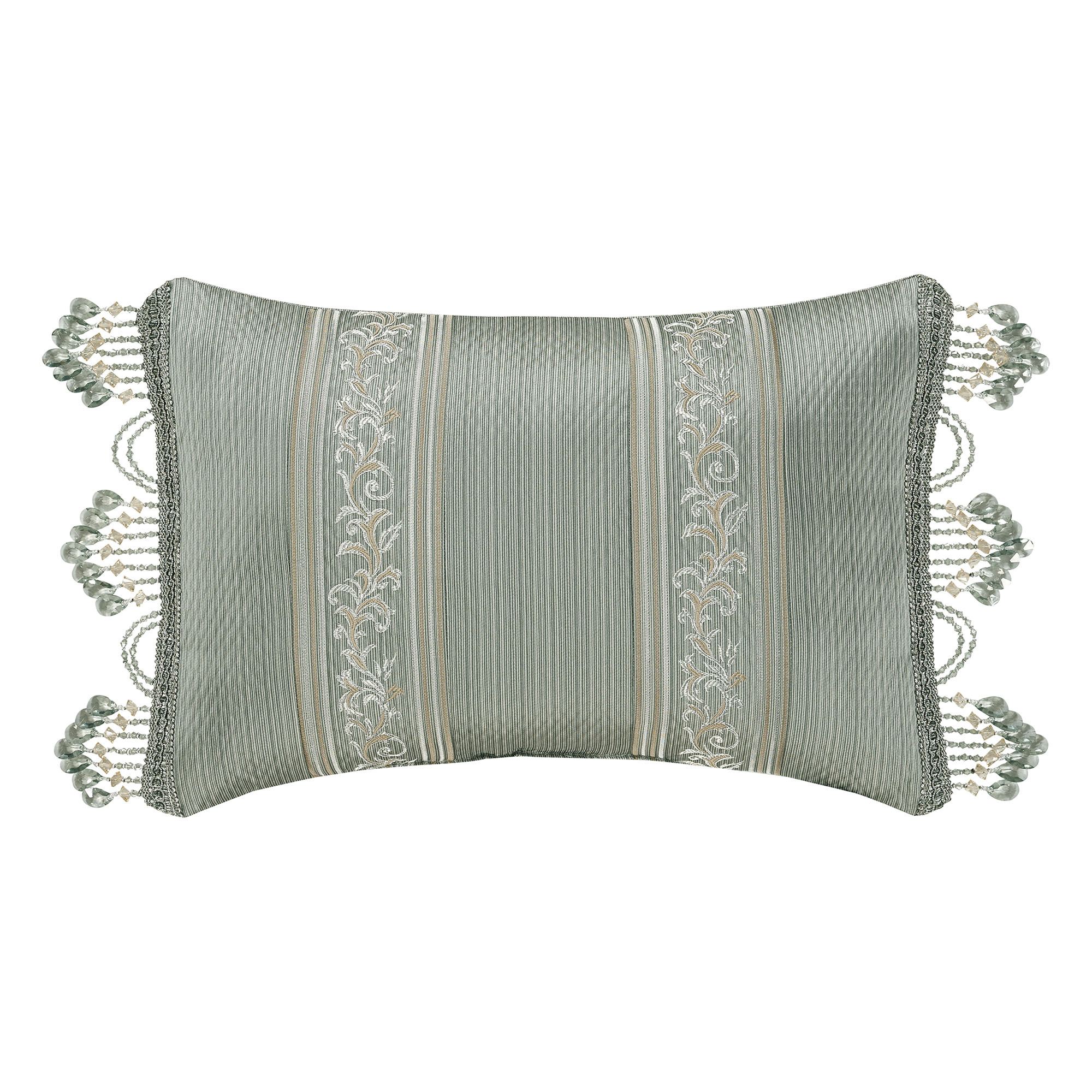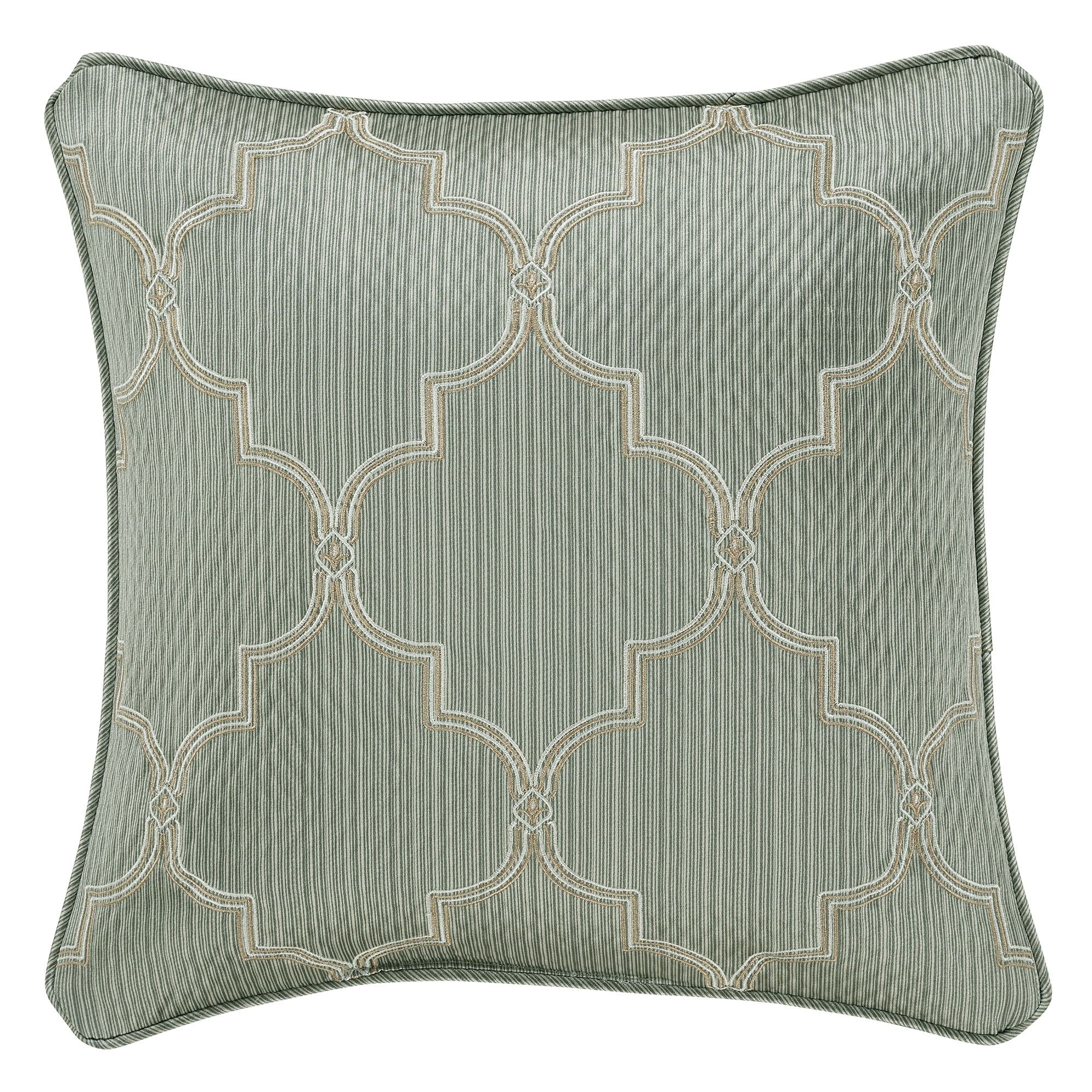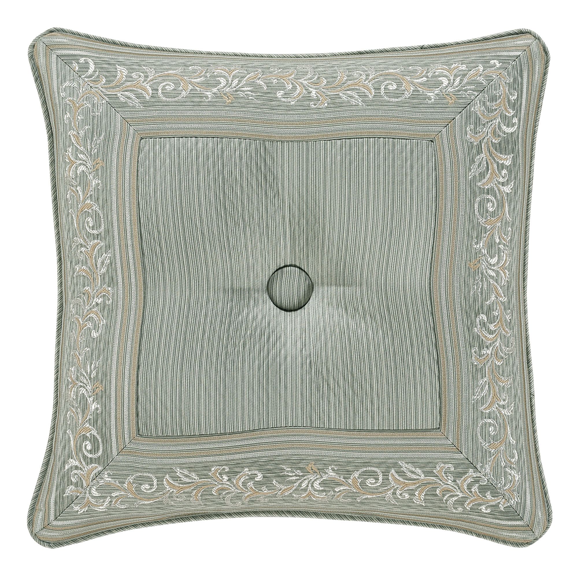 Pillows have misty sage diamond matelasse. Spot clean. Embroidered 18" Square has gold and ivory quatrefoil outlines and piped edges. Tufted 18" Square is pieced with a mitred scrolling leaf trim frame and piped edges. Piped 20" Square has quatrefoils and damask. Jumbo Rectangle has quatrefoils, damask, and piped edges. The Bead-Trim Rectangle has scrolling leaf trim bands and ends with gimp trim and accent beads. The reversible, handmade Round is pleated with a center button tuft and a 3" side gusset.