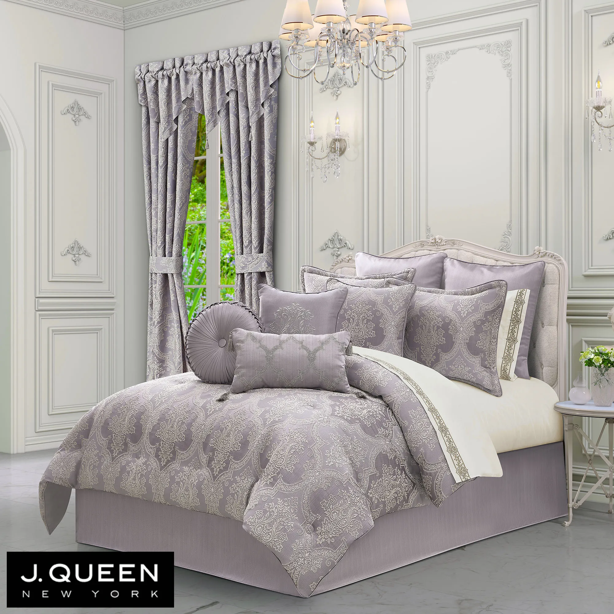 Transform your bedroom with the sophisticated charm of the Mary Damask Comforter Bedding from J. Queen New York. The polyester bedding features soft silver damask detailed with scrolling acanthus leaves and quatrefoil-shaped borders on a striated ground in shades of lavender. Oversized comforter is backed in lavender. Bedding fill is polyester. Dry clean only. Imported.