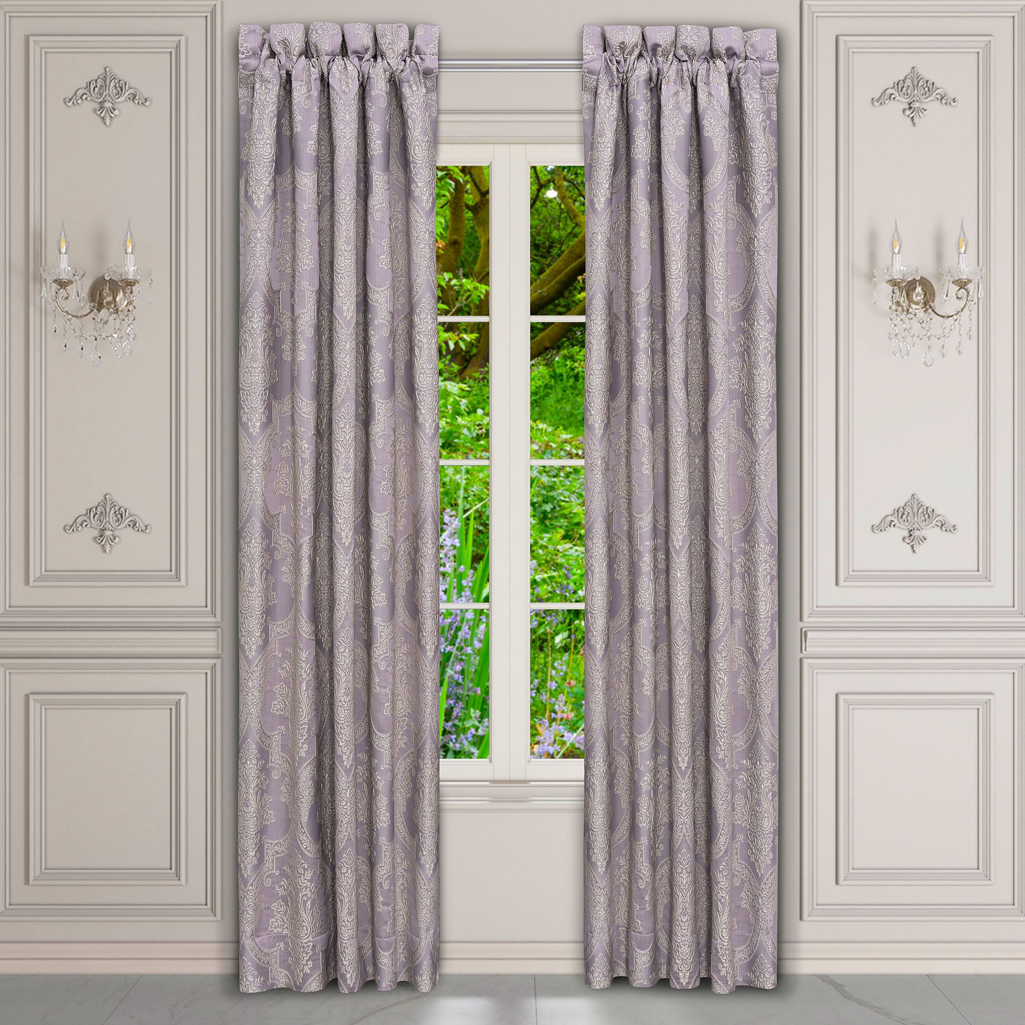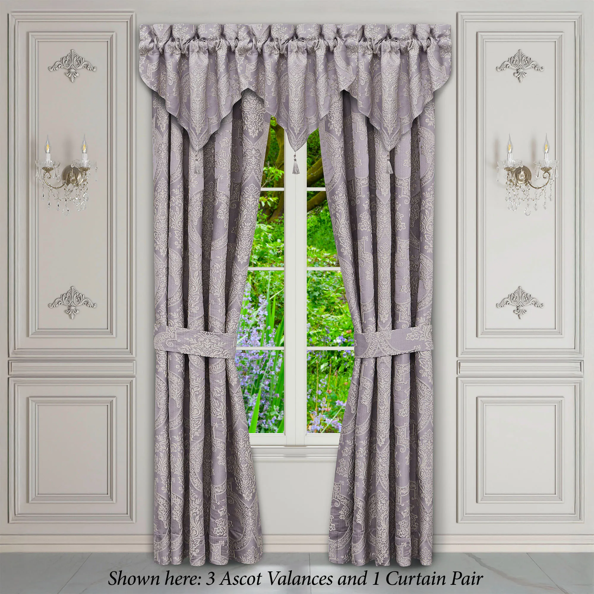 Lined Window Treatments have damask. Wide Curtain Pair has tailored edges and a 3" rod pocket. Tiebacks are included. Curtains are available in two lengths. Each Ascot Valance has a tassel accent and a 3.25" rod pocket.
