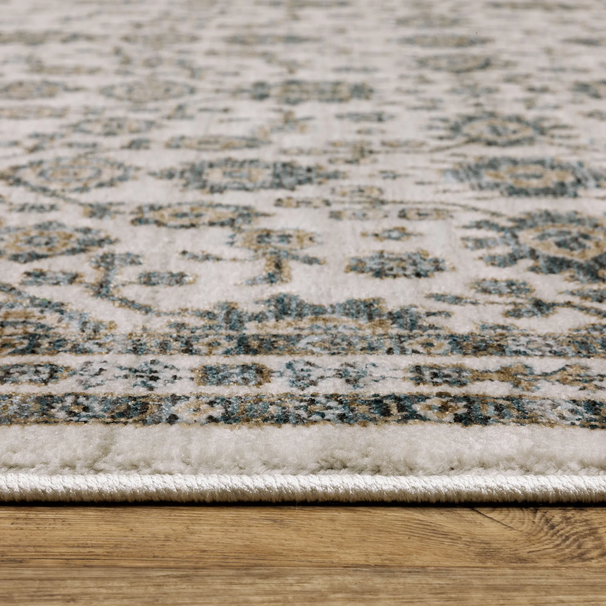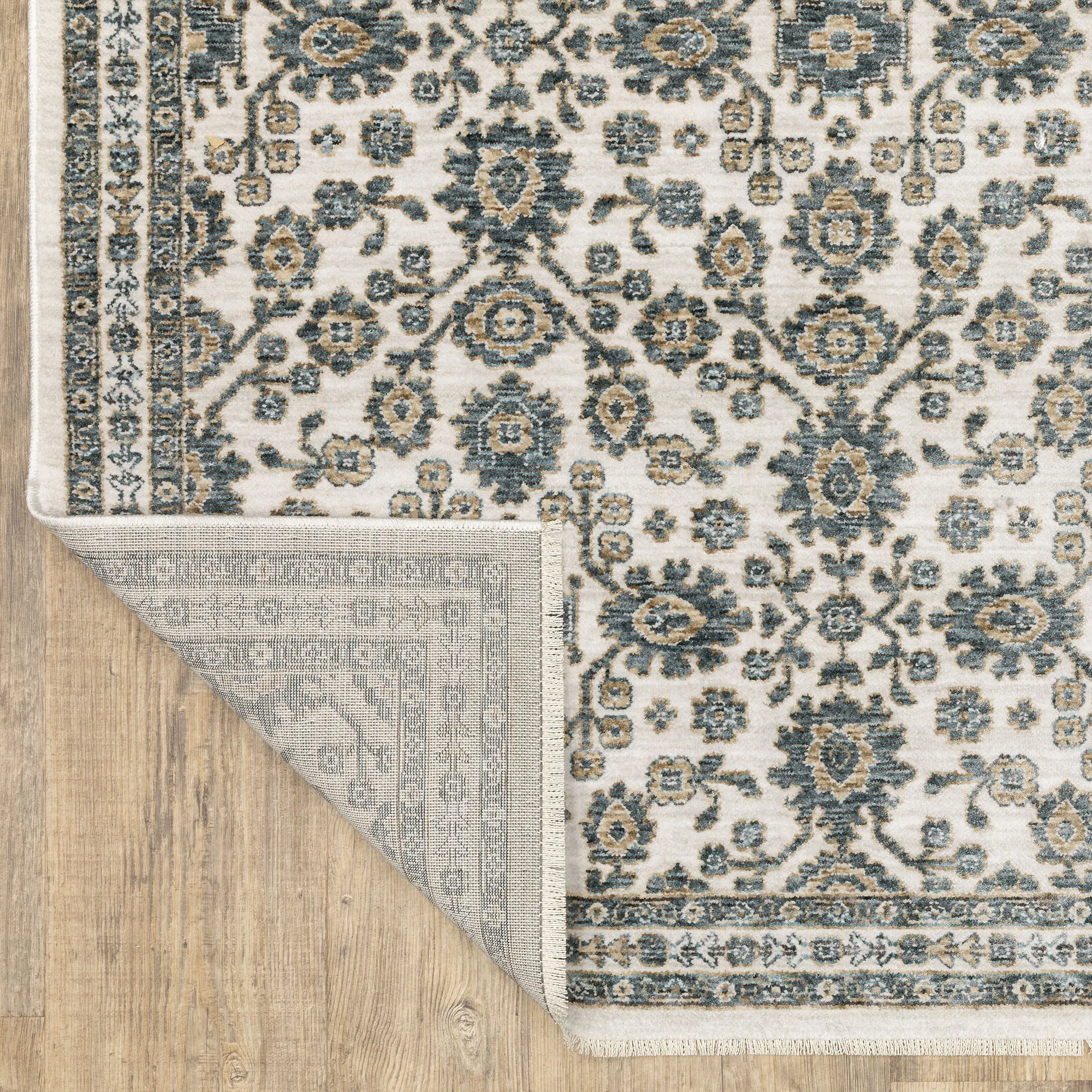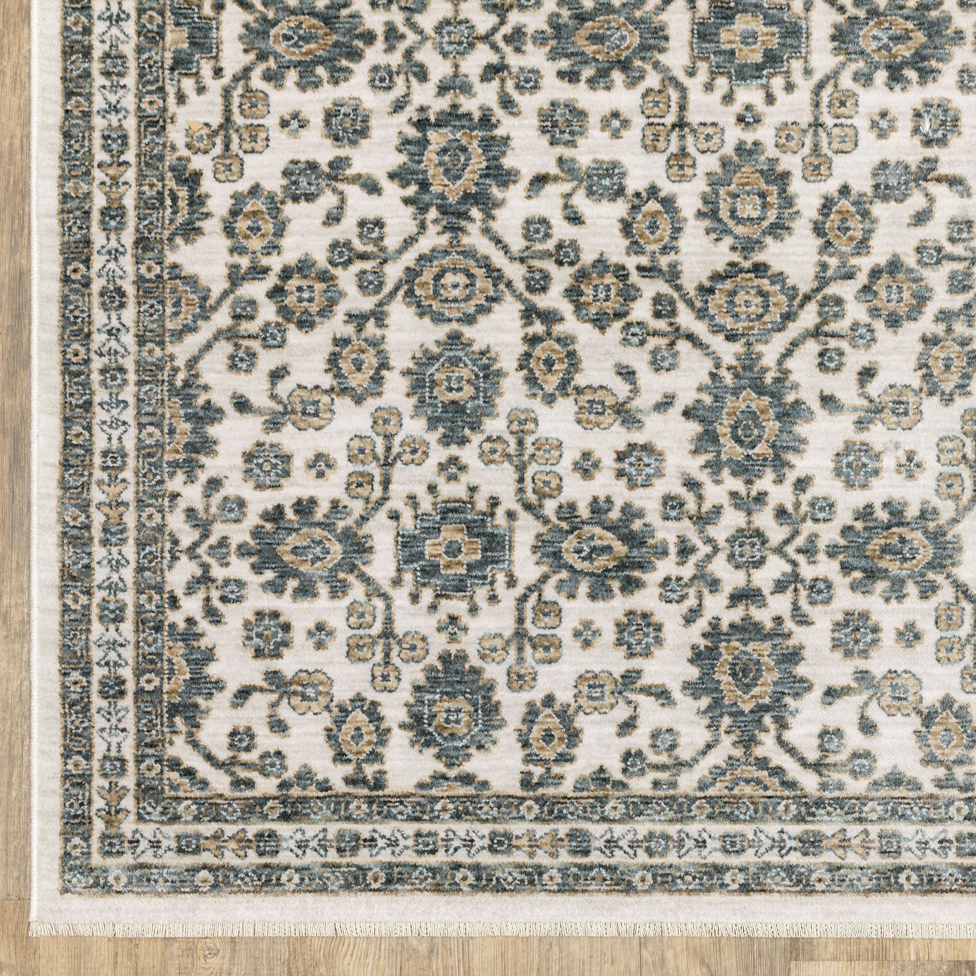 The ornate floral design on the Marynae Rug decorates with splendid style. Power-loomed area rug, .32" thick, is made with soft, space-dyed, and textural polyester yarns. The charming rug features a decorative motif and has .5"L ivory fringe on the length ends. Colors include ivory, off-white, parchment, dark and light blue, gray, and copper. Backing is woven polyester. We recommend professional cleaning by a rug cleaner. Imported.