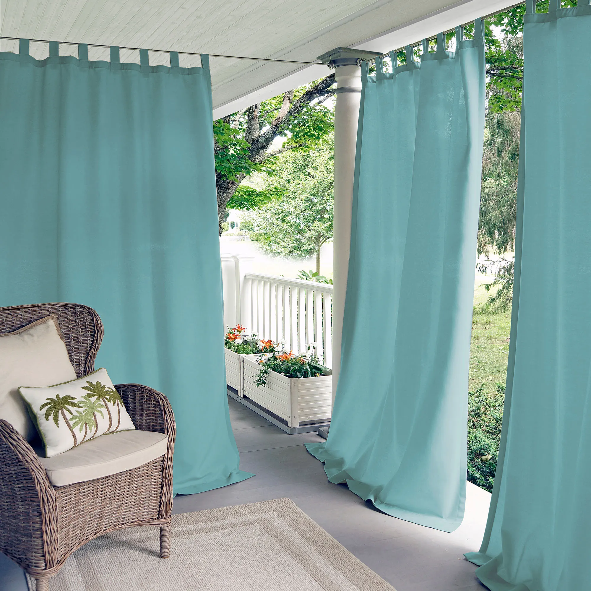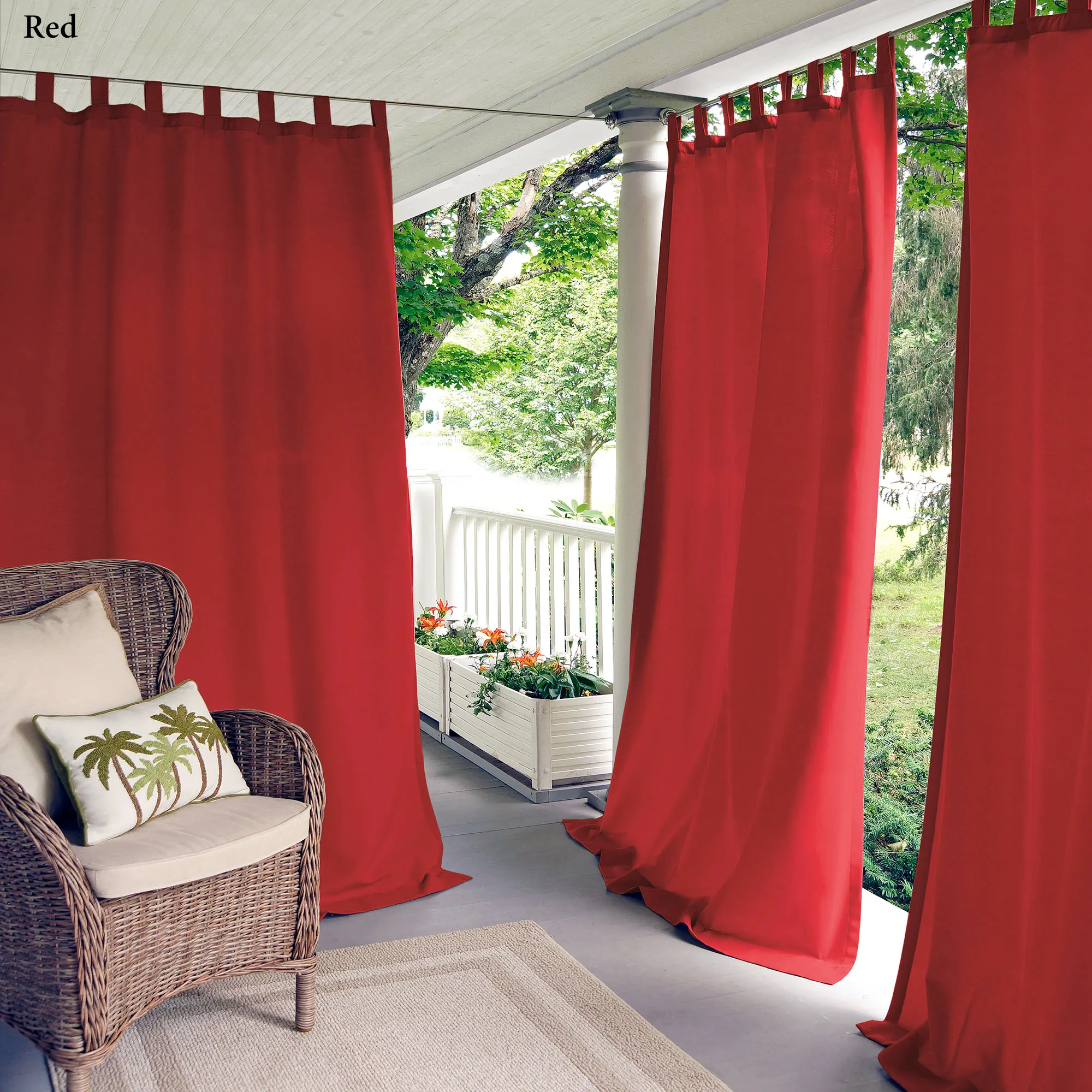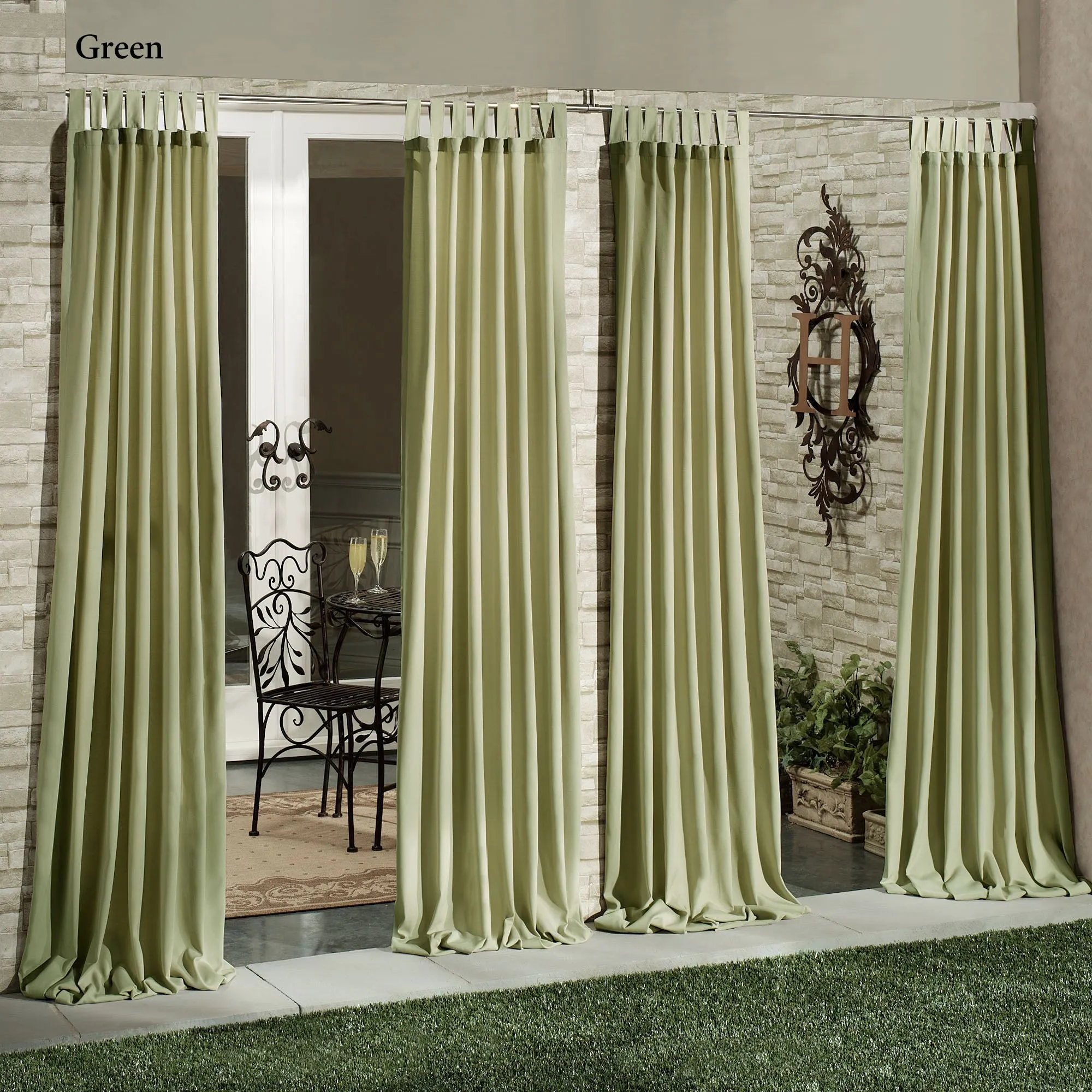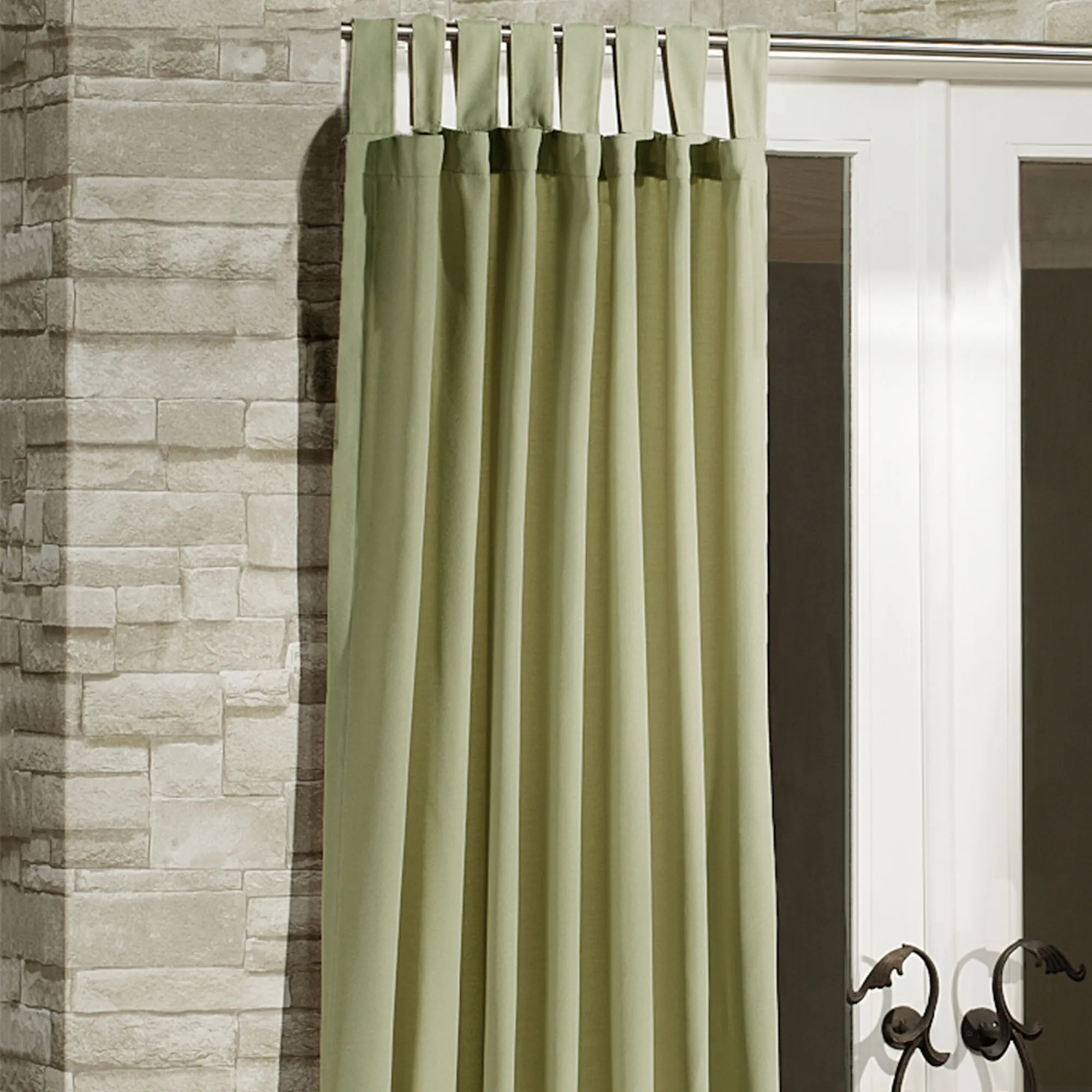The solid color Matine Indoor/Outdoor Tab-Top Curtain Panel will decorate your porch, patio, gazebo, or pergola with flair. Polyester curtain panel has 4.5"L hook-and-loop tabs, has UV protection of 50+, is stain- and water-repellent, and is fade-resistant. Panels are sold individually; each is 52"W. Machine wash. Imported.