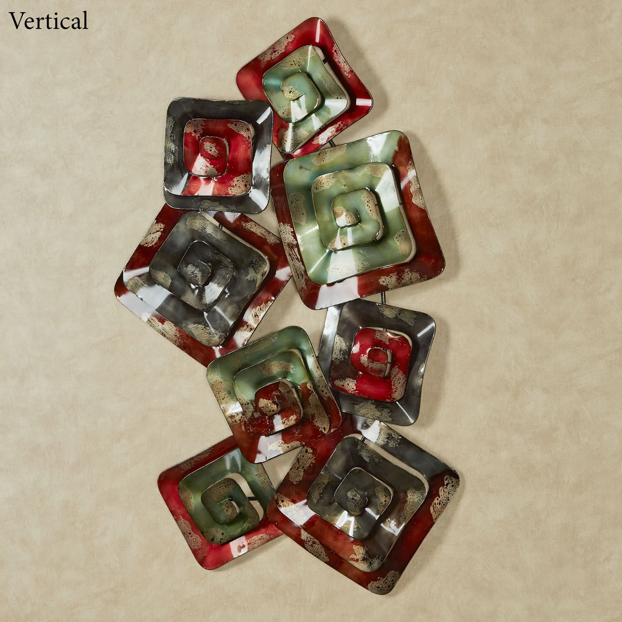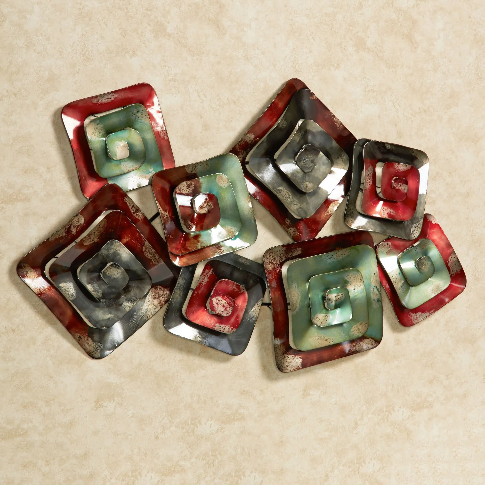 The contemporary Mattison Metal Wall Sculpture has a fun, abstract design that gives your wall an artistic appeal. Crafted from metal, this wall sculpture features a cluster of squares, each with a spiral, dimensional design and finished with dyed greens, browns, reds, and charcoal. Wall sculpture measures 46"x28".